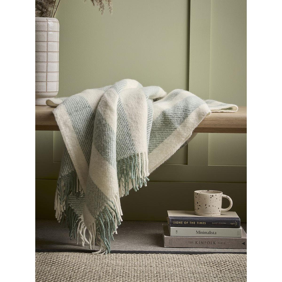 Throw onto any sofa, bench, or bed and create an uber comfy and warming place to rest. Crafted from wool, this throw is supersoft with a gorgeous eucalyptus green stripe that adds a bright energy to your home, without being overwhelming in your space. Finished with a relaxed, fringed edge, this throw is a welcome addition to our Scandi trend.
