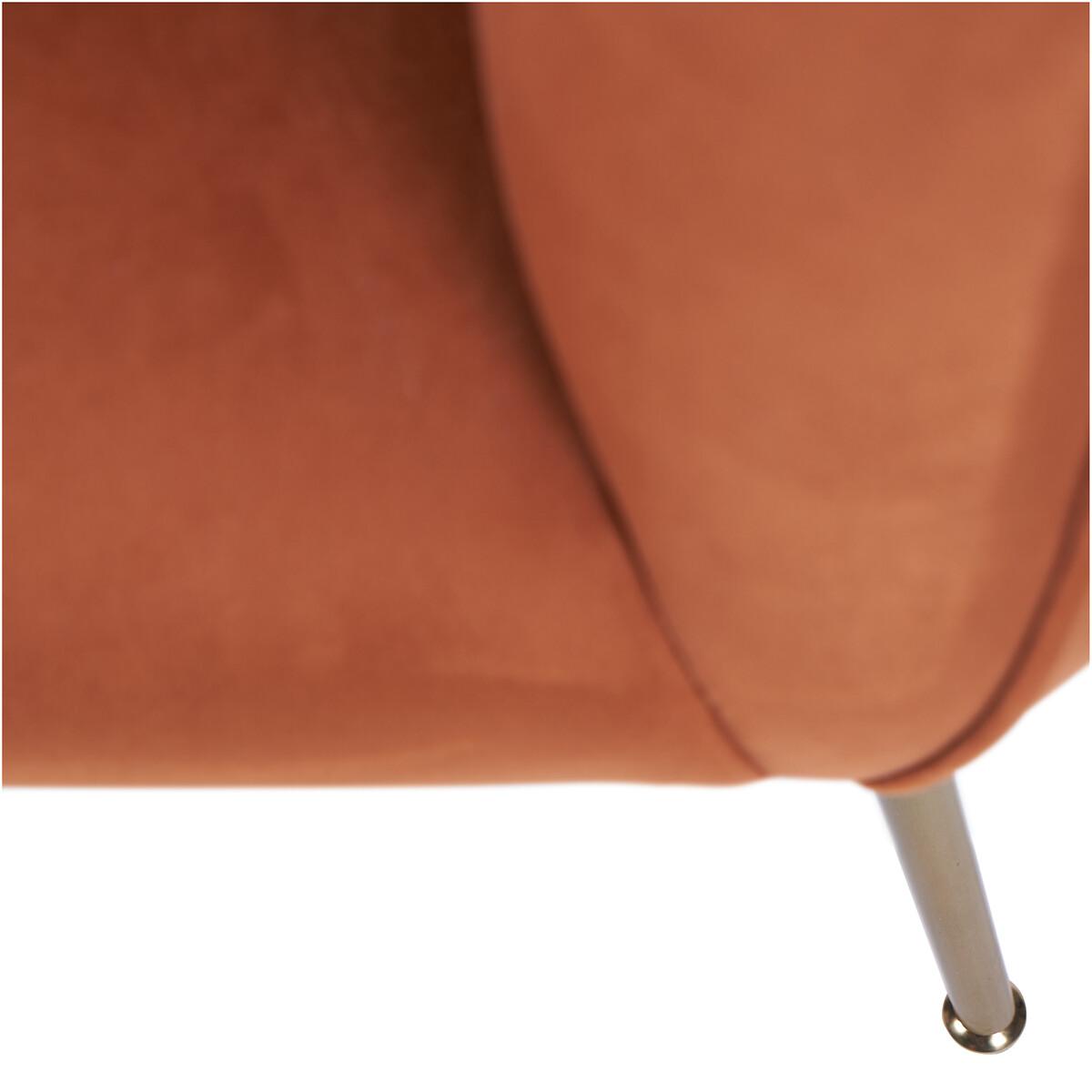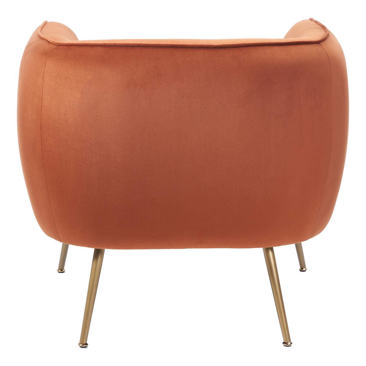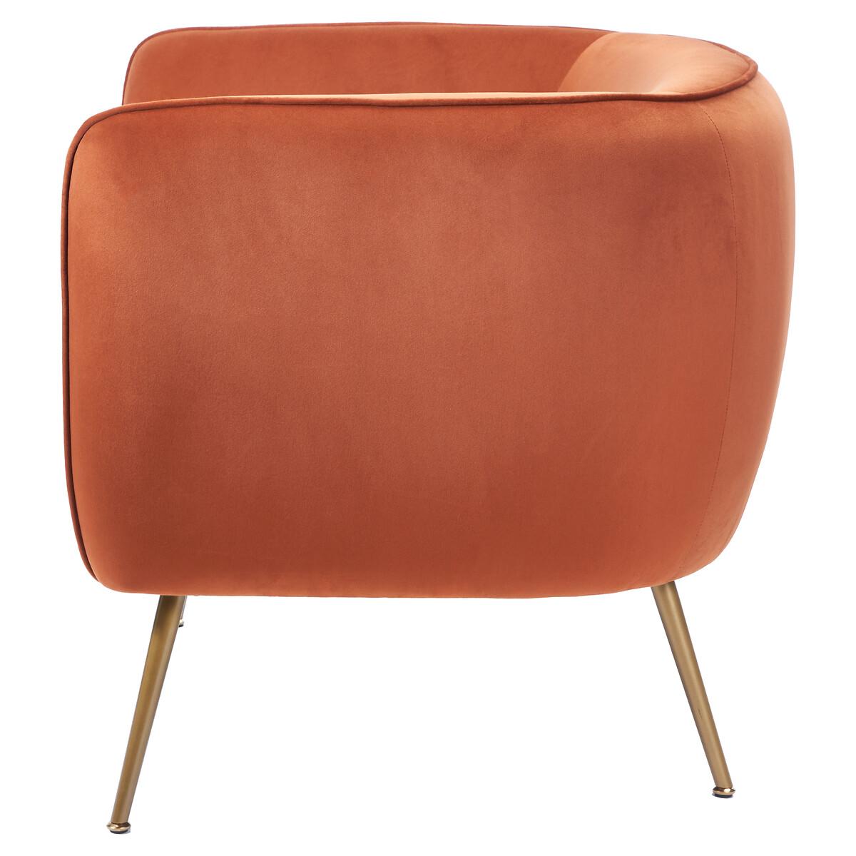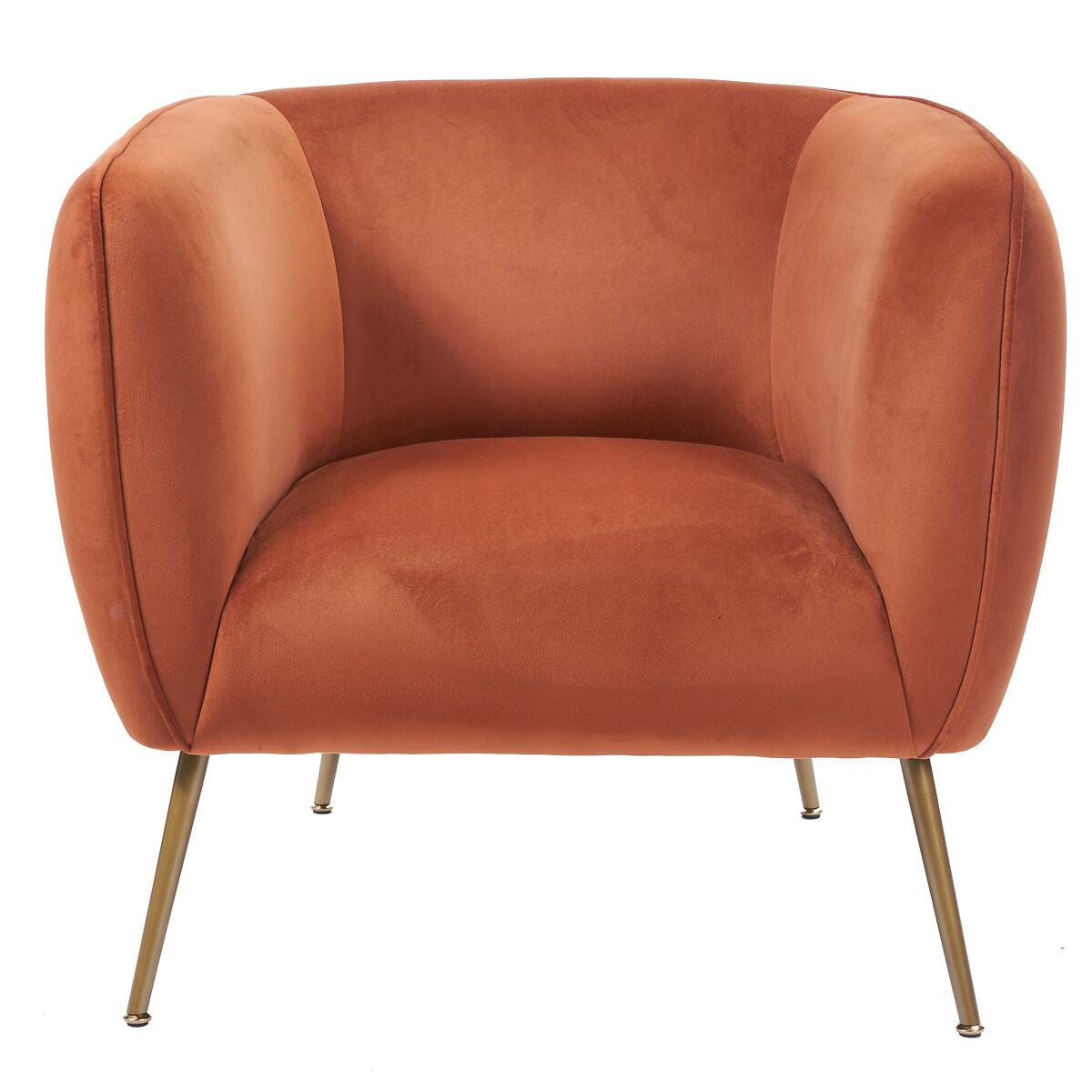 The Lucca Tobacco Velvet Chair with Gold Legs adds a sophisticated style and a pop of colour to any room. The perfect compromise between practicality and style, it can be used as extra seating around the coffee table or as feature seating in the bedroom. Product details • Piped edging • Curved back • Low deep seat • Matte gold splayed metal legs • Ergonomic design • Foot protection pads included • No assembly required • Wipe clean with a soft dry cloth. Product Composition - 20% Iron, 45% Pine wood, 20% Polyester, 15% Sponge Product Dimensions - 71 cm x 79 cm x 71 cm , Weight - 12.5 KGPackage Dimensions - 80 cm x 72 cm x 52 cm, Weight 15 kg. Please note: this product cannot be be delivered to all Offshore Islands Northern Ireland or Republic of Ireland. This product will be dispatched by one of our trusted suppliers. You’ll be contacted by their selected courier about your delivery. PACIF01