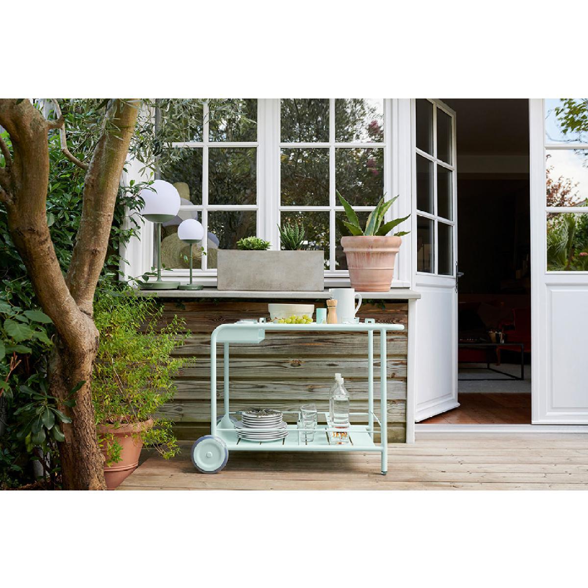 """Fermob asked designer Frédéric Sofia to reinterpret the mythical SENAT armchair from the Jardin du LUXEMBOURG via a range of aluminium furniture with the same name. The result is a fabulous collection for outdoors which aspires to the good life: """"By designing furniture to go with the Jardin du Luxembourg armchair, I sought subtle lines which respect the so-French style of the 20s and invite people to discover the simple pleasures of time passed in the secret of their own garden"""". We love this serving trolley - with removable tabletop. Made in Design is offering it in a variety of jolly, vibrant colours. """.