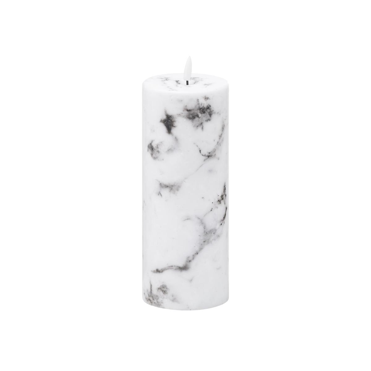 This 3 x 8 real wax battery operated pillar wick candle is perfect for decorating your home or adding the finishing flourish to a venue. The marble finish to this candle will look fantastic in contemporary styled interiors and adds a unique quality to each piece. Candles are the simplest way to create a warm atmosphere. The amber LED flame flickers gently to imitate the effect of a real flame but without the messy wax, risk of fire. This candle requires 2 x AA batteries (included) and features a simple switch on the base for oneoff and a timer option which will turn your candle off after 6 hours.