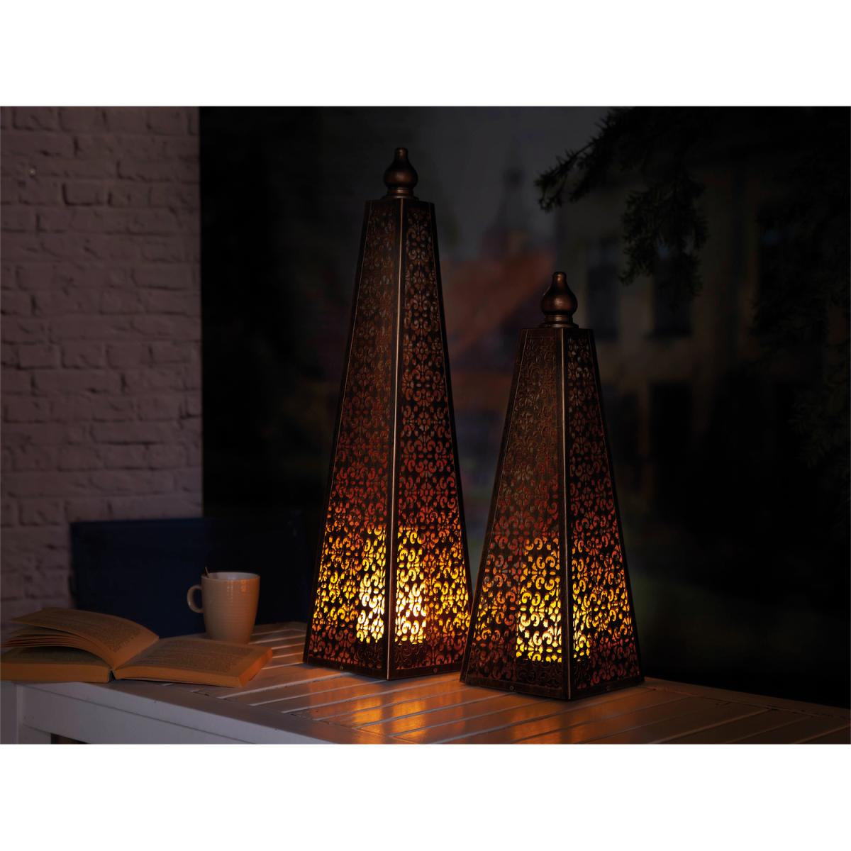 Decorate your outdoor living space by placing these beautiful, decorative battery powered Moroccan style pyramid lamps in your garden, they will enhance the look and feel of any garden. The lamps are freestanding socan be placedanywhere in your gardenand will provide a gentle ambient light to illuminate their surroundings. This decorativelamp can be turned on and off using the onoff switch or the supplied handy remote control. There is also a timer option, in this mode thelamp will light for 4 or 6 hours and then shuts off until the same time the next day. Suitable for outdoor or indoor use.