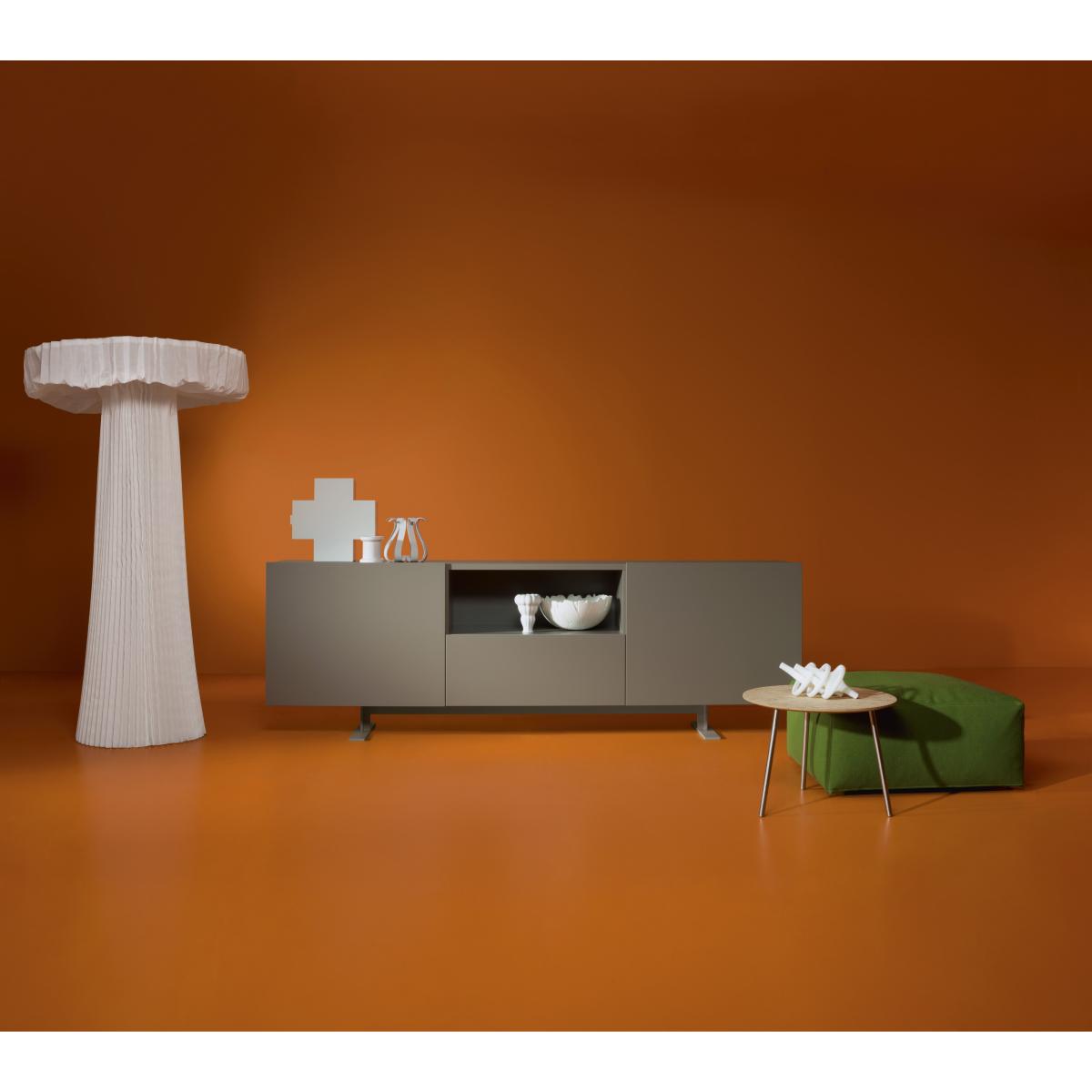 Designed by Guilio Cappellini, the Luxor collection has won the Wallpaper Design Award for "Best Storage Element". Mixing wood with metal, even the smallest details on this industrial-style sideboard have been attentively worked, such as the high-quality hinges designed specifically for this collection. The MDF structure is doted with two sliding doors made from aluminium-coated poplar laminate. The steel base is varnished with a colour matching the furniture unit. This Luxor sideboard has two side doors. The central section features an open niche and a drawer. The side compartments are fitted with a shelf. The Luxor collection is a versatile storage solution, ideal for use in the living room or office. It boasts numerous models with drawers, shelves, folding or sliding doors….