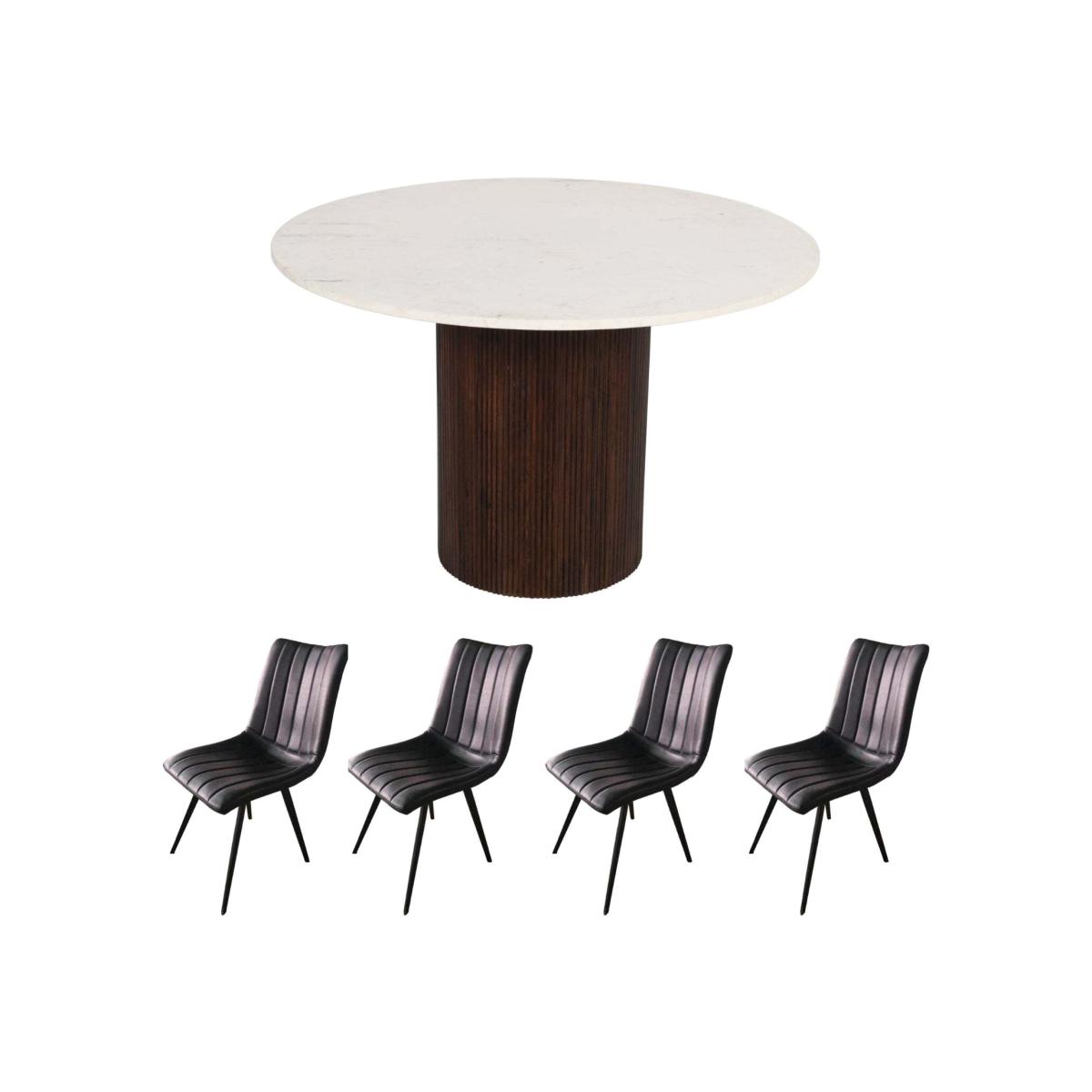 Luxor's Mango Wood Round Dining Table is a stylish addition to any space. Handcrafted for quality, it features a stunning marble top, lacquered coating for protection, and comes with limited assembly. Measures 120x120x76 CM (LxDx. H), offering plenty of room for enjoying meals and entertaining. The round shape invites conversation and the wood and lacquer make it sturdy and long-lasting. Chairs boast a modern design with vegan leather seats for easy cleaning and a vertical stitched accent for subtle detail. An eye-catching set for delightful dining every day!