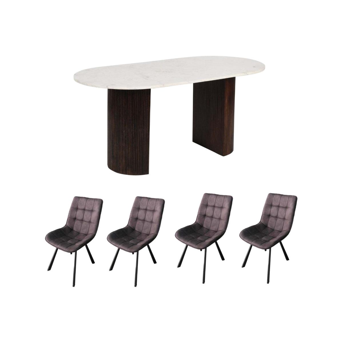 This Luxor Mango Wood Dining Table set is an exquisite addition to any home. Expertly handcrafted with high-quality mango wood, this modern-style table features a protective lacquer coating and a smooth marble top. The 170x85x76 CM (LxDx. H) dimensions make it great for dining rooms and kitchens. Quick and easy assembly using the included hardware and instructions. With a tough construction and lacquered finish, this table is built to last and is perfect for hosting family dinners, entertaining guests, or serving as a workspace. The 4 chairs are Industrial-style with steel tapered legs and black powder coating, plus Light Brown PU leather upholstered seats for comfort.