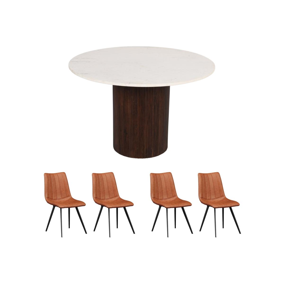 The Luxor Mango Wood Dining Table Round set is the perfect addition to any dining space. Crafted with hand-selected mango wood and a beautiful marble top, it's finished with lacquered coating for a sophisticated look and protection from scratches and stains. Measuring 120x120x76 CM (LxDx. H), it's easy to set up with limited assembly and provides plenty of room for dining or entertaining. Its stylish round shape encourages conversation and the wood marble top ensure it'll stand the test of time. Along with this table, comes 4 stunning dining chairs. Featuring luxe vertical accent stitching, they have soft vegan leather seats that are easy to clean and provide maximum comfort.