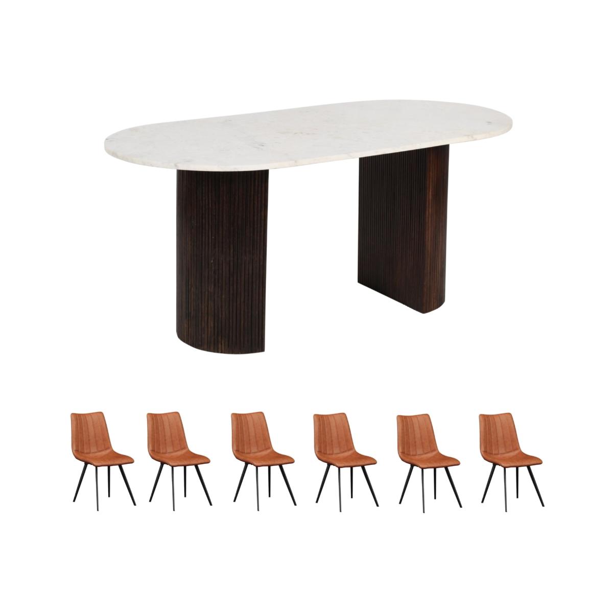 This Luxor Mango Wood Dining Table Set is stunning. It's made from high-quality mango wood and features a marble top with a lacquered finish. Measuring 170x85x76 CM, this table is the perfect fit for any dining room or kitchen. Assembly is simple with the included hardware and instructions. Use it for family meals, entertaining, or as a workspace - its versatility knows no bounds. Plus, the marble top offers a strong surface and the lacquered coating keeps it safe from scratches and stains. This Luxor Dining Table is sure to be a standout piece in any home, providing style, utility, and lasting durability. The chairs complete the set with a contemporary look, featuring vertical accent stitching for subtle detail and a soft vegan leather seat for optimal comfort.