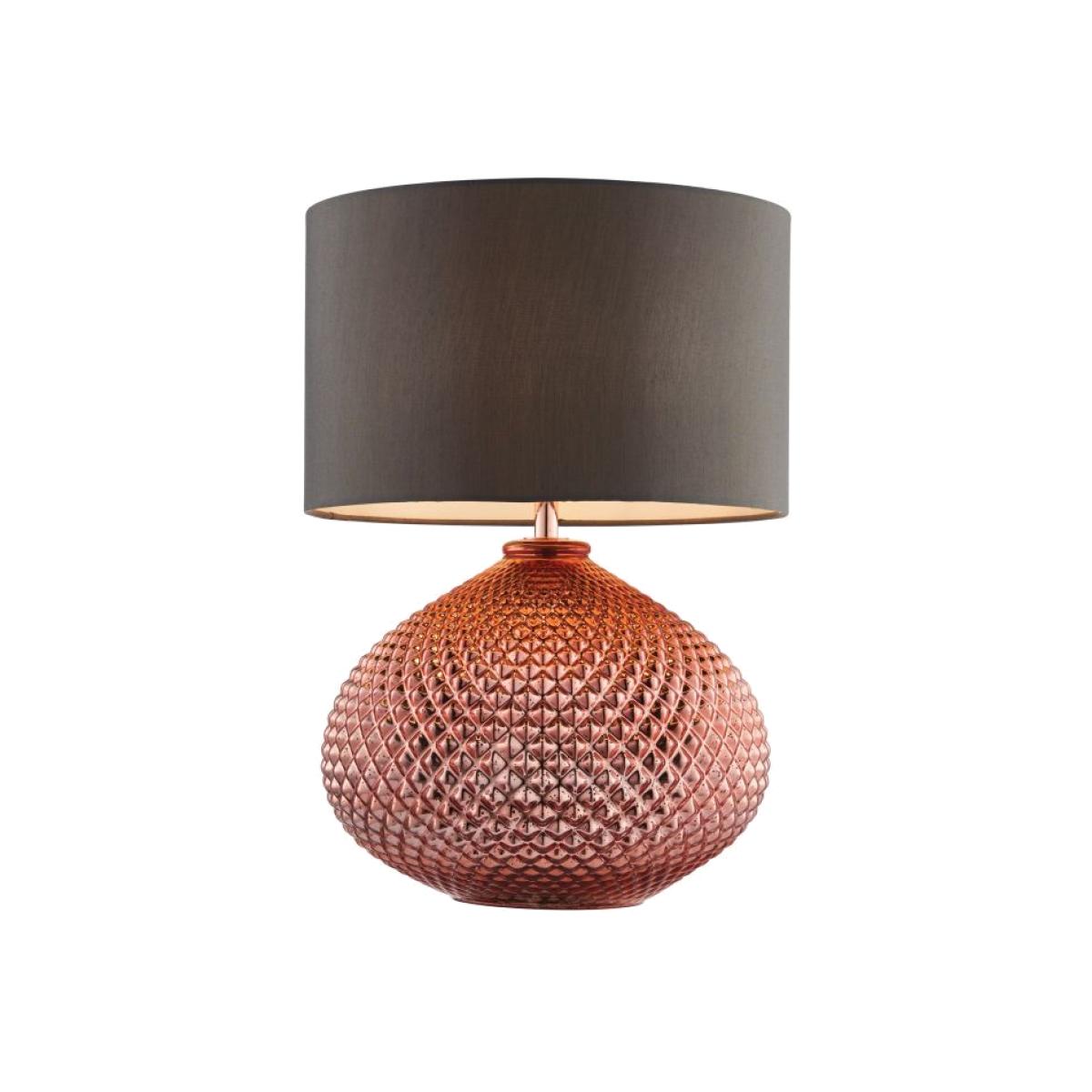 Highly decorative copper plated ‘mercury’ glass base table light with elegant grey faux silk shade. Clear flex with in-line switch, perfect for use with LED lamps. Colour: Copper. Lamp Holder Type: E27. Bulb Type: GLS. Maximum Bulb Wattage: 60. Bulb Included: No. Number of Bulbs: 1.