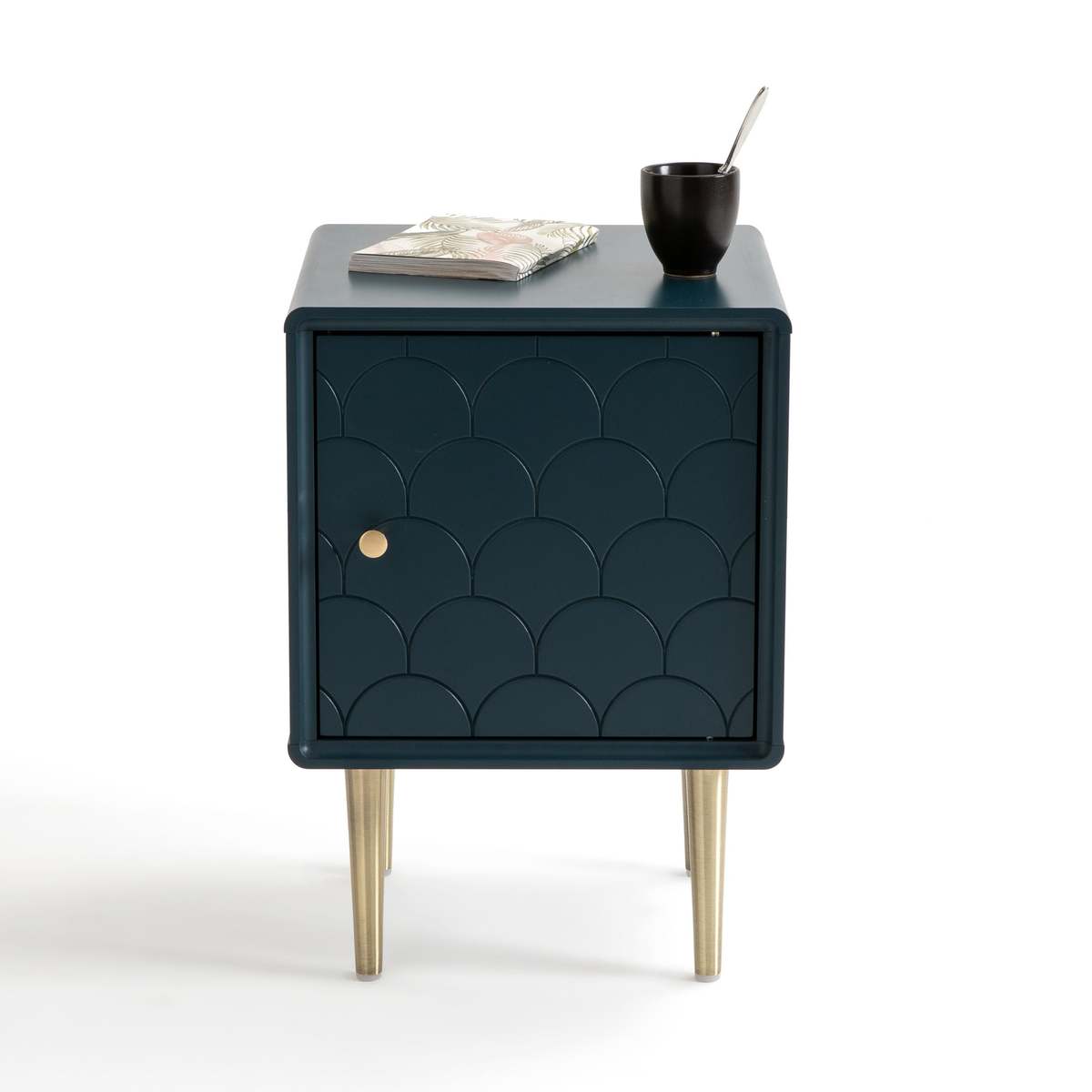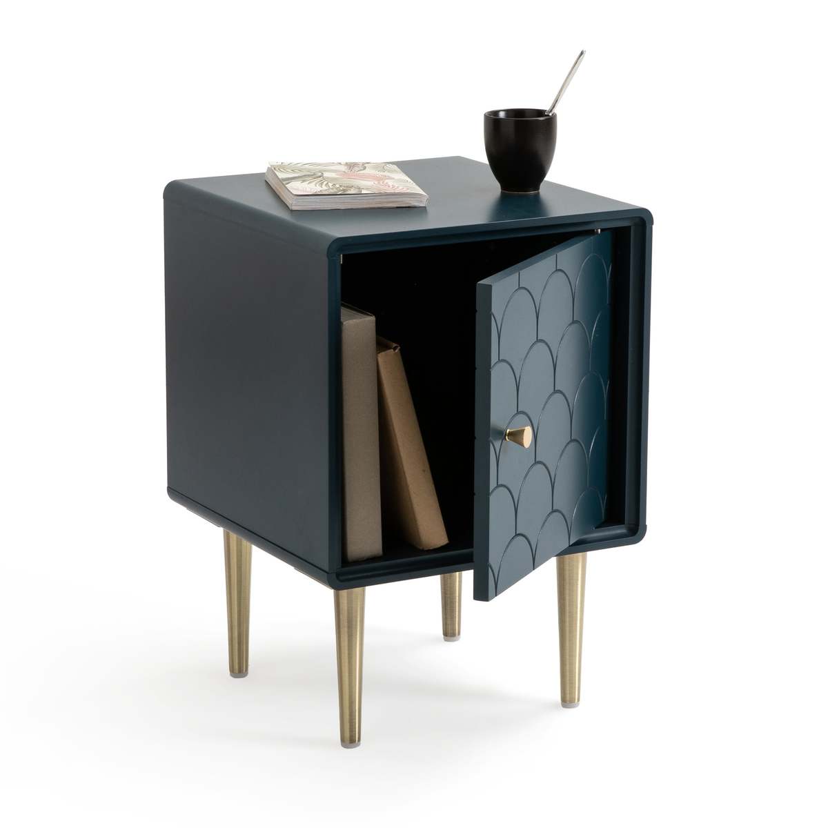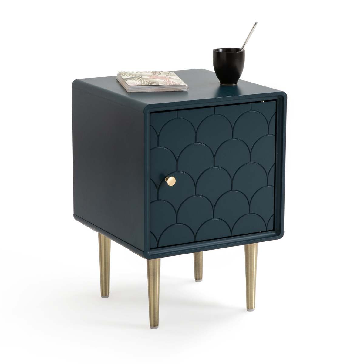 I love this bedside table because of its sleek design and clever reversible door, which adds versatility to your space. Its rich colour and subtle scalloped pattern give it a touch of elegance, making it a real statement piece. It works well in both modern and retro-inspired interiors, especially those with bold colours or muted tones needing a bit of visual interest. For styling, consider pairing it with vintage lamps or minimalist accessories to highlight its contemporary vibe. Practical tips include using the interior to organise bedside essentials, and the reversible door allows for flexible placement-perfect for tight spaces or customizing how it fits within your layout.