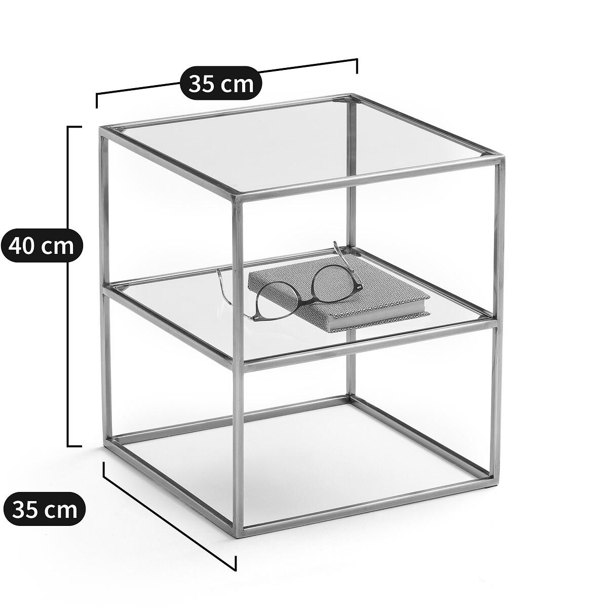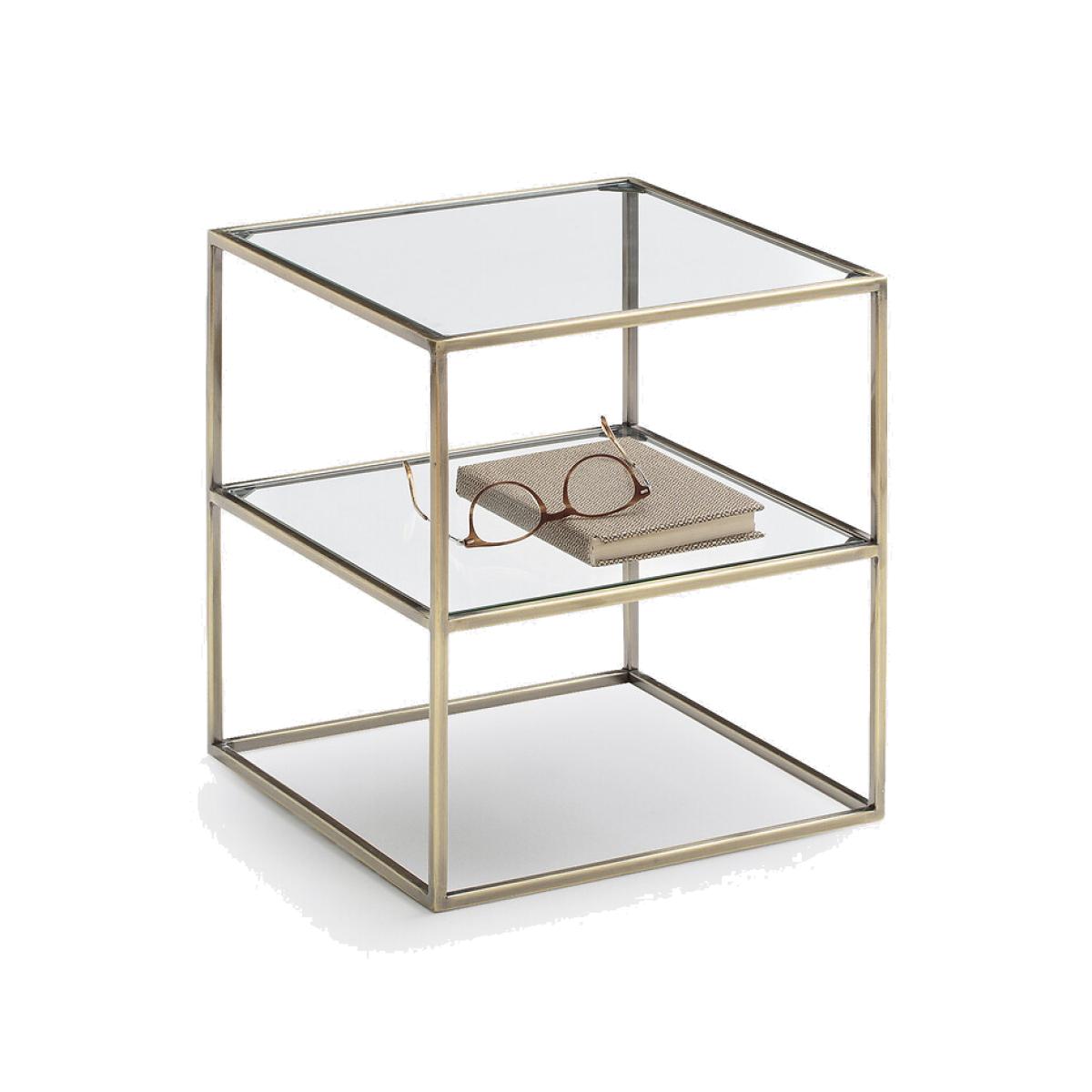 The Luxore double-shelf bedside table. Simple lines with all the elegance of glass and brass ! Product Details • Dimensions • 2 transparent glass tiers. • Metal tubular frame in an aged brass finish. • Tempered glass tops. • 2 transparent glass tiers. • Metal tubular frame in an aged brass finish. • Tempered glass tops. Dimensions • Length: 35cm • Height: 40cm • Depth: 35cmDelivery:. This product requires assembly. Available for home delivery. Note! Please check that all access points are large enough to accommodate your delivery (doors, stairs, lifts).Dimensions of parcel:1 parcel • L43.5 x D43.5 x H53cm • Weight: 7.3kg