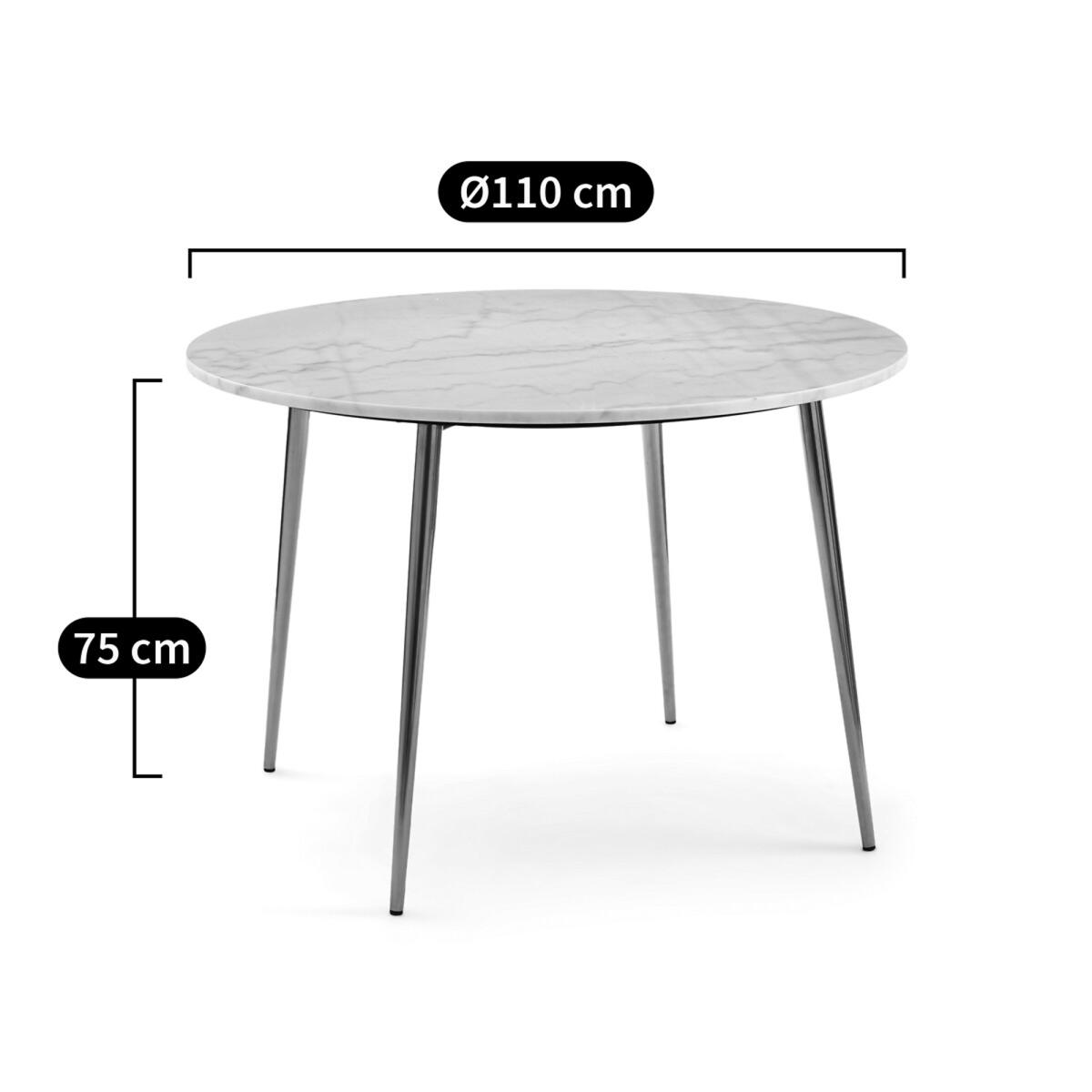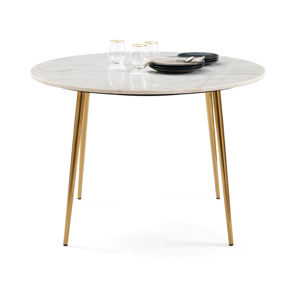 This round marble table is a versatile piece that works well in both contemporary and classic interiors. I love its sleek marble surface paired with delicate gold legs, adding a touch of elegance without being overly ornate. It's perfect for smaller dining spaces or kitchens, offering enough seating for four without overwhelming the room. When styling around it, consider simple, understated tableware and minimalist decor to let the natural beauty of the marble stand out. Practical tips include pairing it with neutral or monochrome chairs to keep the look cohesive, and using subtle lighting to highlight the marble's veining. This table can act as a statement piece in a modern loft or a refined addition to a more traditional dining setting.