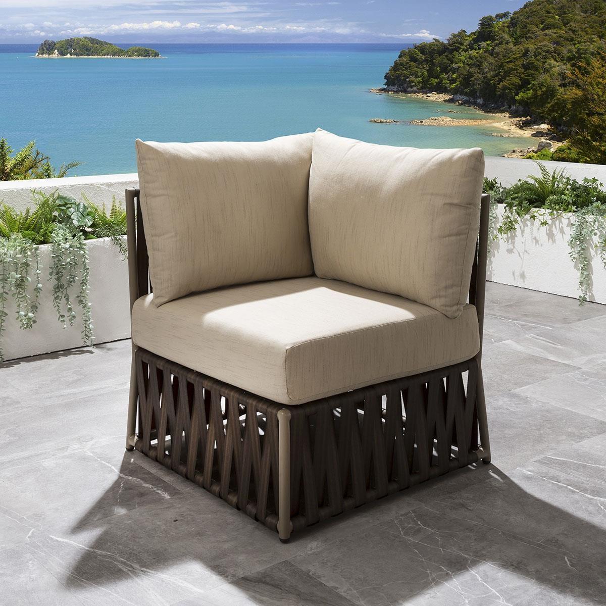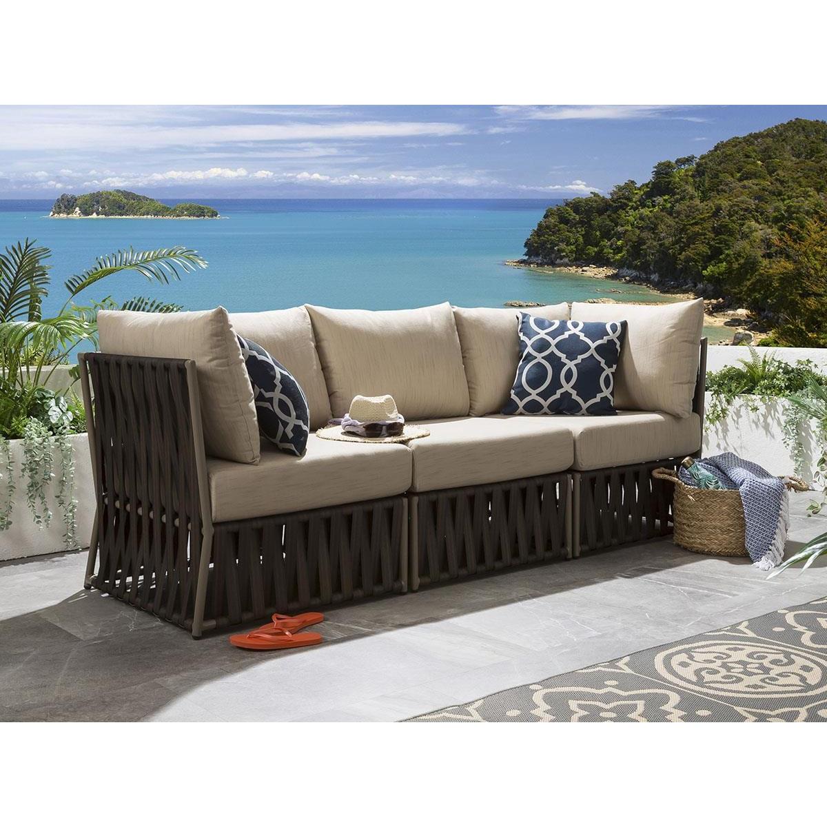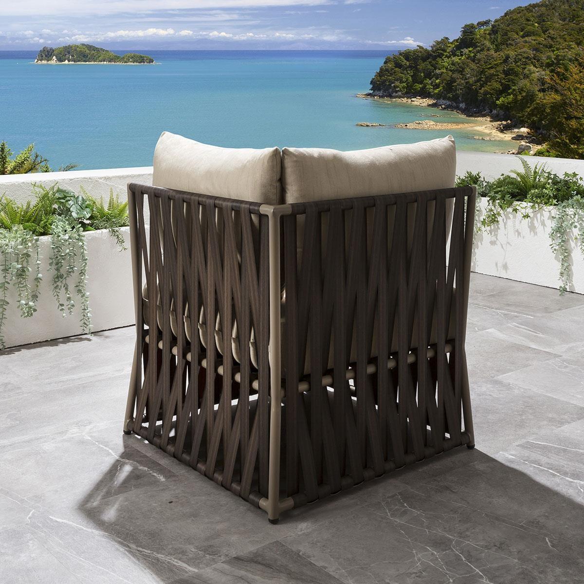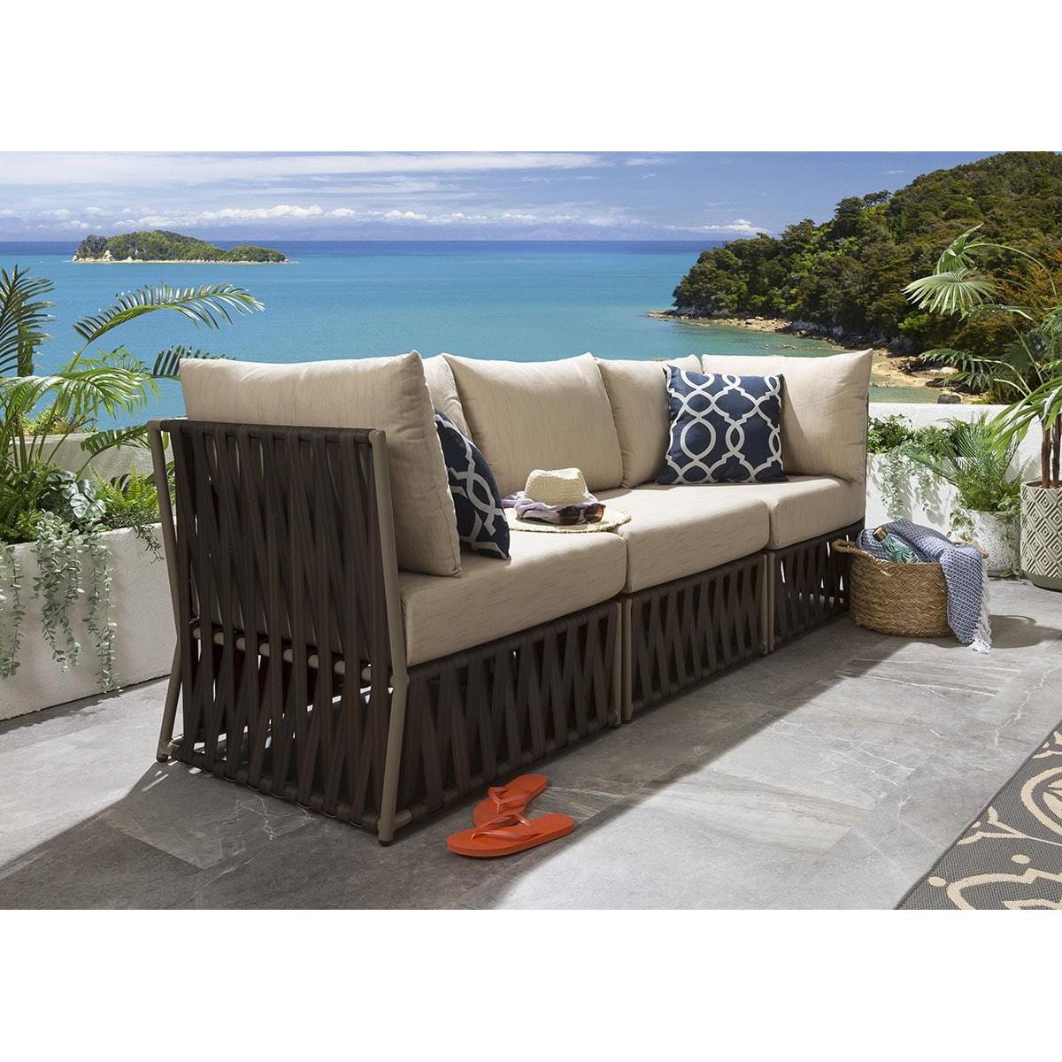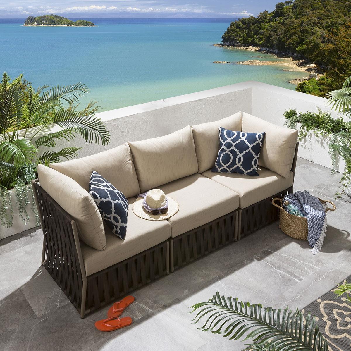 The Theo 3 seater premium brown thick rattan weave sofa range combines modular practicality with designer style and luxury comfort. Our stunning outdoor 3 seater garden sofa will make a gorgeous addition to your outdoor seating area or patio. All sections in this range come with a free winter cover. The outdoor sofa set comes complete with our signature luxuriously thick cushioning that offers unbeatable comfort, topped off with rich Beige high-end marine fabric which has amazing resilience to colour fading and damage caused by extreme weather conditions. Expertly crafted aluminium frames are highly durable, complemented by the intricate rattan weave that blends traditional with contemporary. It offers an unexpected alliance between the design minimalism of its metallic structure and the artisanal warmth of its UV and weather-resistant hand-woven rattan. The whole set is super-easy to clean, guaranteeing years of enjoyment with the modular garden sofa. If you need more information about this product, use the Live Chat service to speak to the team or send us a message. Spread the cost our with interest-free finance options. Minimum spend applies. W220cm D75cm H75cm Luxury 3 Seater Brown Rattan Garden Sofa Free beige protective cover included