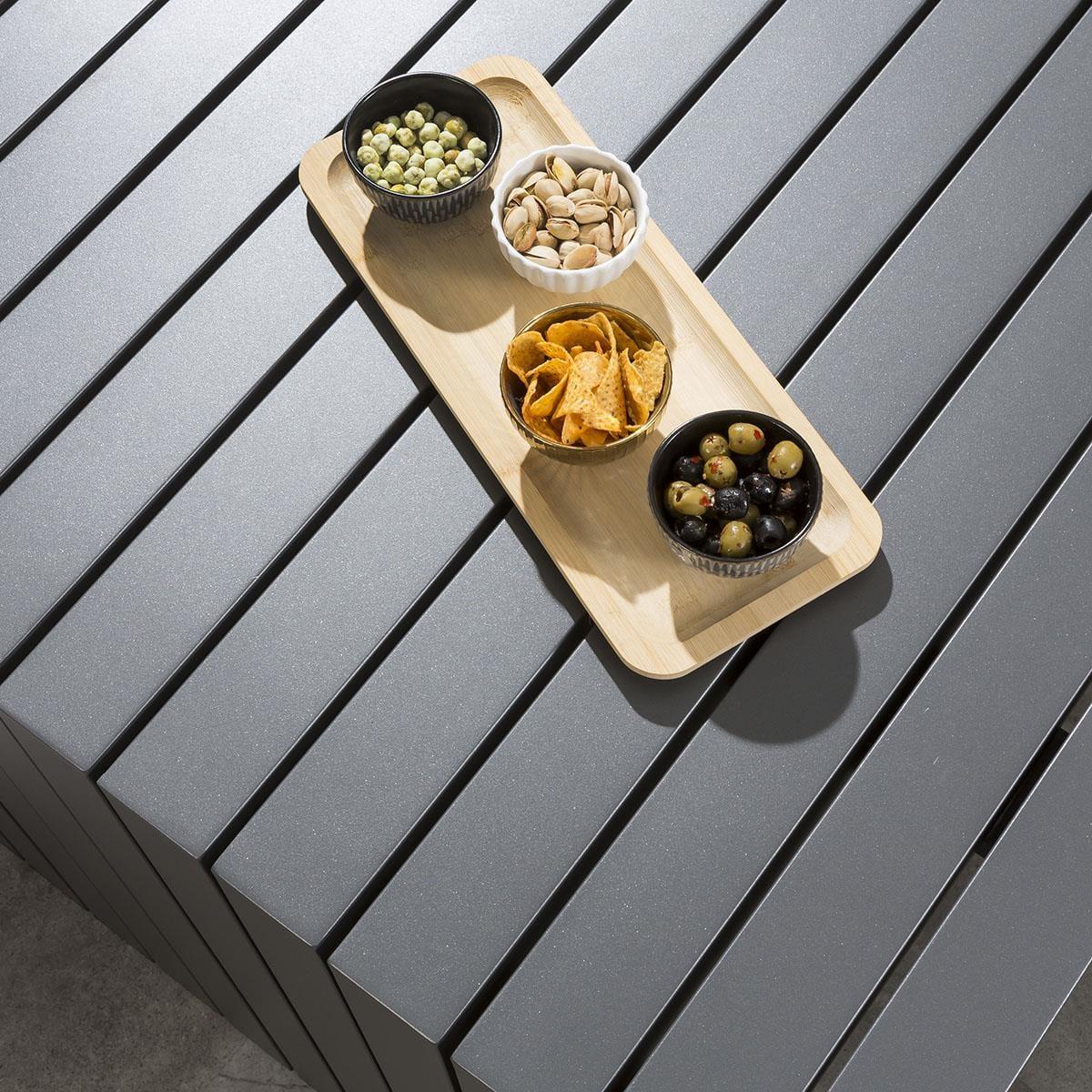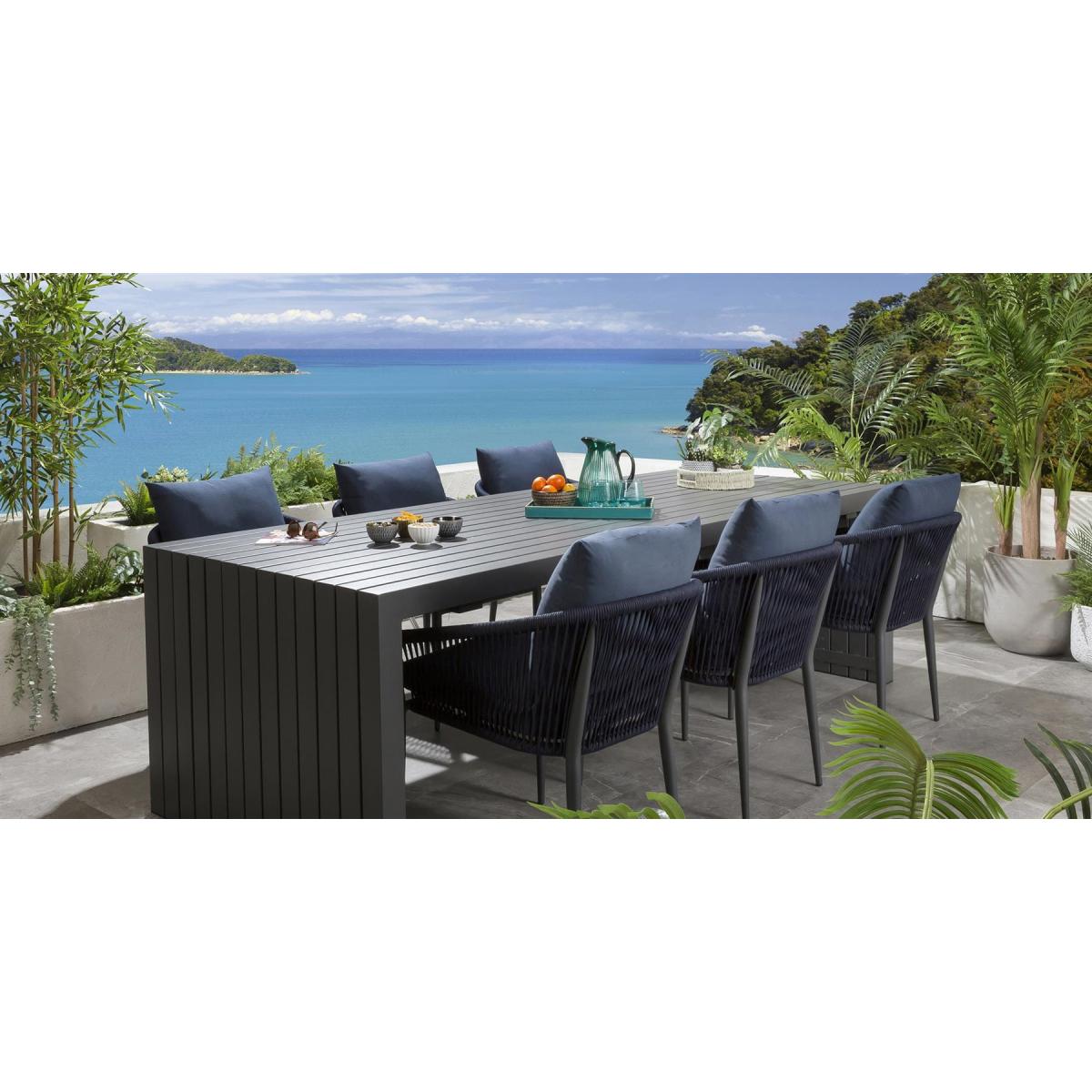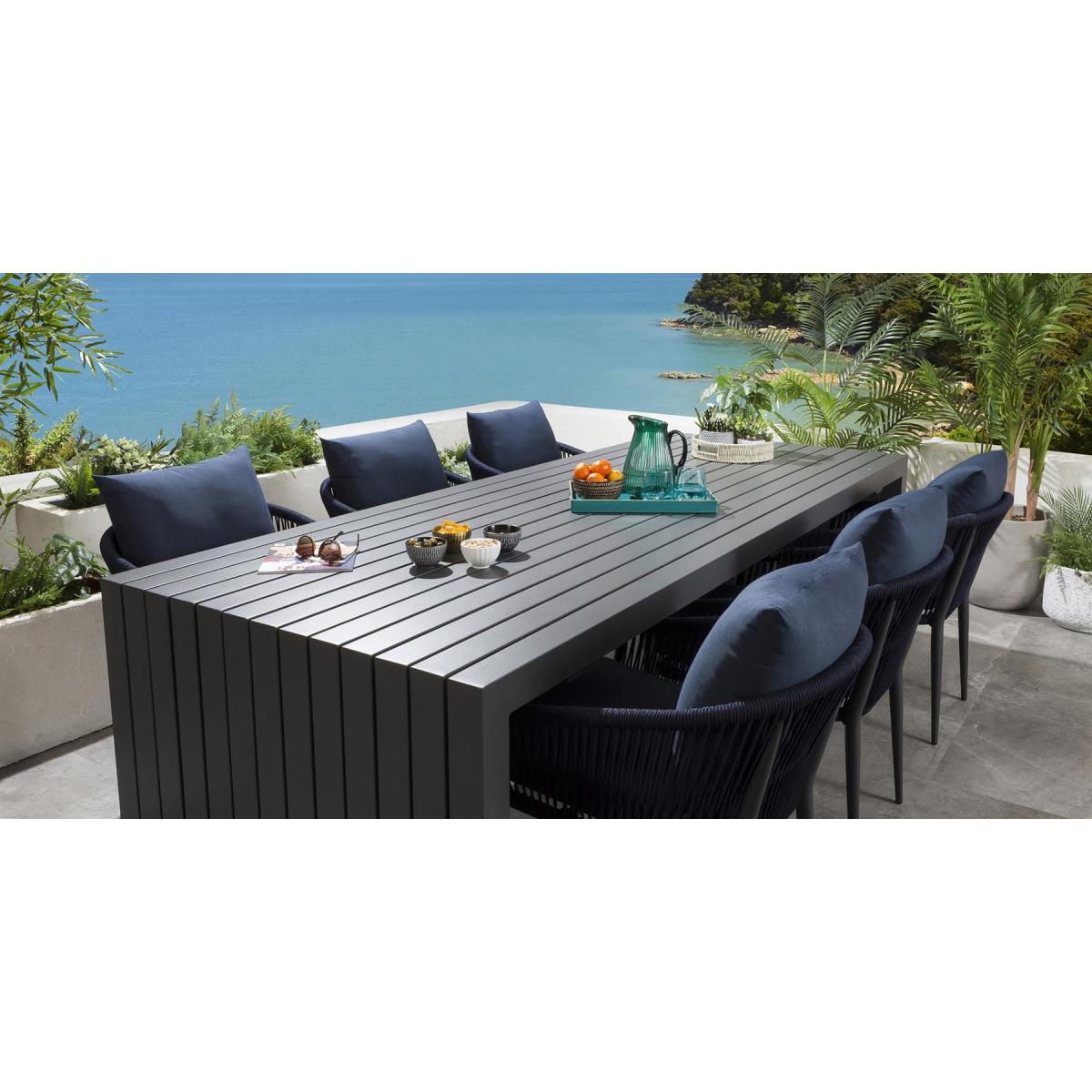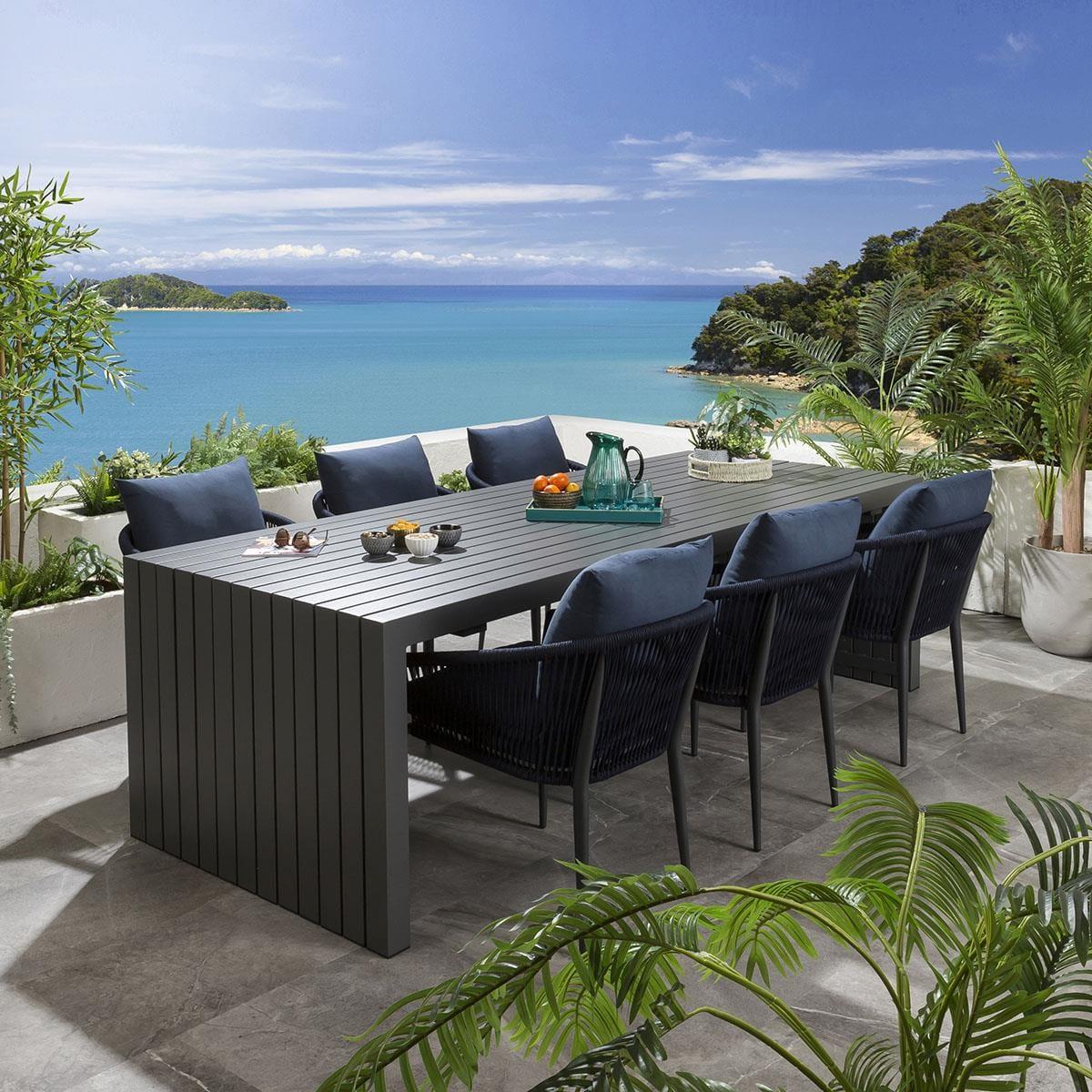 The BT Garden Table in Grey by Quatropi is an ultra-modern 2.6m x 1m outdoor garden dining table with an aluminium frame and a striking wrap around design - part of the unique designer range of garden patio furniture exclusive to Quatropi. This table emcompases a subtle wow-factor that is sure to impress, as well as the simplicity of a functionalist approach that will make it work with so many different styles. This simple design provides users with plenty of space to engage with others and manoeuvre. Also, ongoing maintenance of the table is easy, the frame and tabletop can easily be cleaned with warm soapy water. Included in the set are these fabulous all-weather blue garden dining chairs. The generously padded outdoor chairs are enhanced by a supportive back cushion for an extra layer of luxurious comfort. The generously padded outdoor chairs are enhanced by a supportive back cushion for an extra layer of luxurious comfort. Our gorgeous garden chairs will make a stunning addition to the garden dining set. The outdoor chairs come complete with our signature luxuriously thick cushioning that offers unbeatable comfort, topped off with rich Blue high-end marine fabric which has amazing resilience to colour fading and damage caused by extreme weather conditions. Expertly crafted aluminium frames are highly durable, complemented by clean lines that lend contemporary style. It is robust and weather-resistant for outdoor use & the super cushioned seating offers comfortable support that's shower-resistant, but we advise that cushions are stored when not in use. Spread the cost our with interest-free finance options. Minimum spend applies. W260cm D100cm H75cm 5 Year Warranty 6 Stackable Chairs