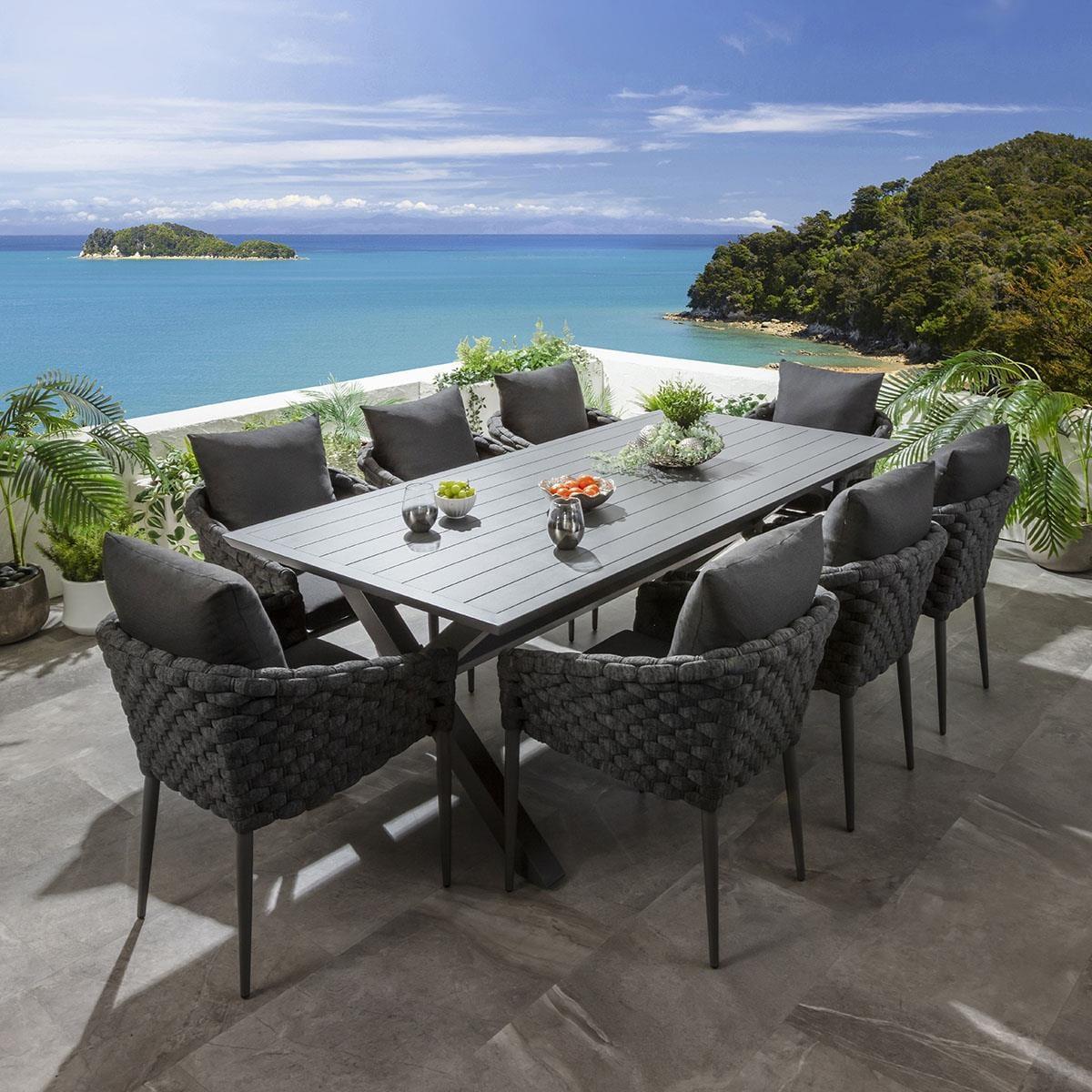 This 8 seater garden dining table and chairs set includes a farmhouse-inspired dining table, featuring a grey finish and X-legs, crafted from full aluminium, with luxury aluminium garden dining chairs in an elegant grey and the signature thick rope weave. This outdoor dining set is crafted for durability and comfort. The Star 220cm modern garden dining table boasts a farmhouse-inspired design, featuring a sleek modern grey finish and distinctive Cross X-leg design. Crafted from full aluminium, this weatherproof 8-seater outdoor table is designed to withstand the elements, allowing you to leave it uncovered year-round. The 8 garden dining chairs feature sleek grey aluminum frames, complemented by the Sundowner signature thick rope weave, creating a contemporary look for your patio. These outdoor chairs promise luxury comfort, with a seat pad and back cushion upholstered in charcoal grey fabric. This 8 seater dining set combines modern Sundowner chairs with the stunning Star table. Whether you love the Sundowner chairs and would like to purchase them individually, or you think the Star table would complete your outdoor dining space better with another chair, you can easily mix and match our garden tables and chairs to curate something truly unique. Table Size W220cm D93cm H76cm Chair Size W61cm D62cm H74cm Modern Garden Dining Set for 8