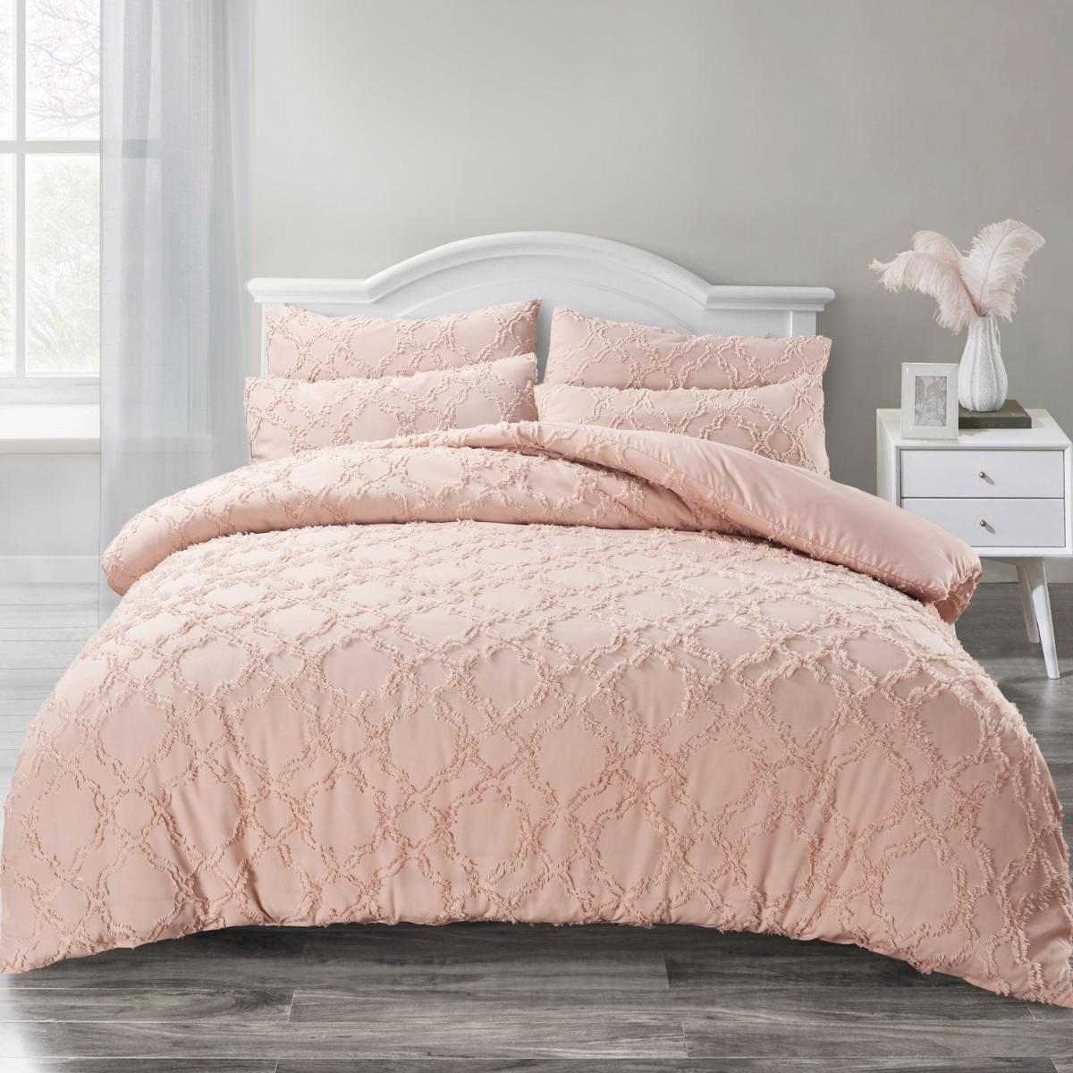 Revamp your bedroom into a chic and polished haven with our lavish Intimates Ophelia Tufted Duvet Cover Pillowcase Set. Crafted from an ultra-soft microfibre fabric in a pristine white, grey and blush shade, this duvet cover boasts a beautiful drape and texture that effortlessly enhances your bed's appearance. The tufted lattice design gracefully extends to the pillowcases, creating a luxurious and unified aesthetic that elevates your bedroom decor. Beyond its stylish appeal, this white tufted lattice duvet cover is also pragmatic it is machine washable and dries quickly, making it the ideal choice for convenient year-round use.