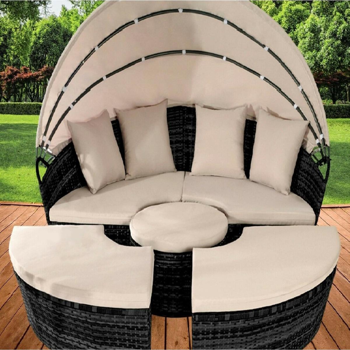 This lounger can seat up to 8 people and separates it into four pieces to convert it from a luxury daybed into an ideal seating area to entertain guests with the centrepiece serving also as a coffee table when you remove the cushion. Perfect for the patio, garden, or roof terrace, the canopy sunroof provides protection whatever the weather and is fully retractable for basking in the sun. This multifunctional sun lounger includes cushioned seating and backrest scatter cushions, designed to resist the elements with showerproof covers that are removable and machine washable. The centre stool/table stores discretely away between the sofa seating for a practical, space-saving storage solution when not in use. Made from high-quality poly-rattan material which is UV resistant to prevent colour fading and woven over a sturdy metal frame to provide durability over the years and requires no maintenance.