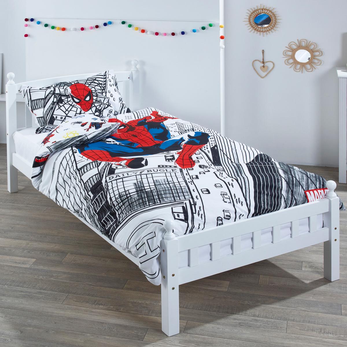 This awesome Single bed comes complete with everything you need for your child. A sturdy base, a superb quality handmade British mattress, sheet, pillow, duvet and officially licensed Marvel Spiderman bedding set. Unlike the cheaper poor quality beds available, this set is real quality and should last a long time. The bed frame is tested to 350kg load test, which means it is durable and strong. The Bed has a 12-month warranty for normal household use, the mattress has a 12-month warranty for normal household use. The bed, mattress and bedding have been specially chosen by us for comfort, quality and long-lasting durability. Our premium delivery service means this set will be delivered by a 2 person team who will even carry it up a flight of stairs and put it in a room of your choice ready for you to assemble. The set comes with everything you need for easy assembly.
