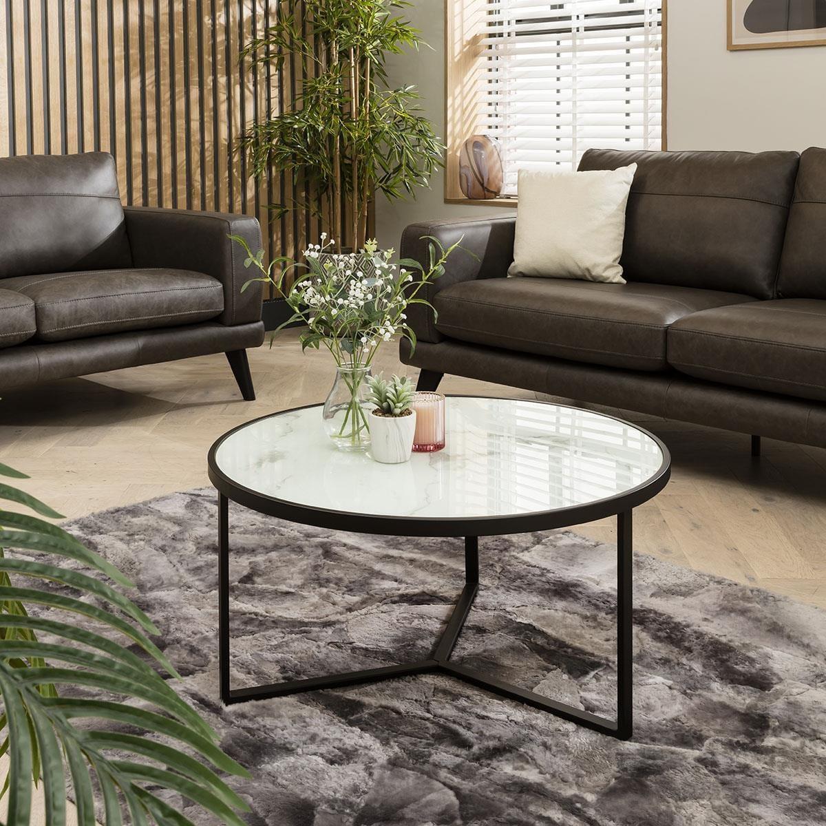 Featuring a minimalistic design with a touch of contemporary style, this coffee table's bold style works well with a number of interior styles. The round coffee table features a sturdy 3 legged metal base in powder-coated black finished with an 80cm white marble-effect glass top which contrast perfectly to emphasise the contemporary design. This is our modern take on a traditional coffee table design - it's great in the living room but would also work fantastically in light and airy spaces such as conservatories. If you need more information about this product, use the Live Chat service to speak to the team or send us a message. Spread the cost our with interest-free finance options. Minimum spend applies. W80cm D80cm H38cm White Marble-Effect Coffee Table with Black Metal Frame This is a light and simple compact coffee table for smaller rooms