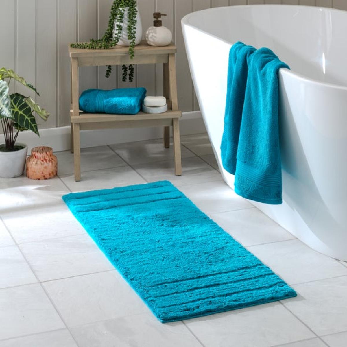 I love this bath runner for its clean, textured stripe design that adds a touch of subtle sophistication to any bathroom. Its plush, cotton material makes it practical and cosy underfoot, perfect for adding comfort after a bath or shower. It works well in contemporary, minimalist, or even cottage-style interiors, thanks to its simple yet stylish pattern. For best styling, layer it with matching towels or complementary accessories in neutral tones or similar shades of blue to create a cohesive look. Placing it in front of a freestanding tub or across the shower area helps to define the space while keeping the floor dry and stylish.