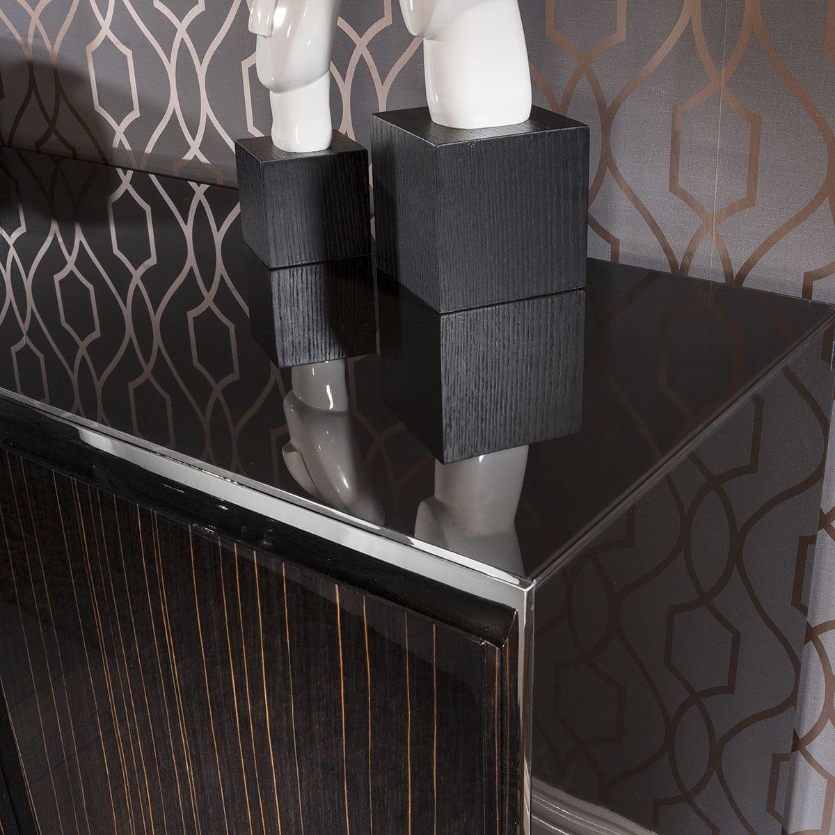 Quatropi Design Studios 216. M Ebony Gloss Sideboard / Cabinet With Dark Coffee Glass Top. A Great Addition to any Living Room, Office Or Dinning room. This statement piece will be the talk of your living space with its eye-catching stainless steel base and lush deep brown glass top. Wonderful stunning build quality featuring 4 soft close doors each with a center shelf behind. Beautiful high-class lacquered Ebony wood base gives a truly unique look that's beautifully emphasised the sideboards strong designer look. The Quatropi "V" sideboard ensures an influx of character, style and practicality for your home interior, the perfect piece for larger spaces and contemporary styled homes. W200cm D50cm H81cm Modern Design Premium Quality Furniture