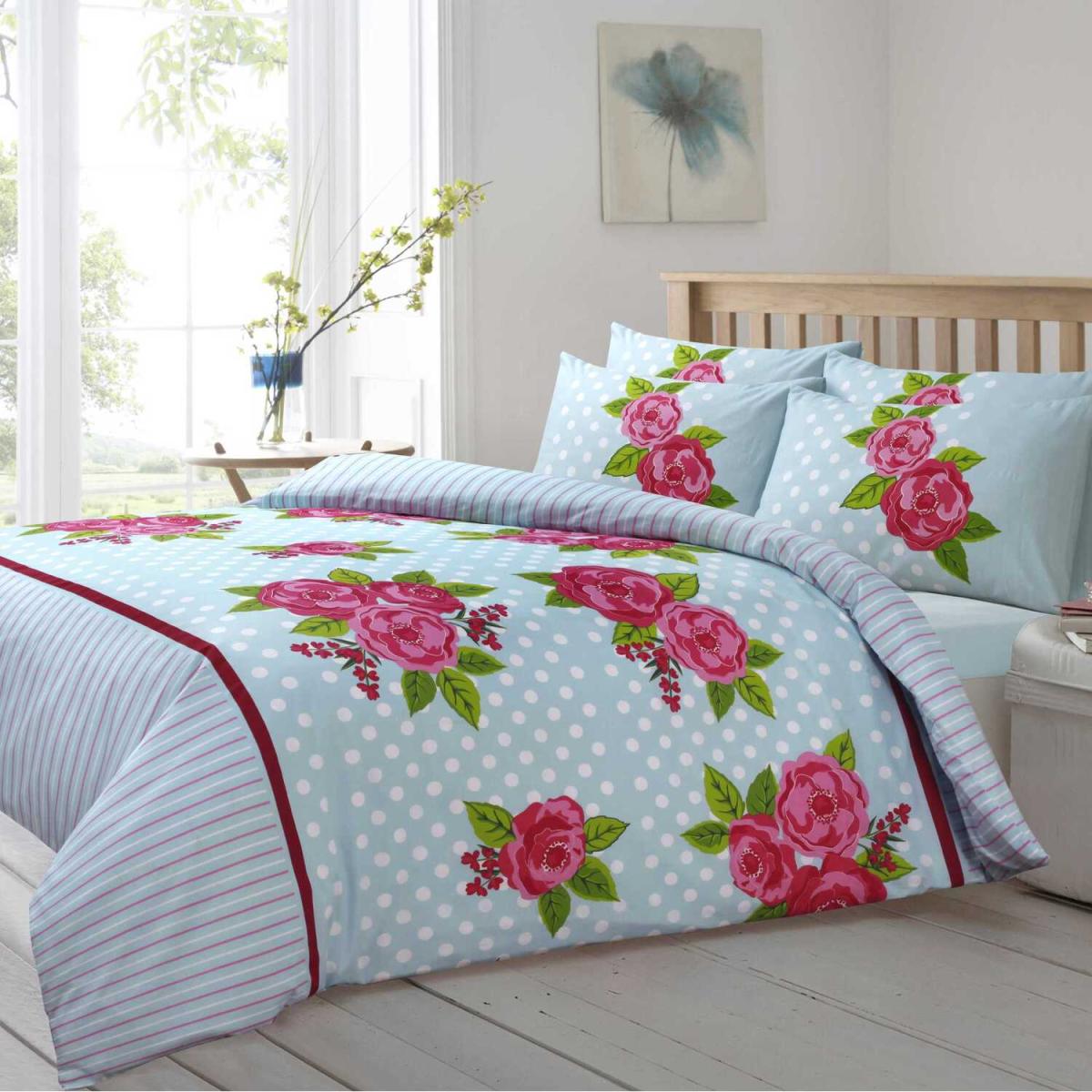 Luxury Floral Printed Polka Dots Duvet Cover and Pillowcase Set - Duck Egg / Double
