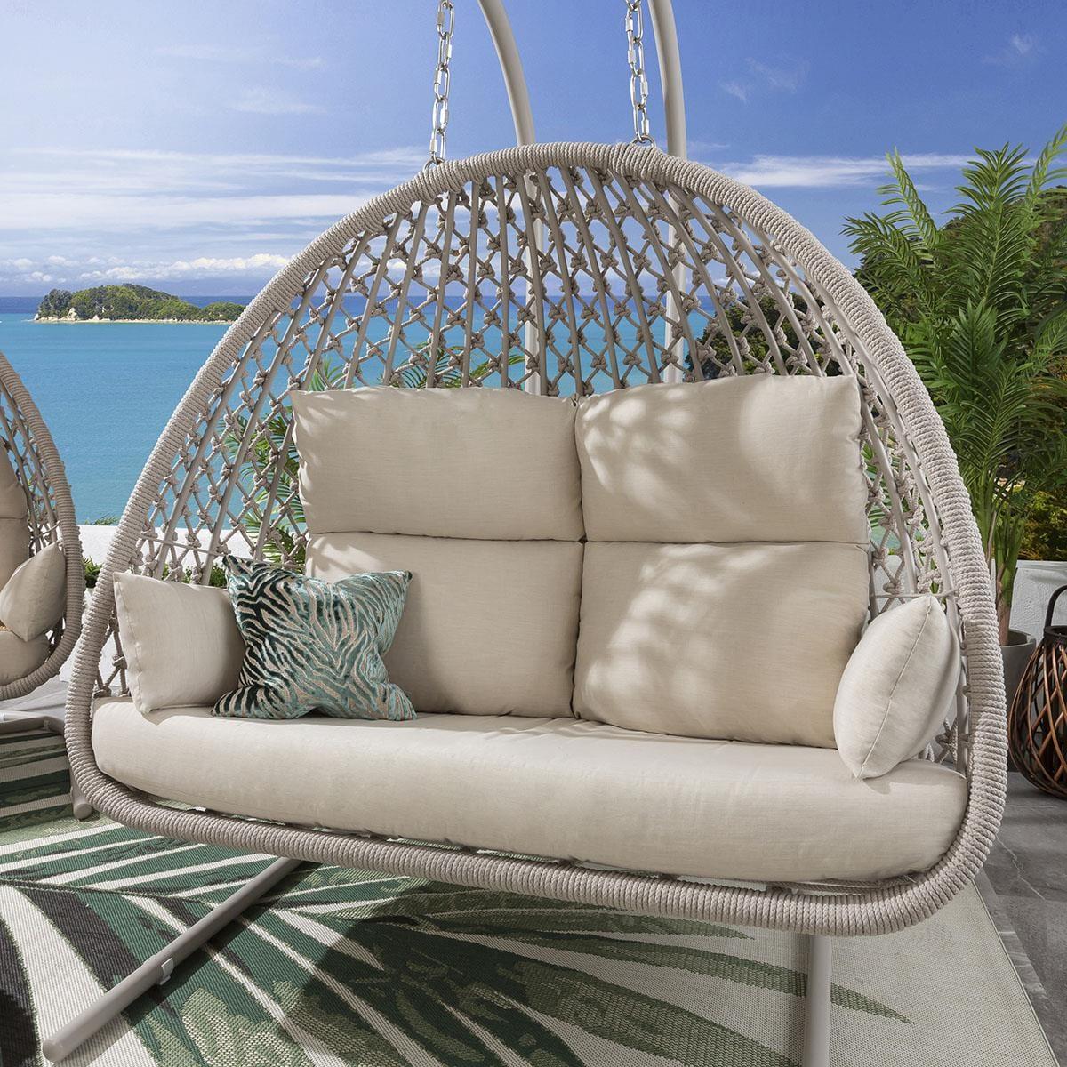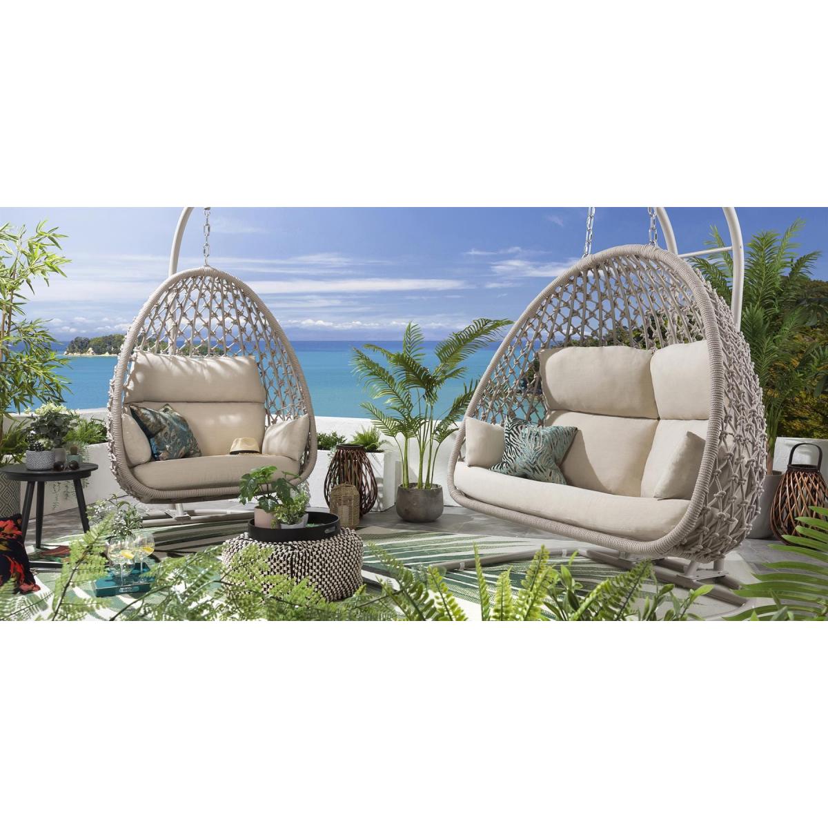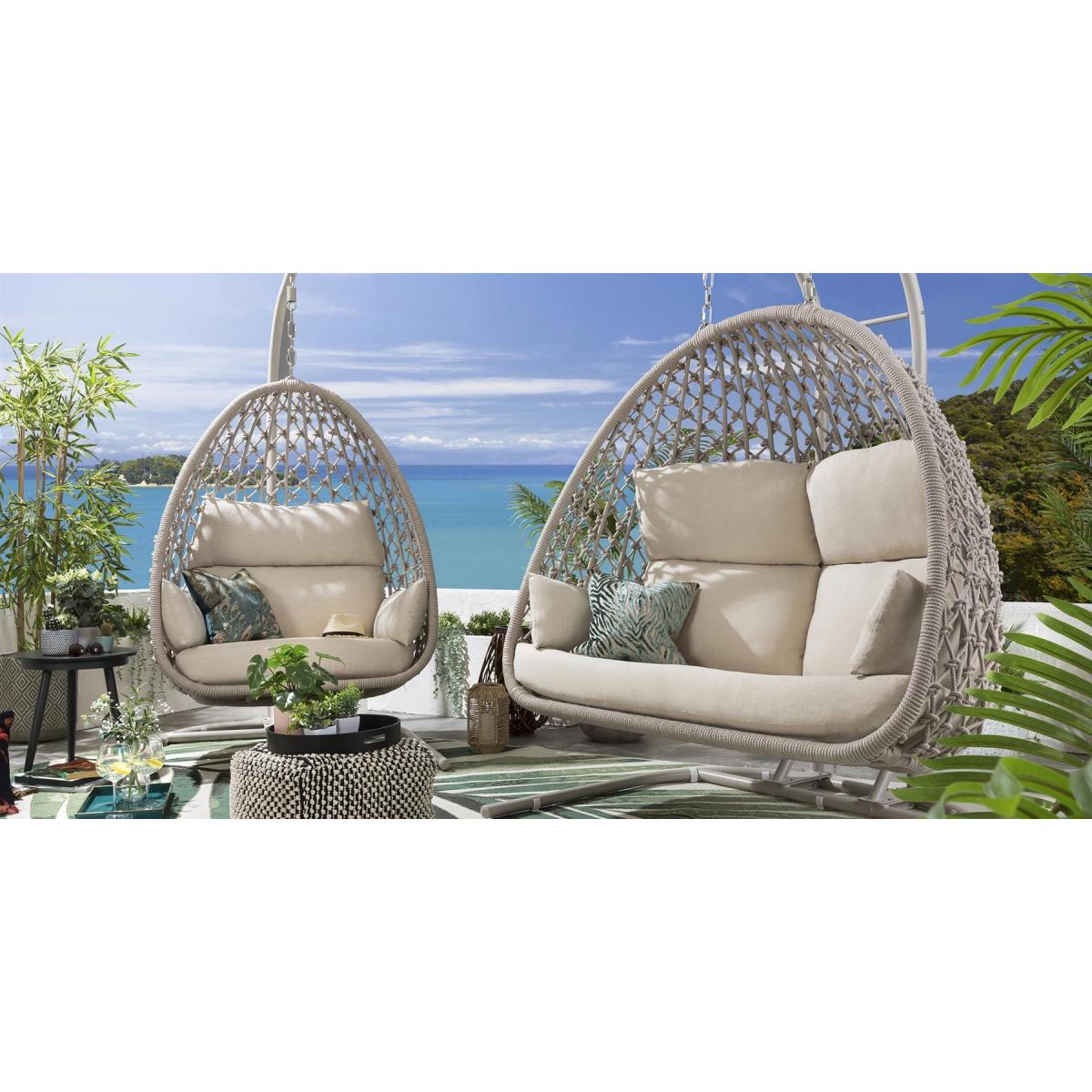 Only the very best and most experiences of our craftsmen are up the meticulous job of hand weaving our knotted rope range of hanging chairs and sofas. This stunning detail along with the soft and natural colourway of this collect make it stand out even at the very highest end of the market. This stunning collection simply oozes luxury. Our double hanging sofas are totally unique in the market. The stunning teardrop shape not only looks amazing but provides a wider, flatter cocoon type seat which lends inself perfectly to putting your feet up or sharing the space with a loved one. The cushions have been developed with super-thick foam base cushions, split lumber / headrest soft fibre-filled back cushions and moveable armrest / scatter cushions. All cushion covers can be removed and are machine washable. The basket of the hanging chair is fully built for maximum stability, the frame comes boxed and does require minimal assembly and you may need a hand with hanging the basket on the frame. Our adjustable chain allows for different sitting heights, and the plastic support feet are moveable to help balance for uneven surfaces. Remember that none of our designs are available elsewhere and this latest generation of chairs keeps us at the very top of the premium market. W160cm D125cm H207cm Free Winter Cover Max Weight Capacity: 150kgs