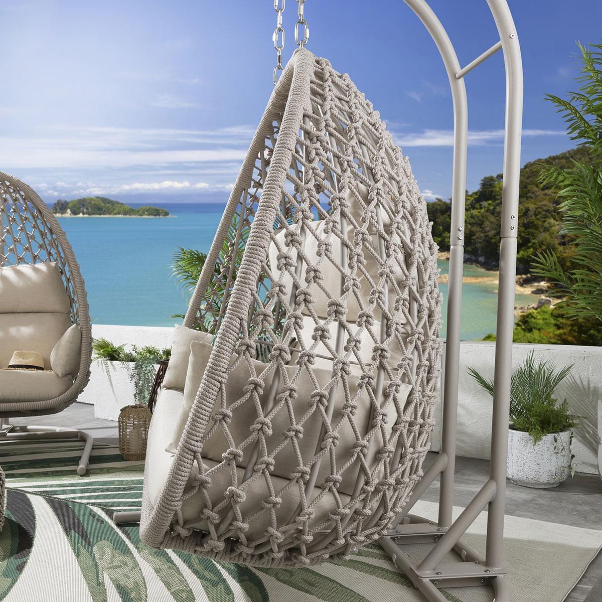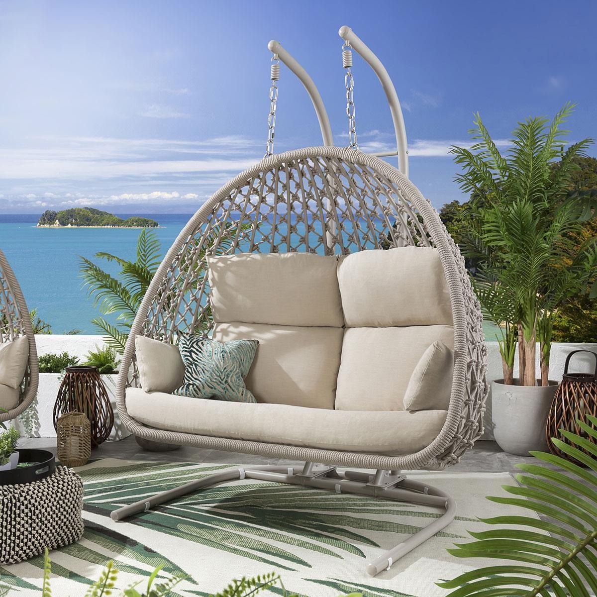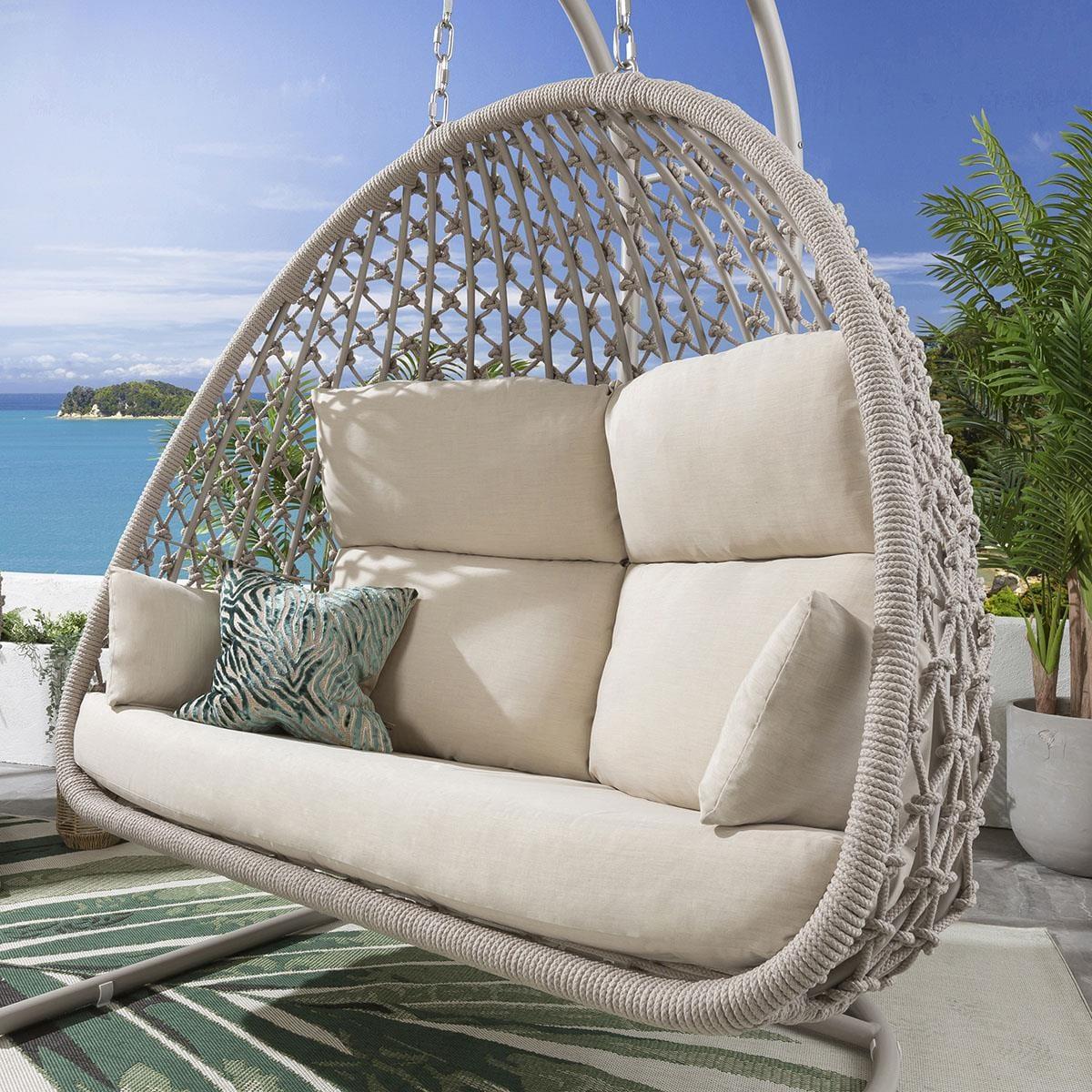 Only the very best and most experiences of our craftsmen are up the meticulous job of hand weaving our knotted rope range of hanging chairs and sofas. This stunning detail along with the soft and natural colourway of this collect make it stand out even at the very highest end of the market. This stunning collection simply oozes luxury. Our double hanging sofas are totally unique in the market. The stunning teardrop shape not only looks amazing but provides a wider, flatter cocoon type seat which lends inself perfectly to putting your feet up or sharing the space with a loved one. The cushions have been developed with super-thick foam base cushions, split lumber / headrest soft fibre-filled back cushions and moveable armrest / scatter cushions. All cushion covers can be removed and are machine washable. The basket of the hanging chair is fully built for maximum stability, the frame comes boxed and does require minimal assembly and you may need a hand with hanging the basket on the frame. Our adjustable chain allows for different sitting heights, and the plastic support feet are moveable to help balance for uneven surfaces. Remember that none of our designs are available elsewhere and this latest generation of chairs keeps us at the very top of the premium market. W160cm D125cm H207cm Free Winter Cover Max Weight Capacity: 150kgs