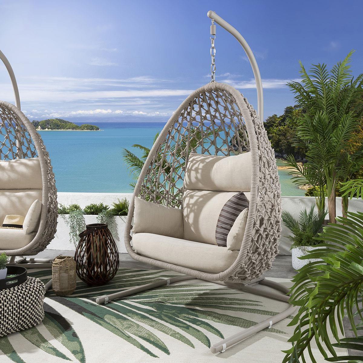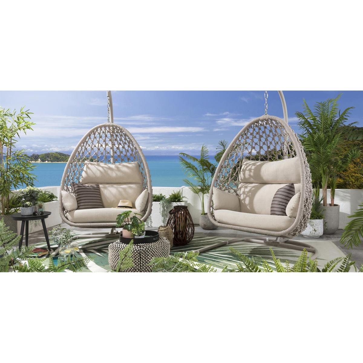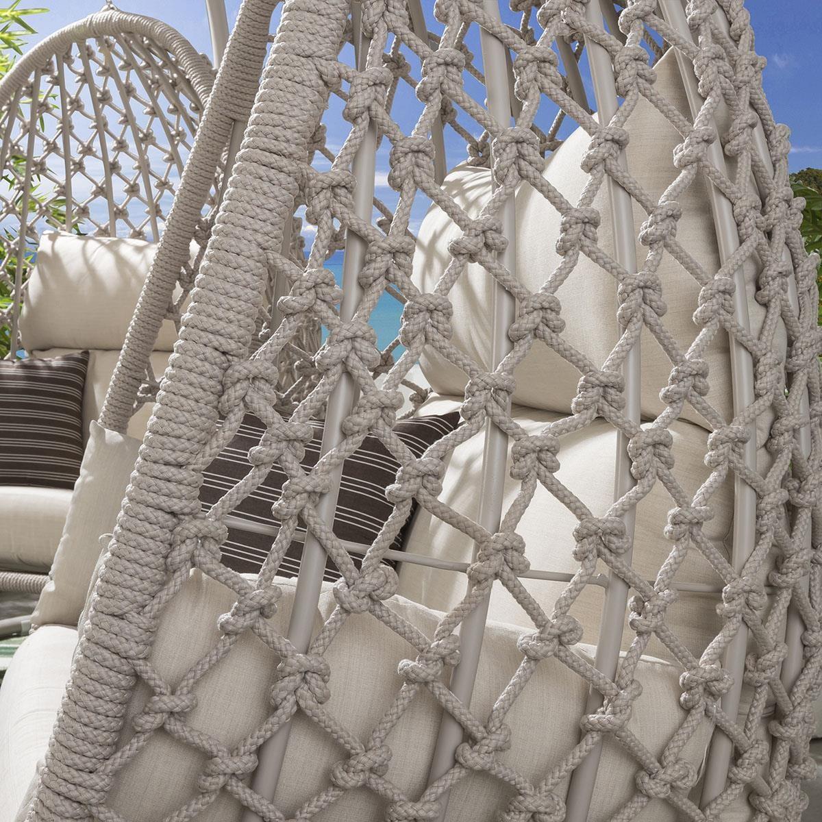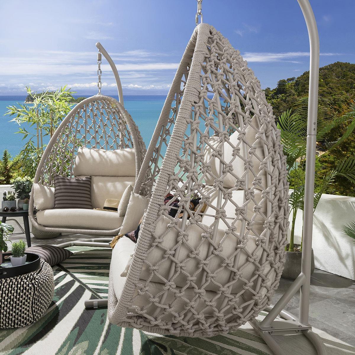 Only the very best and most experiences of our craftsmen are up the meticulous job of hand weaving our knotted rope range of hanging chairs and sofas. This stunning detail along with the soft and natural colourway of this collect make it stand out even at the very highest end of the market. This stunning collection simply oozes luxury. Our single hanging chairs are totally unique in the market. The stunning teardrop shape not only looks amazing but provides a wider, flatter cocoon type seat which lends inself perfectly to curling up and getting cozy. The cushions have been developed with super-thick foam base cushions, split lumber / headrest soft fibre-filled back cushions and moveable armrest / scatter cushions. All cushion covers can be removed and are machine washable. The basket of the hanging chair is fully built for maximum stability, the frame comes boxed and does require minimal assembly and you may need a hand with hanging the basket on the frame. Our adjustable chain allows for different sitting heights, and the plastic support feet are moveable to help balance for uneven surfaces. Remember that none of our designs are available elsewhere and this latest generation of chairs keeps us at the very top of the premium market. W115cm D125cm H207cm Free Winter Cover Max Weight Capacity: 100kgs