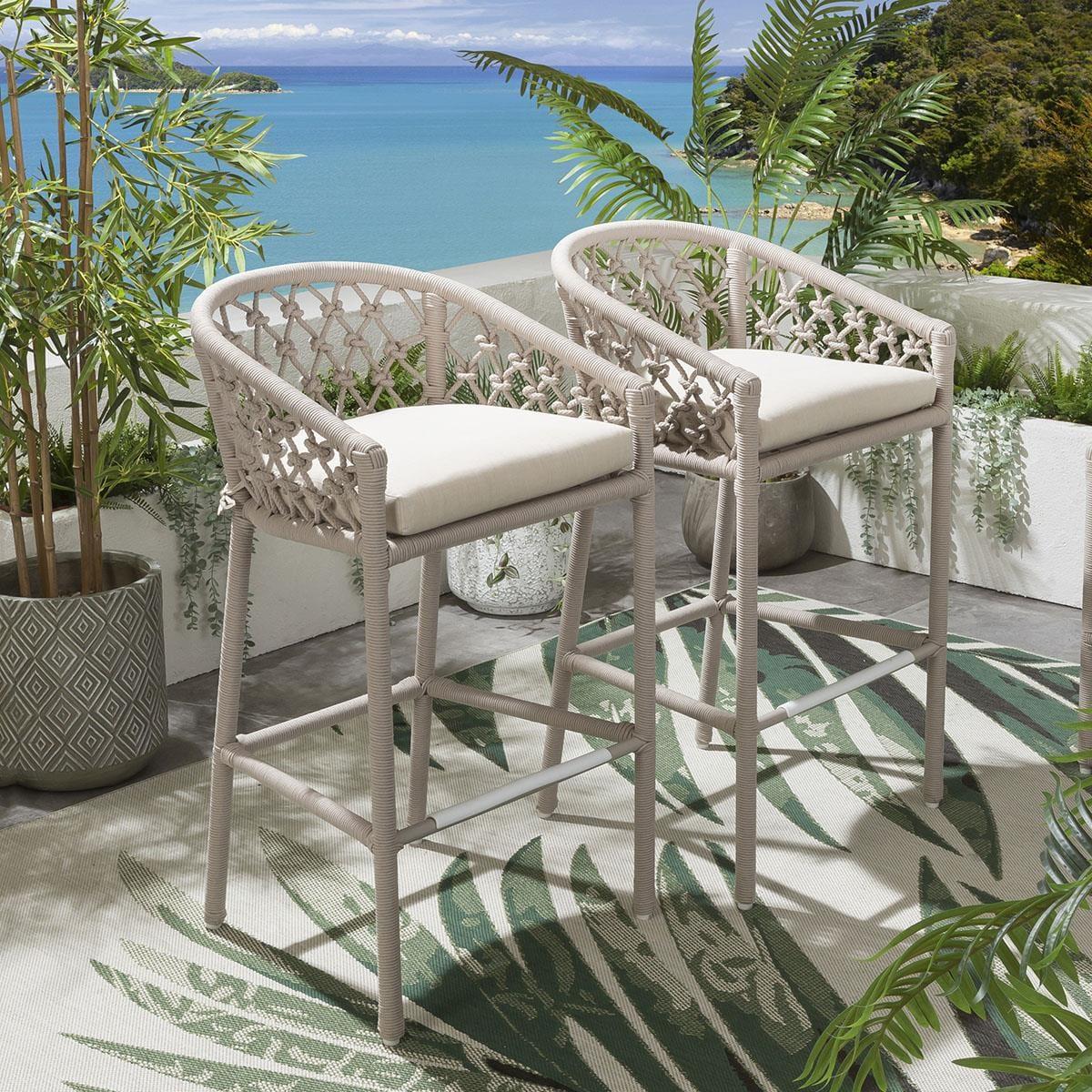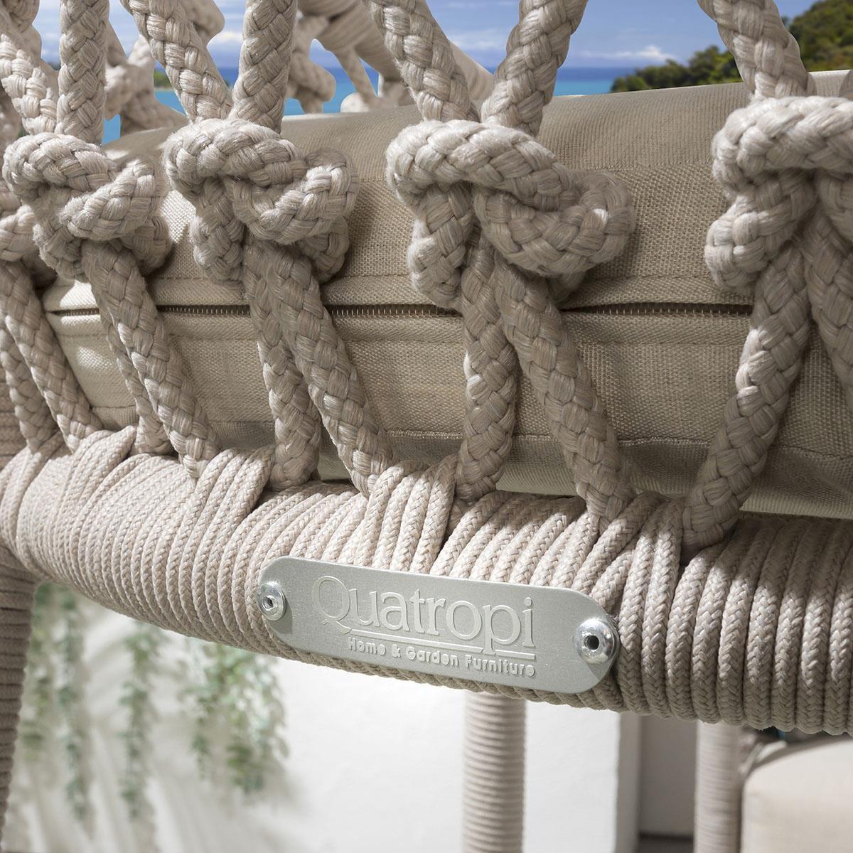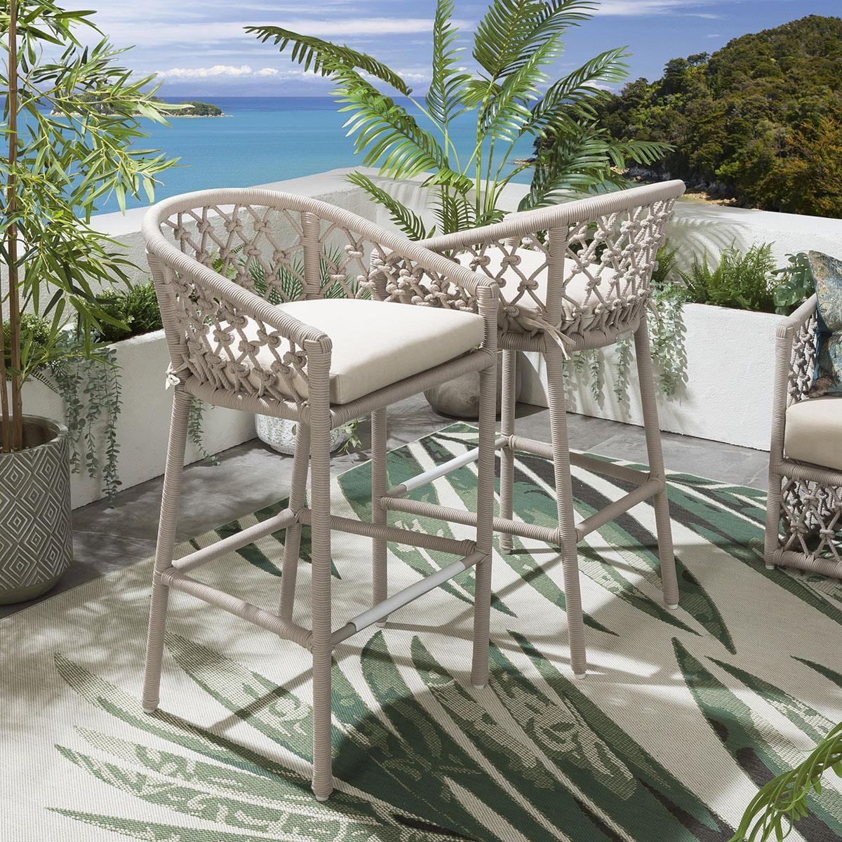 The Quatropi Outdoor Amelia Range Barstool adds a touch of sophistication to your outdoor space. Its modern design features a knotted rope design crafted from high-quality aluminum and soft, deep cushions that provide superior comfort. The sleek frame is weatherproof and designed to last, backed by a 5 year warranty for peace of mind. This stylish armchair is perfect for relaxing in the garden, patio or poolside and provides a luxurious seating solution for al fresco dining. If you need more information about this product, use the Live Chat service to speak to the team or send us a message. Only the very best and most experiences of our craftsmen are up the meticulous job of hand weaving our knotted rope range of hanging chairs and sofas. This stunning detail along with the soft and natural colourway of this collect make it stand out even at the very highest end of the market. This stunning collection simply oozes luxury. W58cm D58cm H103cm All aluminium frame 800mm Seat Height