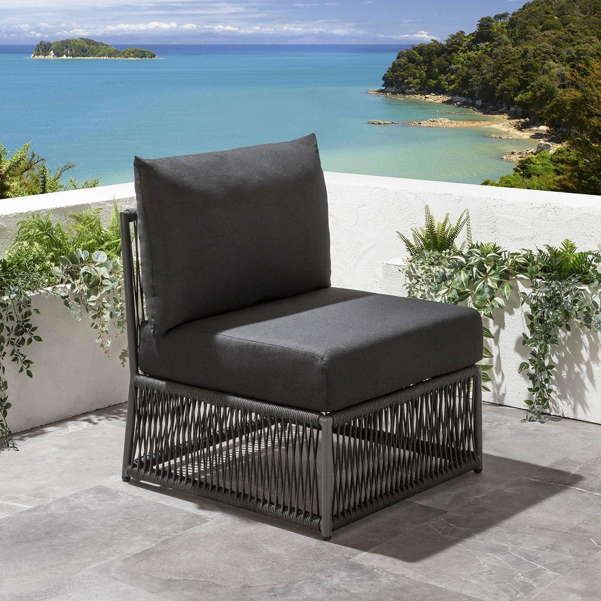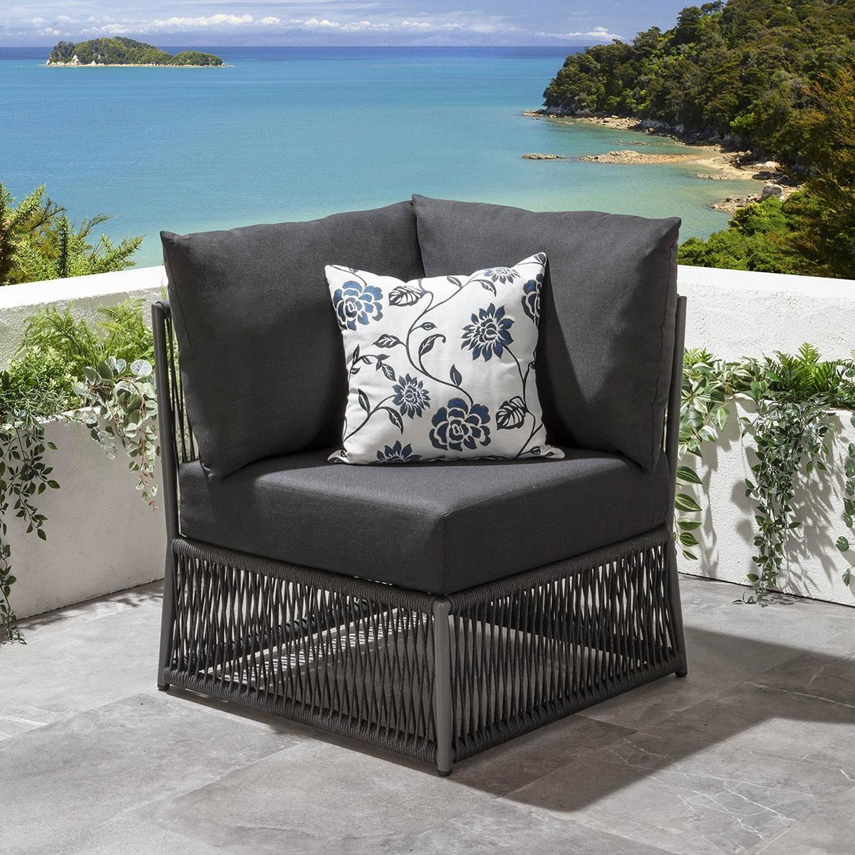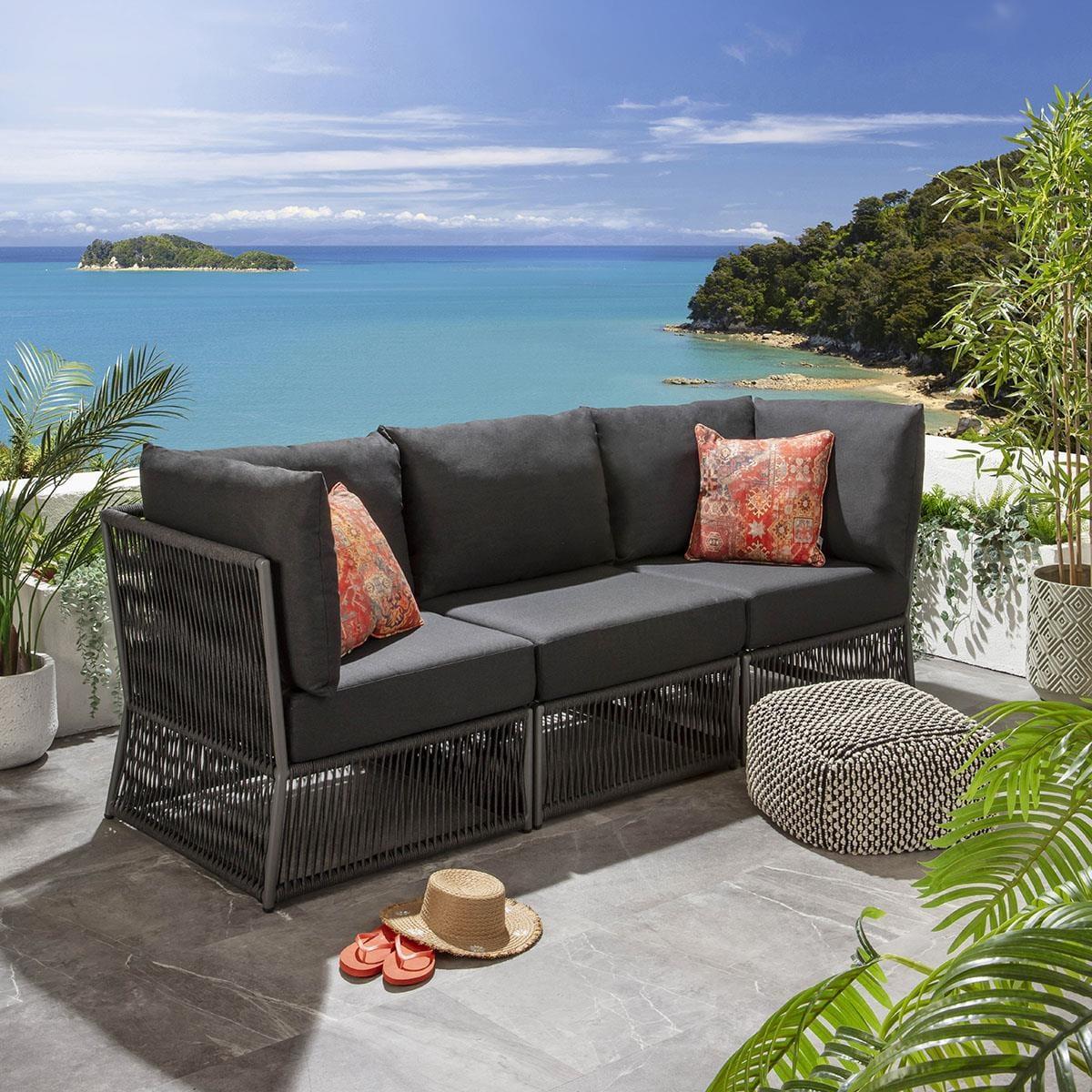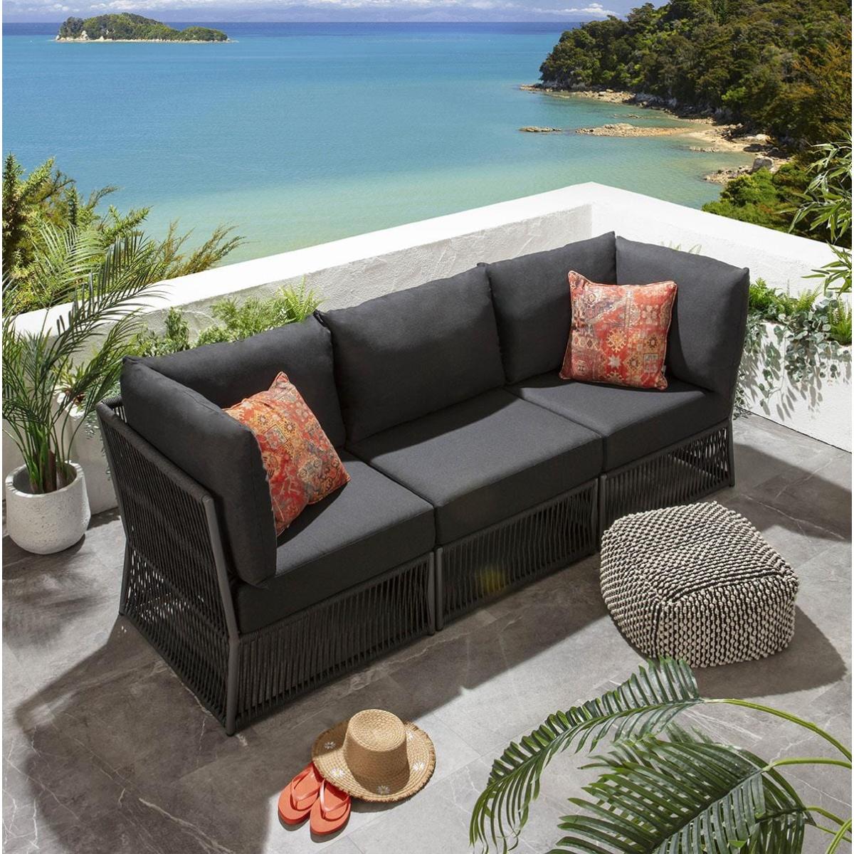 Crafted with a simple yet sturdy aluminum frame, the Cole 3 seater garden sofa set showcases a modern charcoal outdoor rope weave design. Super-thick cushions, upholstered in a premium grey fabric, ensure the utmost comfort. The patio sofa, measuring 218cm x 74cm. This modular design, based on two key elements a corner and a middle section, provides endless configuration possibilities. The corner sections feature a slightly larger size compared to the middle sections, a deliberate choice to accommodate the ergonomically shaped backrest design. The modules, each approximately 74cm, simplify the planning process for any outdoor space. The footstool's cushion can be removed, revealing a durable marble-effect ceramic top, adding a touch of elegance to your outdoor space. These cushions are made from high-grade foam covered in charcoal grey fabric, offering unbeatable comfort that seamlessly coordinates with the outdoor rope weave design. With a comfortable seat height of 45cm, the cushions feature convenient zips for easy removal and cleaning. For longevity, we recommend storing the cushions when not in use. Unbox, connect the sections effortlessly using the provided connectors, and enjoy your stylish garden retreat no assembly required. Elevate your outdoor living with the Cole modern garden sofa, designed for both aesthetic appeal and adaptable comfort. W218cm D74cm H75cm 3 Piece Garden Sofa Set Weather covers are included