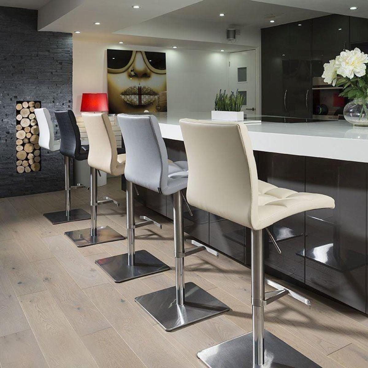 Ultra Stylish Modern High Quality Height adjustable Barstool with foot rest from the Quatropi Design Studio. Commercial standard heavy duty faux leather stool with adjustable height and 360 degree swivel. Brushed stainless steel stem and base. Superior quality gives both a great look and feel. Please do not mistake this for the popular chrome/ply stools which are very lightweight and not designed for heavy use or long life. Faux leather has a 4 level grading system, we only us ‘A’ grade on this range of stools. We have a whole range of styles available in WHITE, GREY, BLACK, BEIGE & CREAM all of which are made to high quality specification with the best materials for the job. Very limited supply.