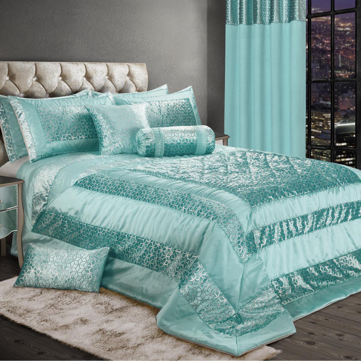 Make a striking impression with this impressive bedding ensemble in a lavish colour selection. The geometric foil print design on the crushed velvet cuff is guaranteed to capture attention and prompt your guests to seek out your style secrets. The coordinated pillowcases bring the whole look together, rendering our Intimates Vera Geometric Duvet Cover and Pillowcase Set undeniably eye-catching. The exquisite faux silk fabric not only exhibits a natural sheen and textured feel but also ensures a restful night's sleep with its comfortable polyester underside. Beyond its stunning appearance, this geometric duvet cover set is as practical as it is gorgeous, boasting crease-resistant and machine-washable properties. complete the look with the stunning generously quilted Bedspread. The classic art of layering your bed with a bedspread remains a style staple, and this opulent choice adds a touch of sophistication to any bedroom decor. the bedspread is elegantly adorned with a glamorous foil print geometric design, creating a breathtaking look that infuses your space with style. Crafted from a faux silk fabric face and a blend of polyester for the reverse, this quilted bedspread is both comfortable and durable. Elevate your bedding experience and introduce a dash of sophistication to your bedroom, add the finishing touch teh range with the matching cushion accessories.