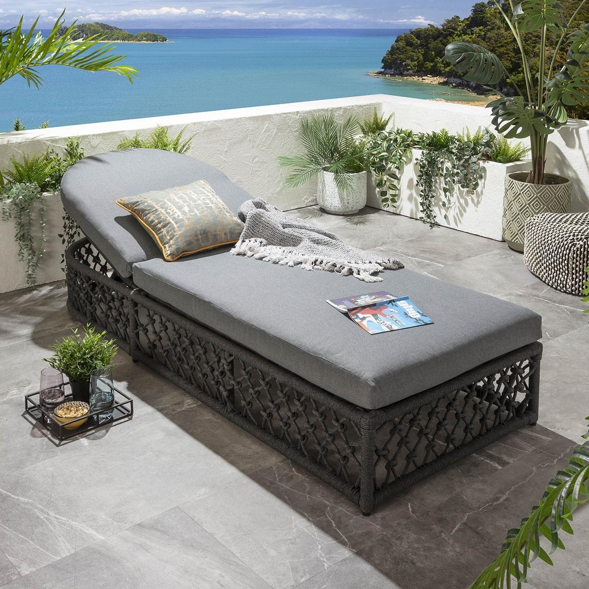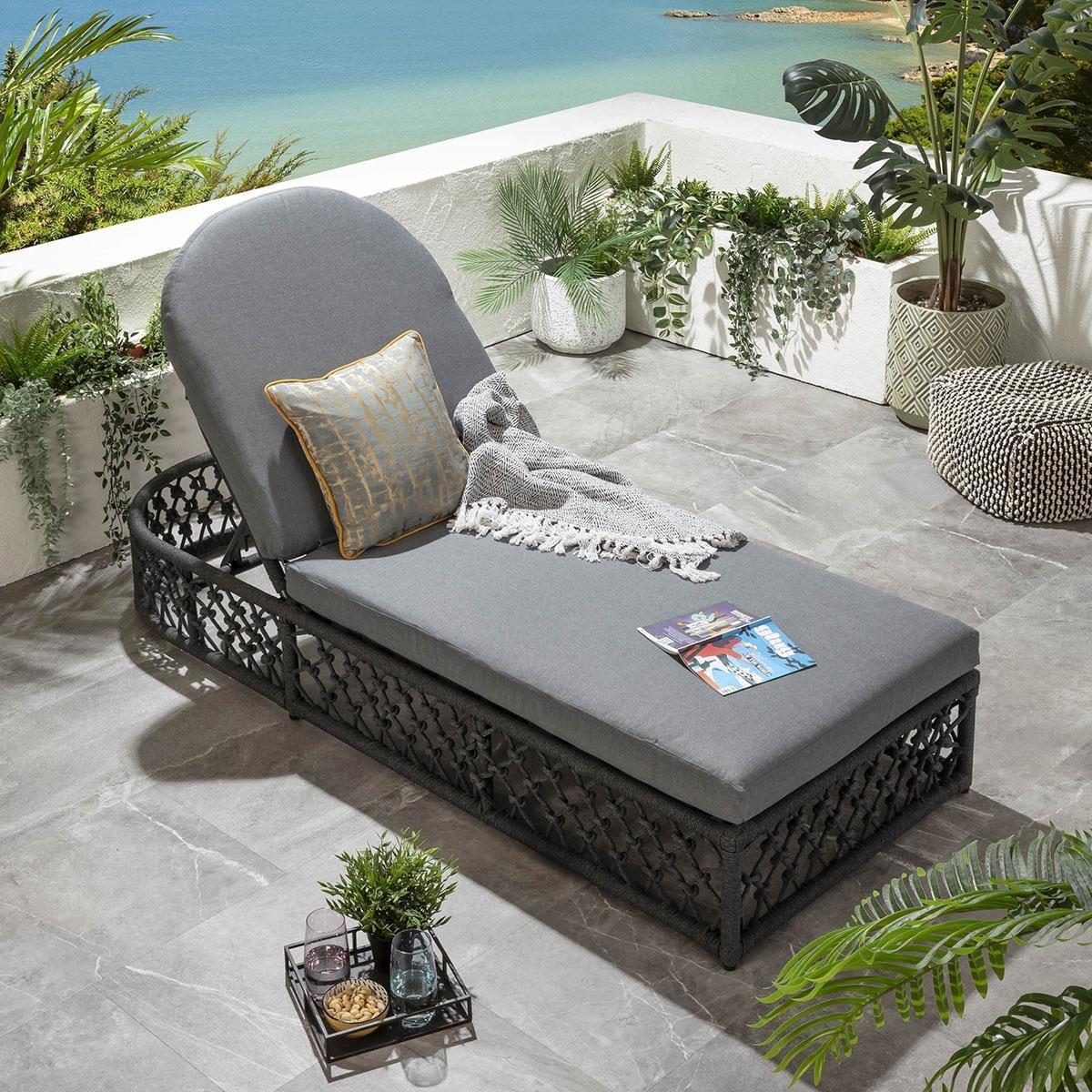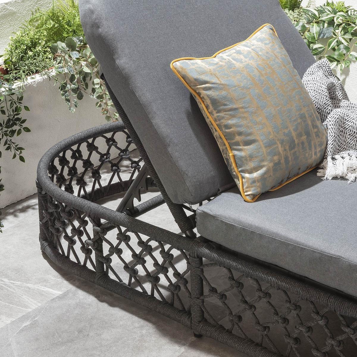 Our premium Amelia garden sun lounger seamlessly blends comfort and style. This outdoor lounger is the embodiment of contemporary relaxation with its artisanal knotted rope design and sleek grey aesthetic. It's built on a weather resistant aluminium frame and arrives fully assembled, ensuring years of enjoyment. Crafted with precision, the aluminium frame of the Amelia sun lounger is exquisitely covered in a knotted rope design, adding a touch of sophistication to your outdoor space. From sunbathing to enjoying a good read, the adjustable backrest can be set at multiple angles, ensuring a truly indulgent experience. Sink into pure luxury with the thick, sumptuous base cushion upholstered in grey fabric. This garden lounger cushion invites you to unwind in ultimate comfort, making it an ideal addition to your outdoor oasis. Experience convenience like never before the Amelia luxury sun lounger requires no assembly, allowing you to enjoy its charm right away. Elevate your outdoor living with our premium furniture collection; pair this garden lounger with our matching garden furniture to create a cohesive and stylish ensemble. W199cm D77cm H27cm Seat Height 37cm Luxury Sun Lounger