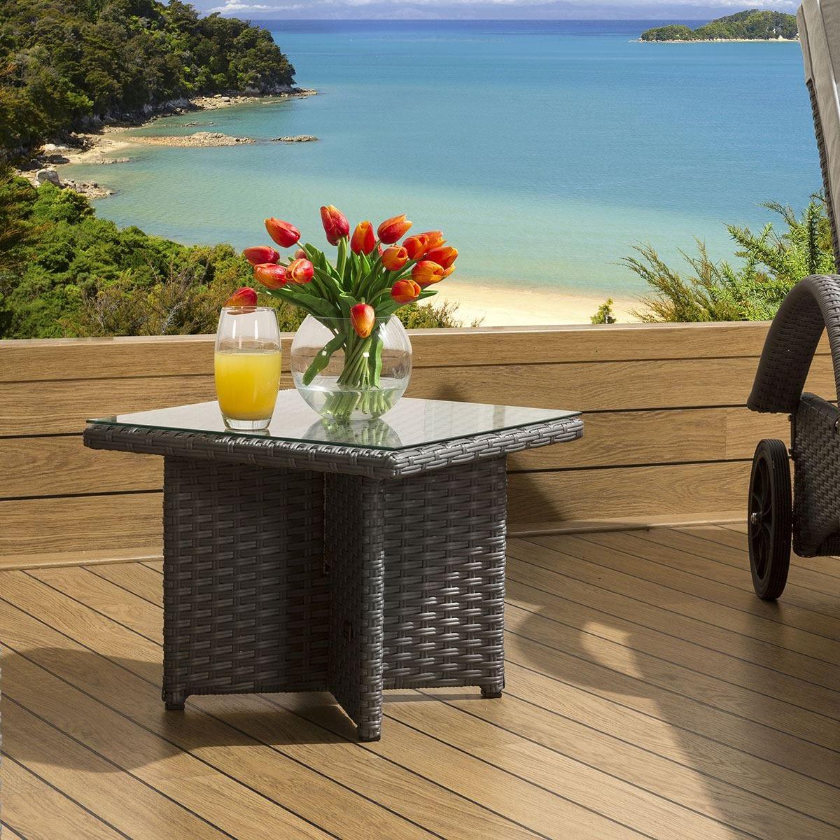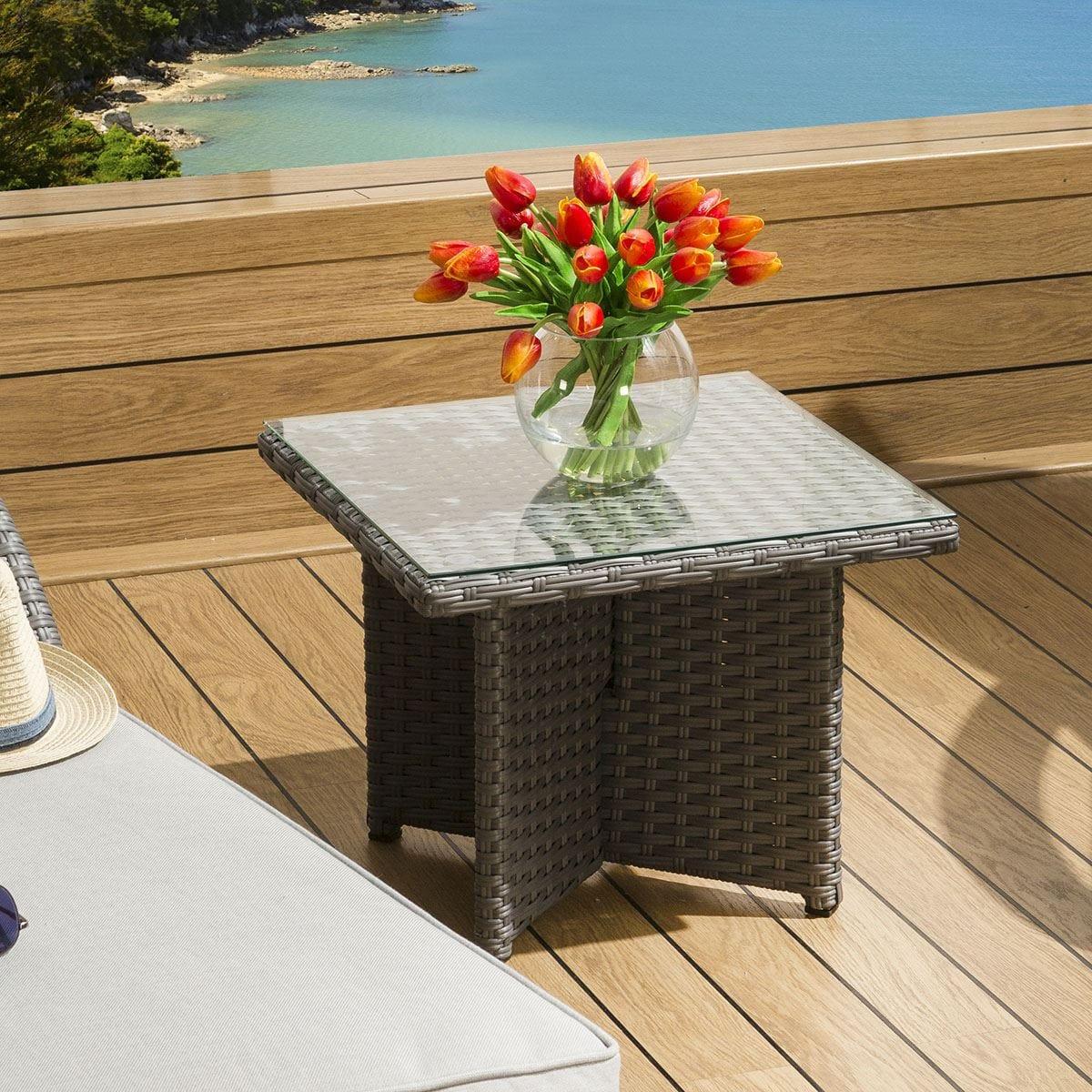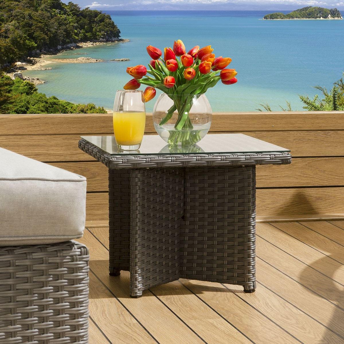 This small end table is an ideal accessory to our loungers, sunbeds, daybeds, hanging chairs etc Made from fully weatherproof PE rattan, hand woven over a rust resistant frame. This maintenance free table is designed to be left outside all year round without the need for covering. The frame is made from 1.2mm thick aluminium tube with grey powder coating applied after welding. Any dust or dirt can be easily washed off with a hose pipe or power washer. It is UV light resistant to ensure that the coloured rattan does not fade in the sunlight. Please do not mistake this for cheaper versions on the market, our quality is the best. Our flat and half round longlife rattan is super durable, our fabric is 0.5mm thick (normal = 0.3mm) and all our items have double stitched cushions, stainless steel labels and high quality covers. Our fabric and Foam in fully compliant with UK Indoor Fire Regulations. W46cm D46cm H36cm Modern Garden Furniture Premium Quality Furniture