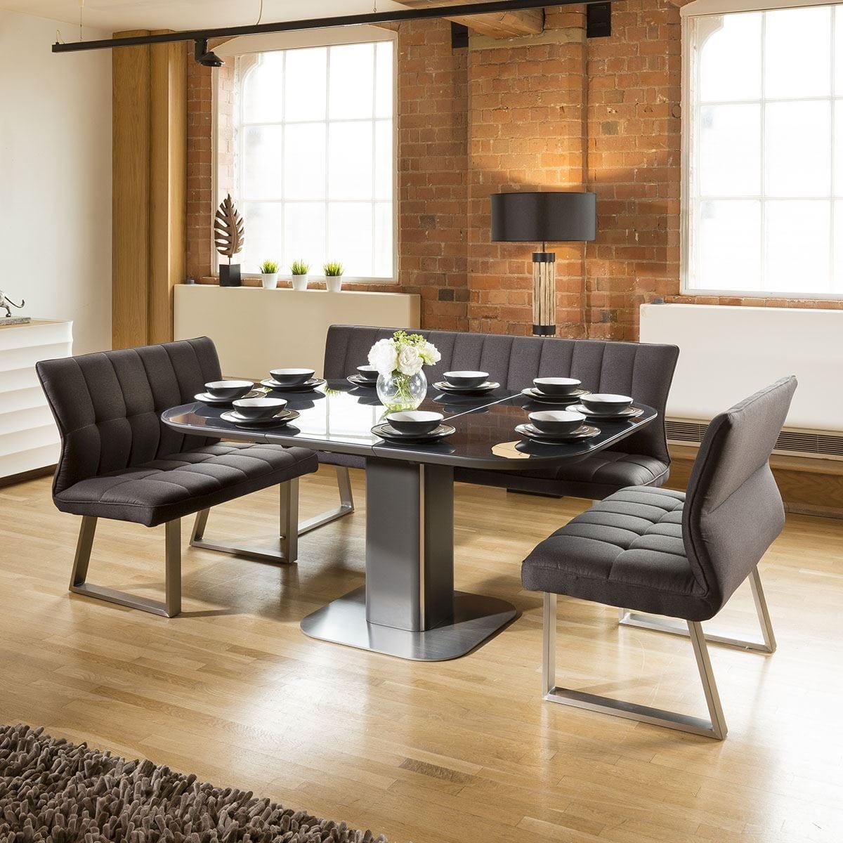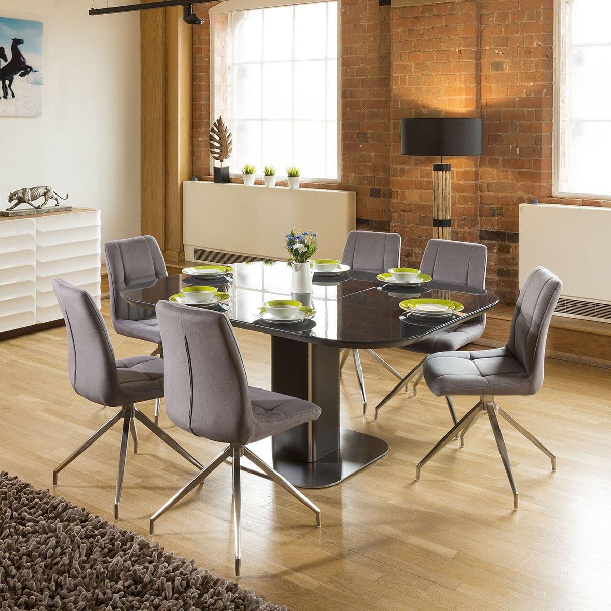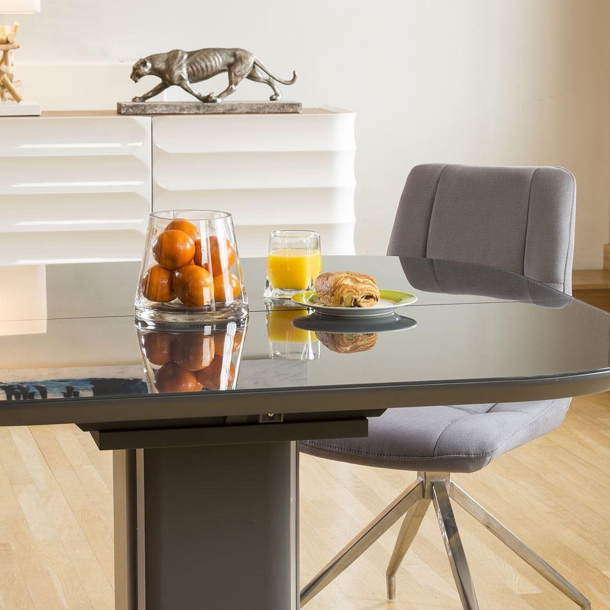 High Quality Extending Square Dining Table with Grey Glass Top, Grey Gloss Stem and Solid Stainless Steel Base. A lovely square dining table extending to rectangular for seating upto 8 people comfortably. Features include brushed Stainless steel base, beautiful deep grey glass top and a smooth one-handed extension mechanism. Very strong and sturdy for a central stem table with chrome feature stripes.