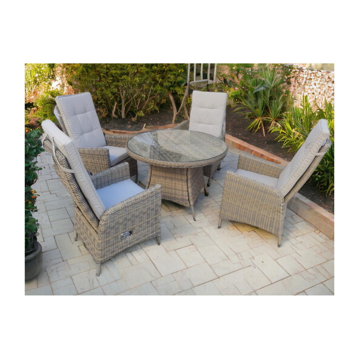 Indulge in the epitome of outdoor luxury with our meticulously crafted 4-seater round dining set. Immerse yourself in the art of outdoor dining as you gather around this stunning ensemble designed for both style and functionality. Crafted from high-quality rattan, this dining set exudes sophistication and durability. The intricately woven rattan brings a touch of timeless elegance to your patio, garden, or deck. The round design fosters a sense of togetherness, making it an ideal choice for intimate gatherings and memorable meals under the open sky. What sets this dining set apart is the thoughtful inclusion of adjustable chairs. Each chair is designed to provide not just a seat, but a personalized haven of comfort. Adjust the angle to your liking and sink into the plush cushions, creating an experience tailored to your relaxation needs. The table, with its sturdy and stylish design, serves as the perfect centerpiece. Whether hosting a brunch, dinner party, or simply enjoying a quiet moment outdoors, this dining set is a statement of both opulence and practicality. Unwind in a setting where every detail has been carefully considered, from the weather-resistant rattan to the premium cushions that resist the elements. This dining set is not just a piece of outdoor furniture, it's an invitation to embrace the finer things in life. Upgrade your outdoor living space with this luxury rattan dining set - a harmonious blend of exquisite design, durability, and the utmost in comfort. Elevate your al fresco dining experience and create lasting memories with those who matter most.