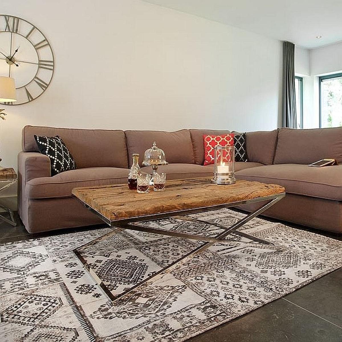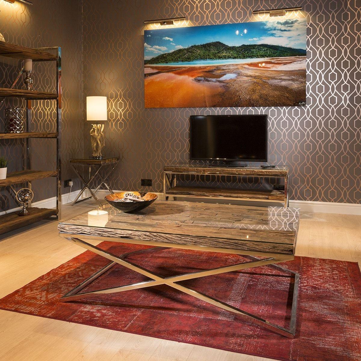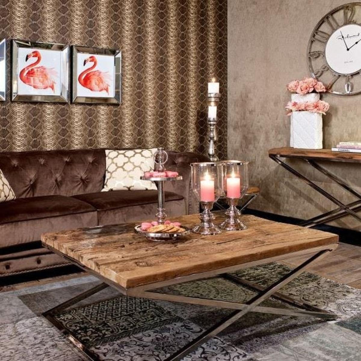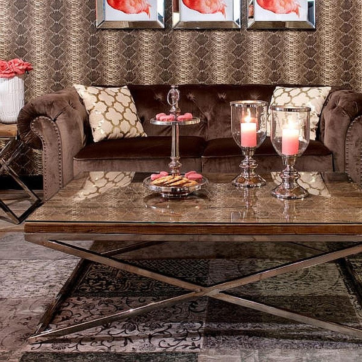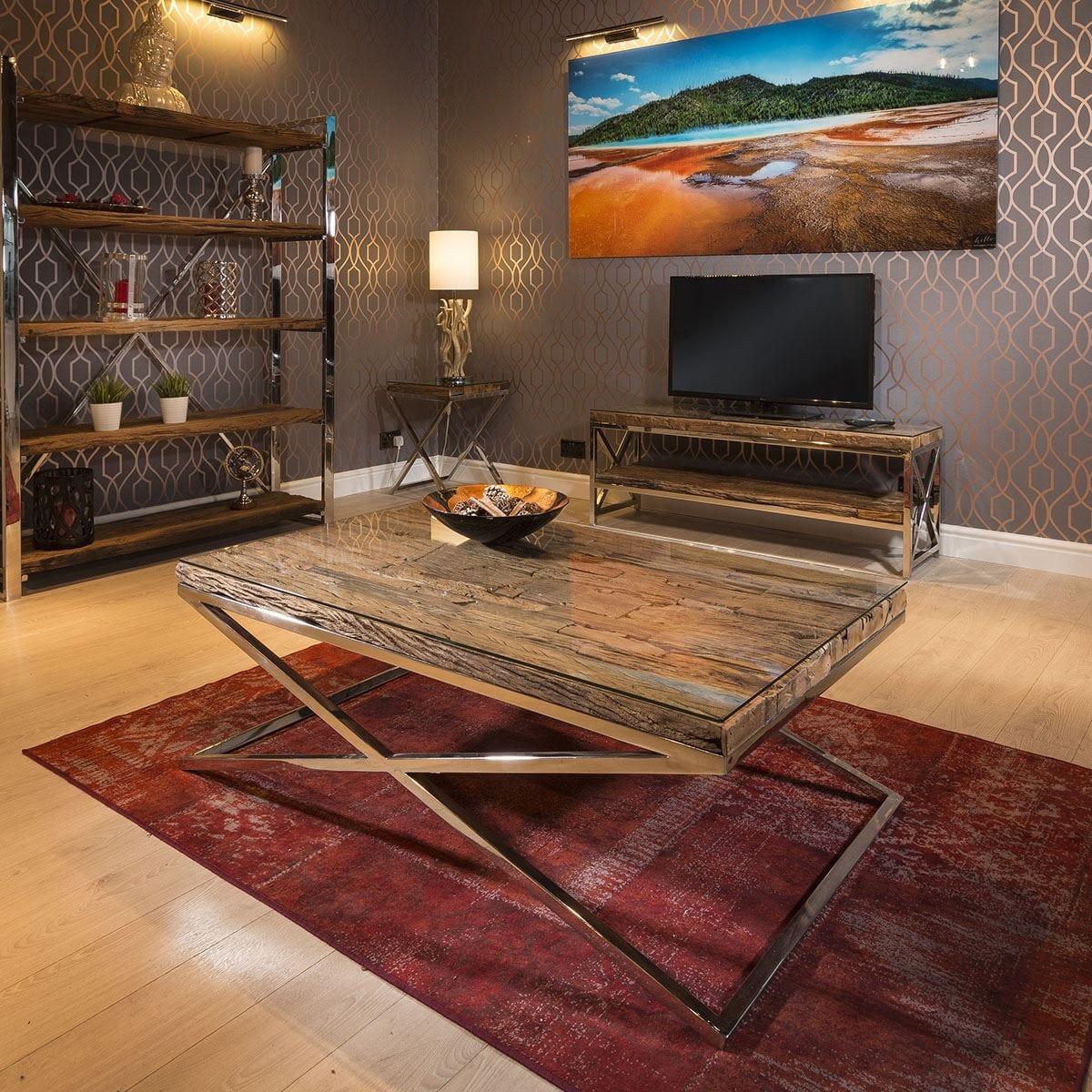 Delightful Glass Topped Large Recycled Hardwood Coffee Table. Stunning mix of 80+ year old wooden pre-used Sal wood planks, bright mirror finish stainless steel legs and clear glass top. The 100% upcycled wood is between 80 and 100 years old and retrieved from used railway sleepers in the Indian sub-continent. All planks are carefully cleaned, treated and selected for strength, longevity and character. Of course the orginal materials will be sympathetically reworked and made into a heavy duty table ready for the next 100 year adventure. This authentic history give each table a beautifully unique character and charm. Expect to see clear signs of its former life with colour variations, cracks, wear etc W130cm D80cm H45cm Reclaimed Wood Top With Glass Polished Metal Base