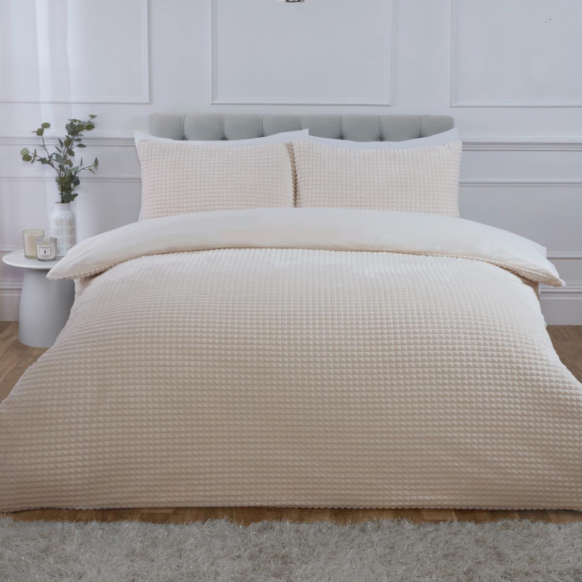 The Luxury Teddy Fleece Waffle Duvet Cover adds classic comfort and texture to your bedroom. Made from super-soft teddy fleece, it features an all-over waffle-knit pattern of recessed squares and raised lines, giving it a cozy, structured look. Available in Cream or Latte, this duvet cover brings warmth and style to any sleep space. The textured design adds depth without using different colours, while the reverse side is a smooth, solid fleece that matches the front. It is a perfect blend of softness, warmth, and timeless design. Measurement Single 1x duvet cover (135x200cm), 1x matching pillowcase (50x75cm)Double 1x duvet cover (200x200cm), 2x matching pillowcases (50x75cm)King 1x duvet cover (230x220cm), 2x matching pillowcases (50x75cm)