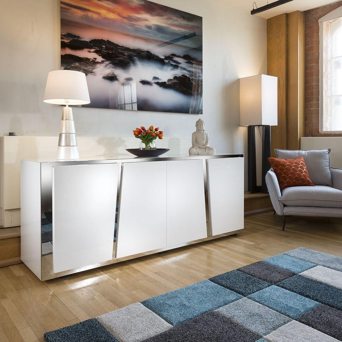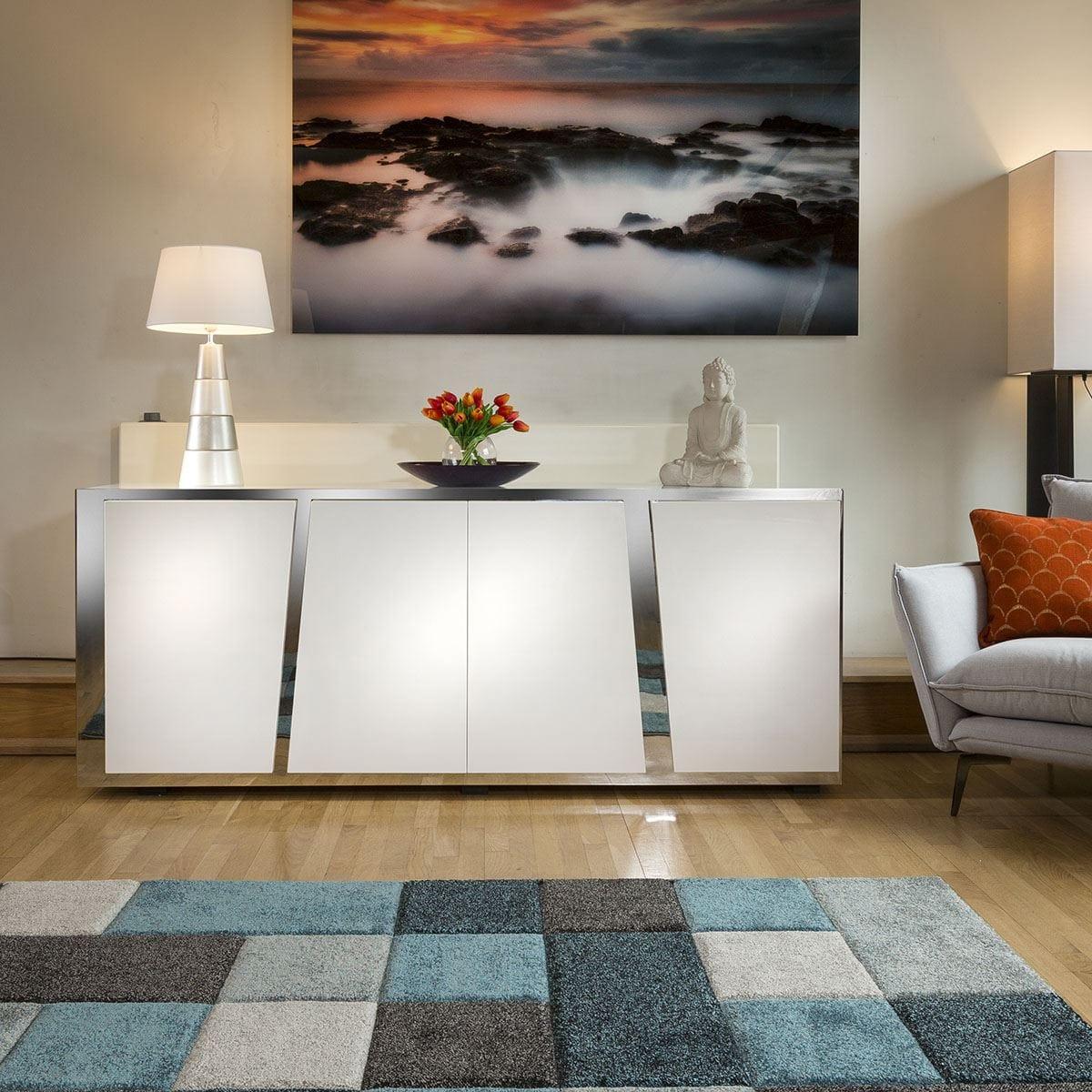Quatropi Design Studios 216. M White Gloss Sideboard / Cabinet With White Glass Top. A Great Addition to any Living Room, Office Or Dinning room. This statement piece will be the talk of your living space with its eye-catching stainless steel base and lush white glass top. Wonderful stunning build quality featuring 4 soft close doors each with a center shelf behind. Beautiful high-class lacquered white wood base gives a truly unique look that's beautifully emphasised the sideboards strong designer look. The Quatropi "V" sideboard ensures an influx of character, style and practicality for your home interior, the perfect piece for larger spaces and contemporary styled homes. W200cm D50cm H81cm High Gloss Finish Fully Assembled