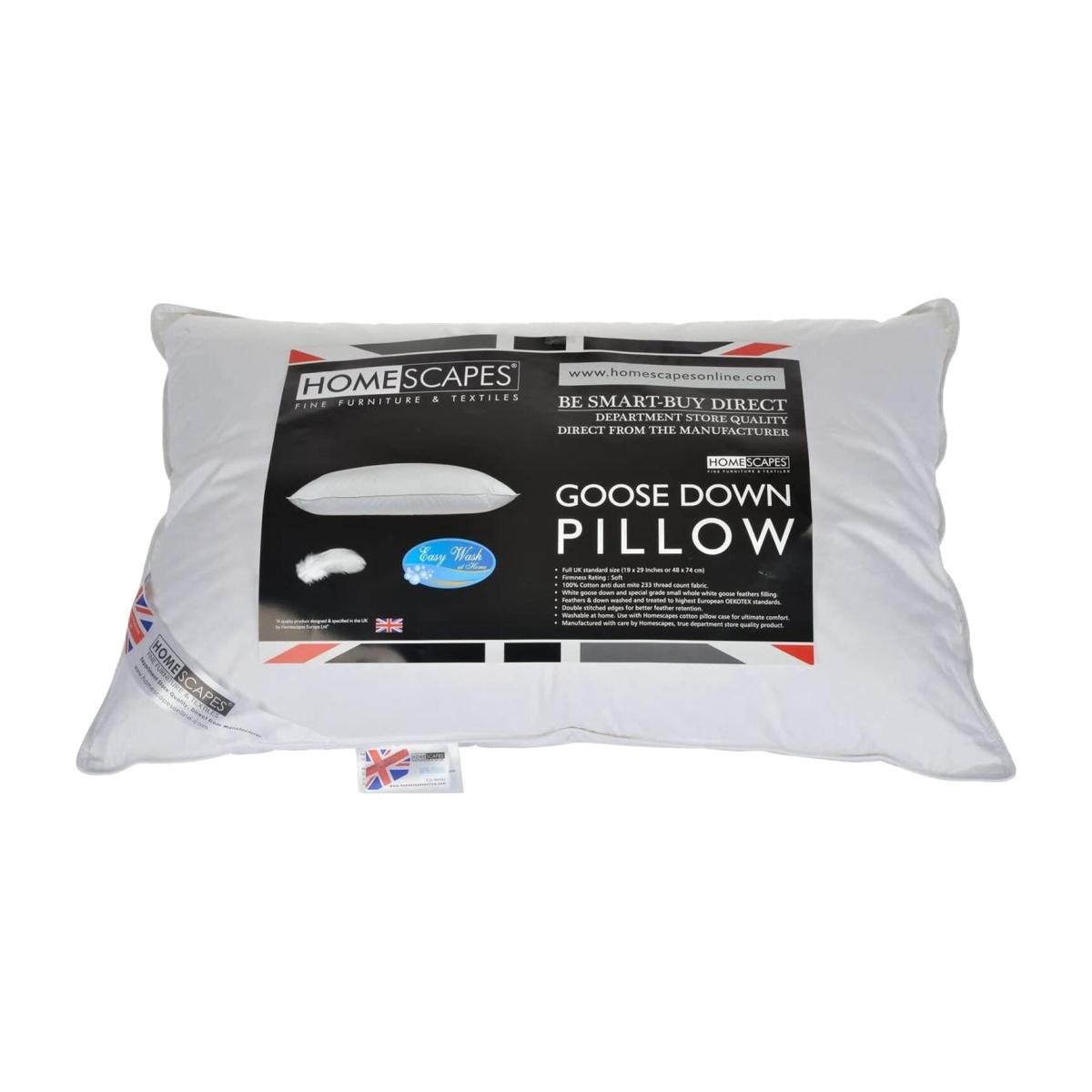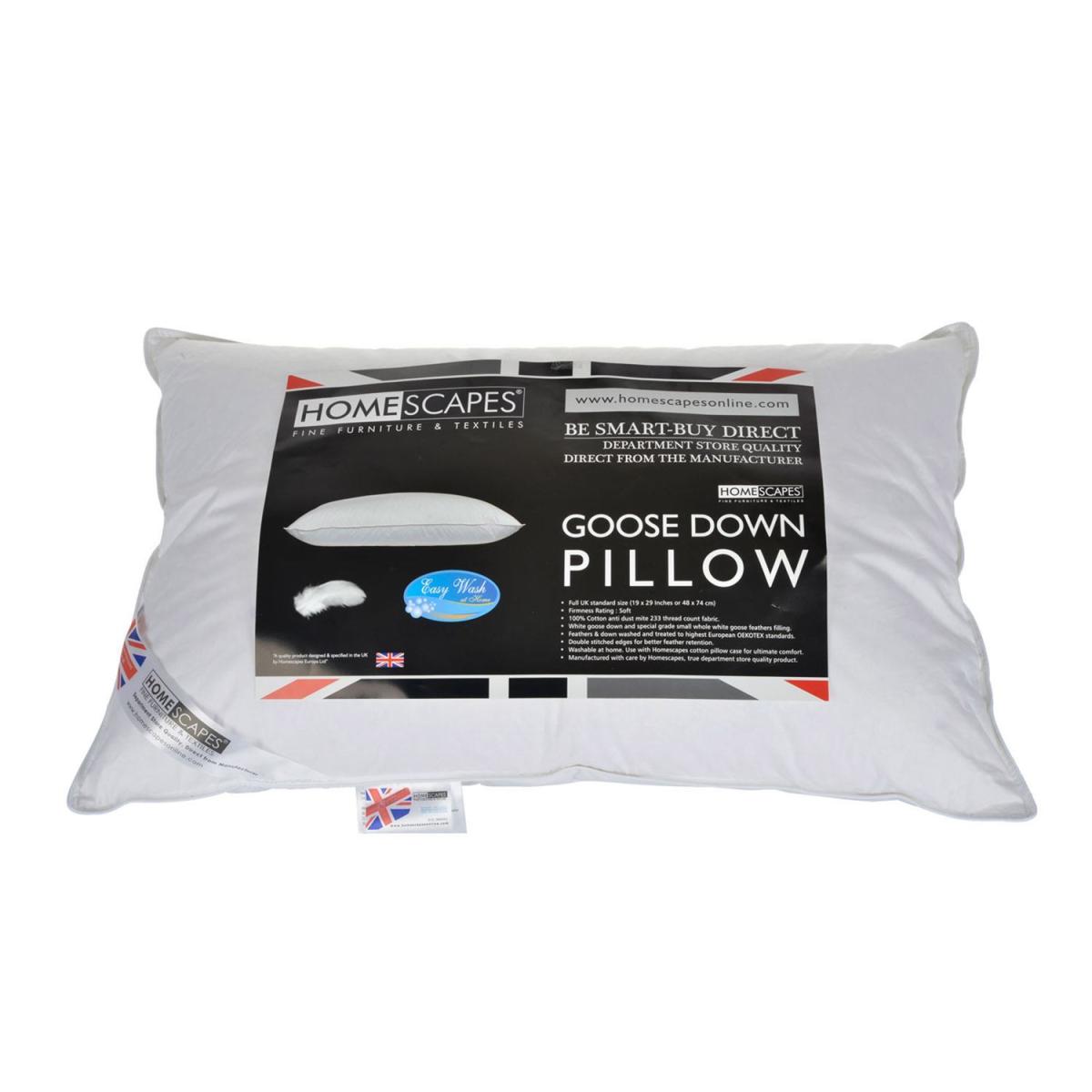 Snuggle up with the sumptuously soft Goose Down Pillow from the Homescapes range of specialist pillows. With a luxuriously high down volume, this pillow is filled with predominantly down feathers, which are perfectly balanced with small feathers of the highest grade to provide optimum support, softness and plumpness. Our goose-down pillow features a 100 cotton outer, boasting a remarkably high 233 thread count with anti-dust mite, and hypoallergenic properties, making our pillows great for those who suffer from dust mite allergies or asthma. The dense, down-proof cotton casing also features twin stitched edges to ensure that the fluffy filling stays exactly where it should in your pillow. Down is the fine, fluffy feather fibre that comes from the breast of the goose and offers exceptionally soft comfort with very little weight.