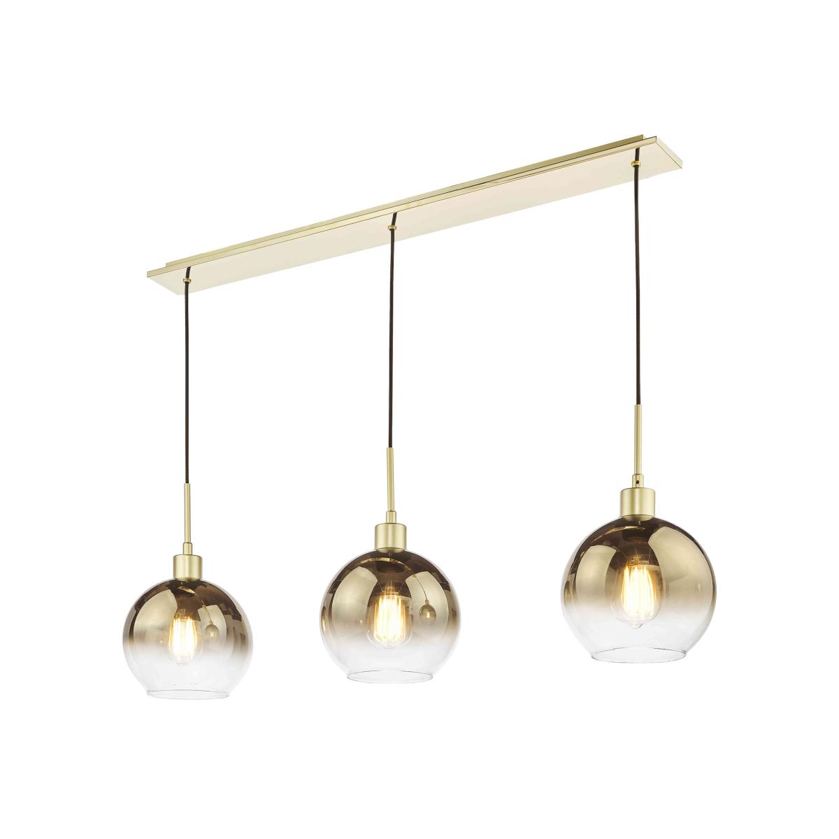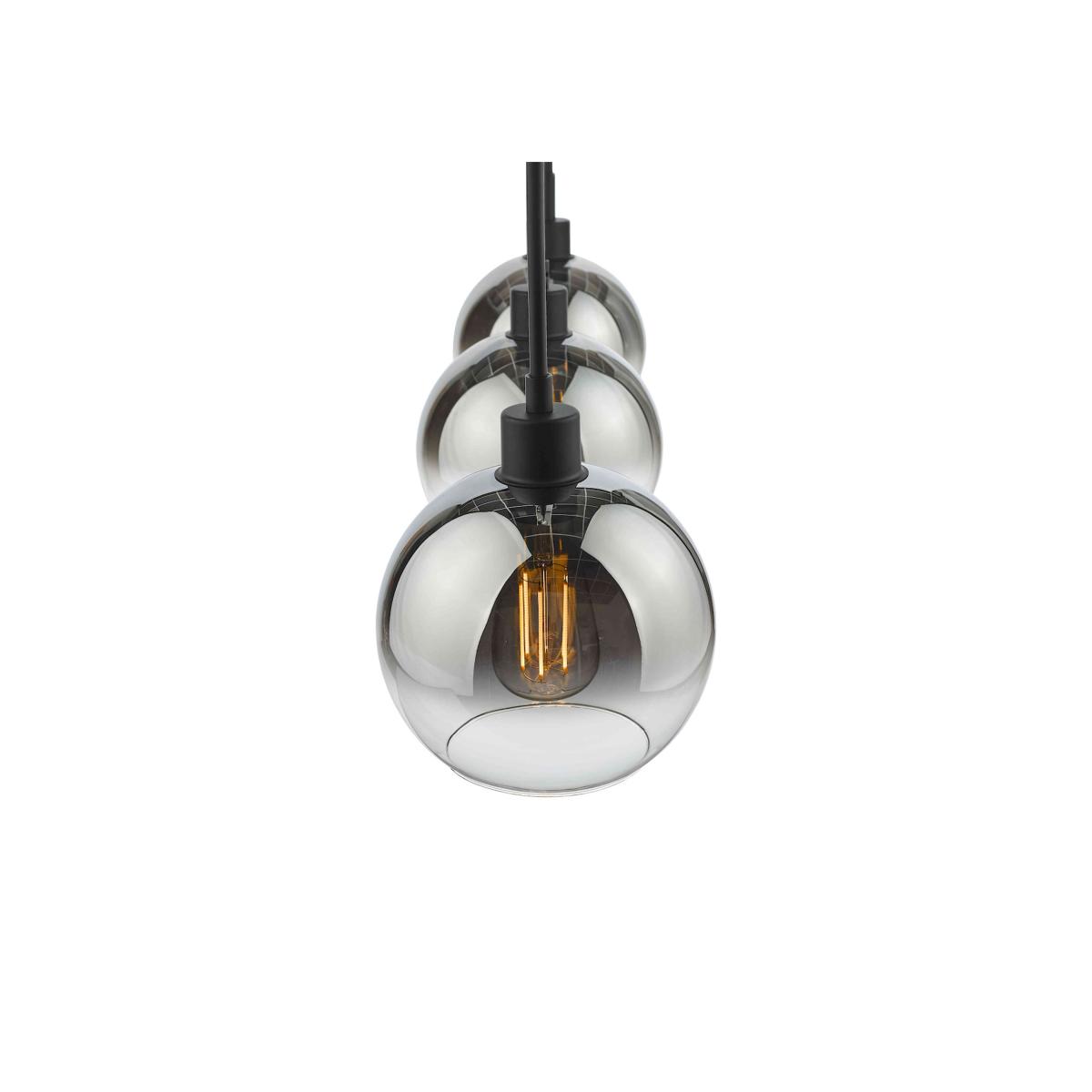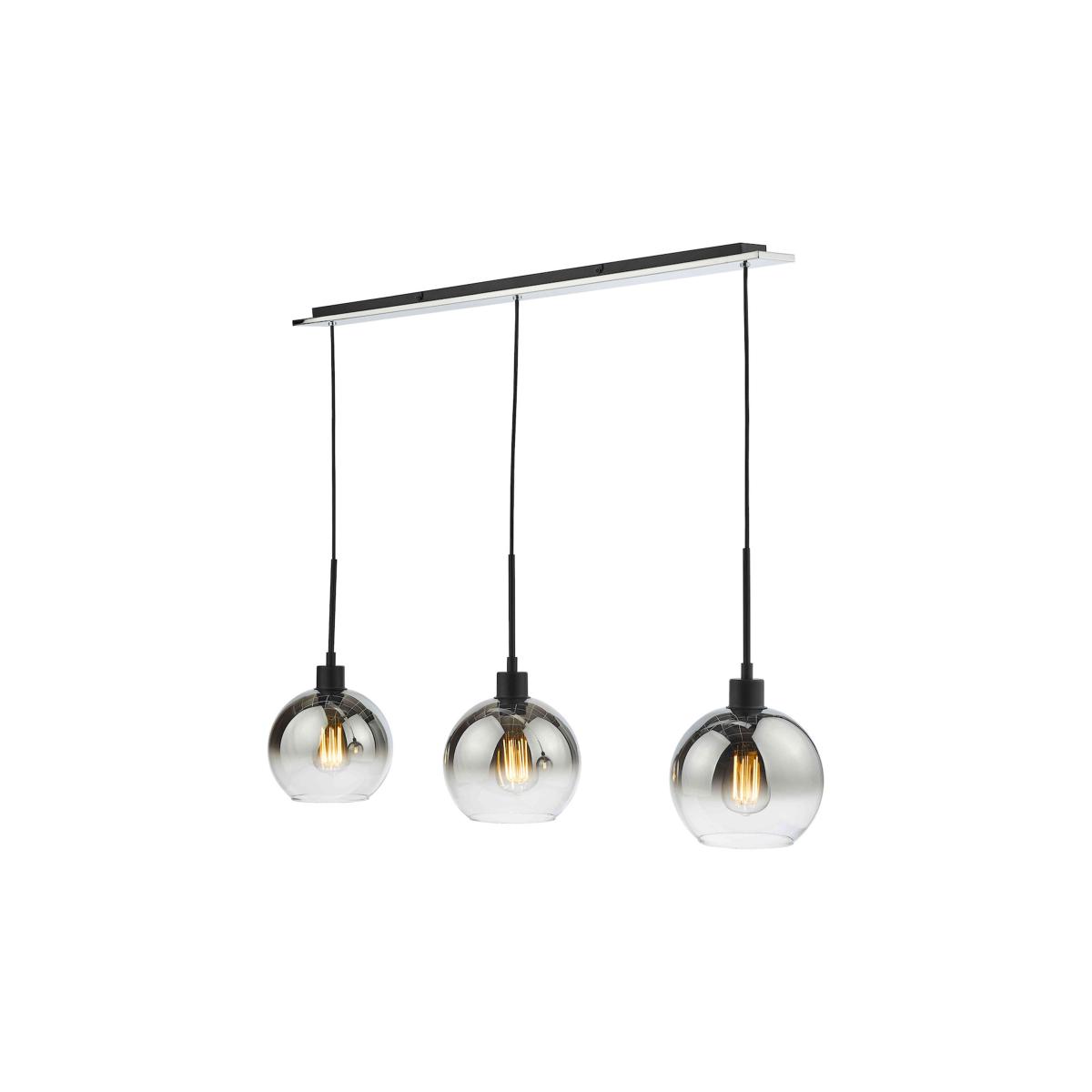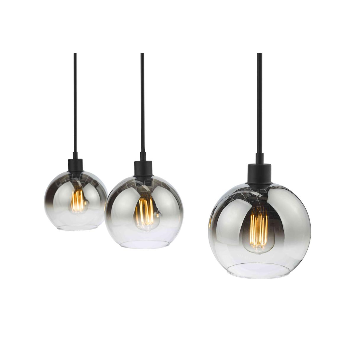 Perfect over a kitchen island or counter or even a dining table, this versatile three-light bar pendant light is the definition of contemporary cool. Why you'll love it Contemporary and stylish, this bar pendant elevates any kitchen diner. Cool urban style. Composed of 3 ombre-effect, mirrored glass globes with black fittings. Each globe is suspended from a black cable. Rectangular mirrored ceiling plate with black detail. Cables are height-adjustable on installation. This bar pendant light is part of the Furniture Village lighting collection. What you need to know Metal base and shade. Cables have a maximum drop of 135 cm. Requires 3 x E27 ES max. 40W bulbs (not included). Professional installation recommended. Ceiling plate dimensions Depth: 3 cm (1 in). Width: 90 cm (35 in). Shade dimensions Height: 17 cm (7 in). Diameter: 20 cm (8 in).