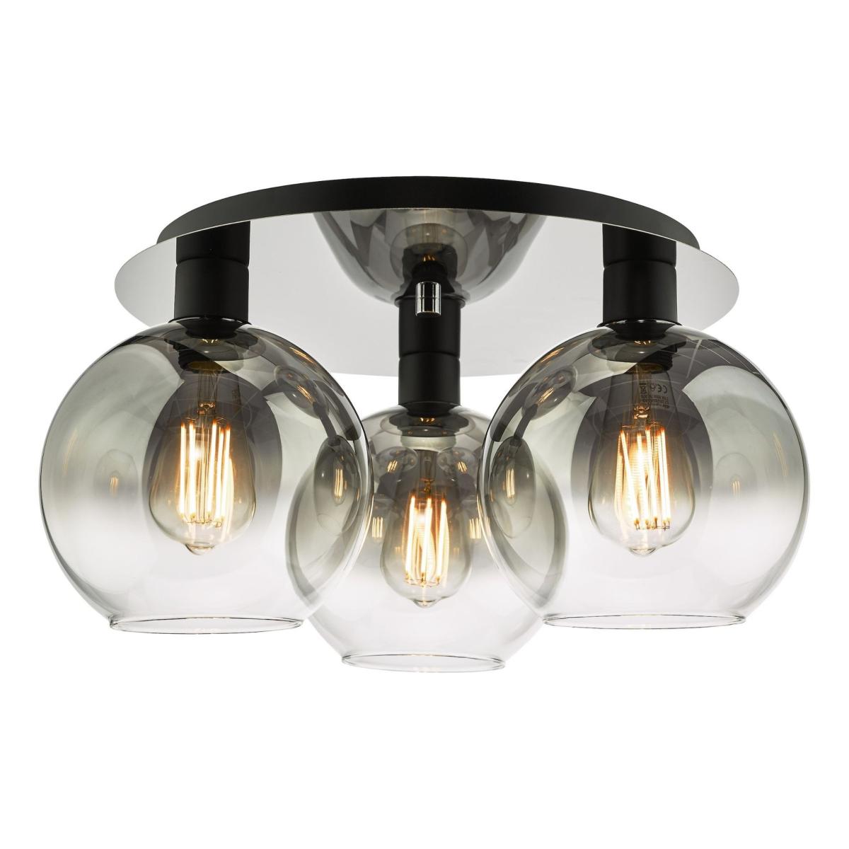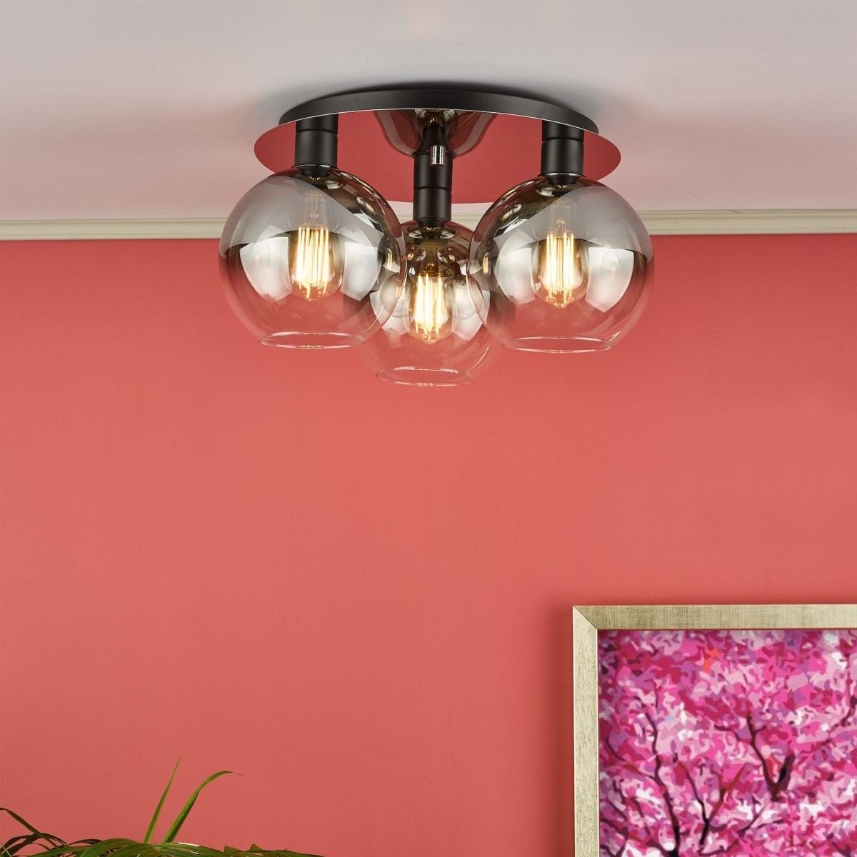 Lycia 3-light flush ceiling light, featuring mirrored, ombre smoked glass globe shades and a mirrored ceiling fixture with matte black detailing. Make a bold statement with the Lycia 3-light flush ceiling light, a perfect blend of modern elegance and understated sophistication. This striking fixture features three ombre smoked glass globe shades with a highly mirrored finish, creating a mesmerising gradient effect that diffuses light beautifully throughout the room. The mirrored ceiling fixture is complemented by matte black detailing, adding a sleek and contemporary touch to its design. Ideal for low ceilings or spaces needing a stylish yet functional lighting solution, the Lycia light enhances any room with its dramatic aesthetic and warm, ambient glow. Whether in a living area, bedroom or hallway, it serves as both a practical light source and an eye-catching decor element. Lycia 3-light flush ceiling light, featuring mirrored, ombre smoked glass globe shades and a mirrored ceiling fixture with matte black detailing. Make a bold statement with the Lycia 3-light flush ceiling light, a perfect blend of modern elegance and understated sophistication. This striking fixture features three ombre smoked glass globe shades with a highly mirrored finish, creating a mesmerising gradient effect that diffuses light beautifully throughout the room. The mirrored ceiling fixture is complemented by matte black detailing, adding a sleek and contemporary touch to its design. Ideal for low ceilings or spaces needing a stylish yet functional lighting solution, the Lycia light enhances any room with its dramatic aesthetic and warm, ambient glow. Whether in a living area, bedroom or hallway, it serves as both a practical light source and an eye-catching decor element.