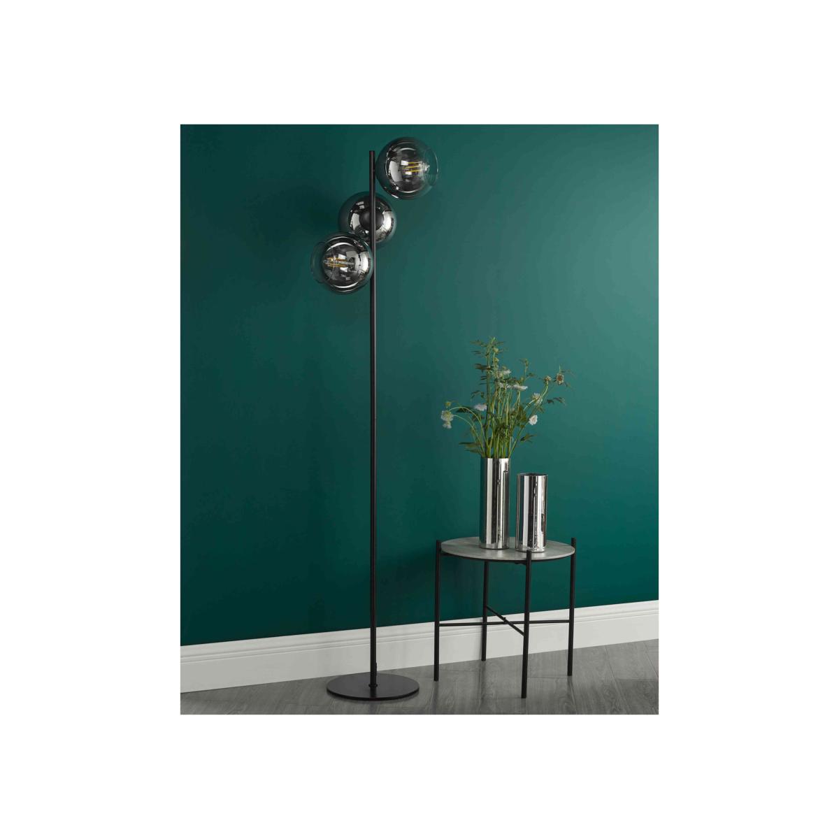 With smoked glass light shades and a matt black metal stand, our Lycia three-light floor lamp offers a fabulous fusion of cool urban finishes. Why you'll love it This 3-light floor lamp epitomises creative modern lighting design. Tall and elegant with a high-end industrial feel. With 3 ombre smoked-glass shades. Contemporary matt black stand and plinth. This floor lamp is part of the Furniture Village lighting collection. What you need to know Steel base, glass shades. Supplied with 143 cm cable. Requires 3 x E27 max. 40 W bulbs (not included). Please do not exceed this wattage. To clean, wipe gently with a clean soft cloth. Be sure to disconnect from the power outlet before cleaning. Dimensions Height: 176 cm (69 in). Diameter: 40 cm (16 in).