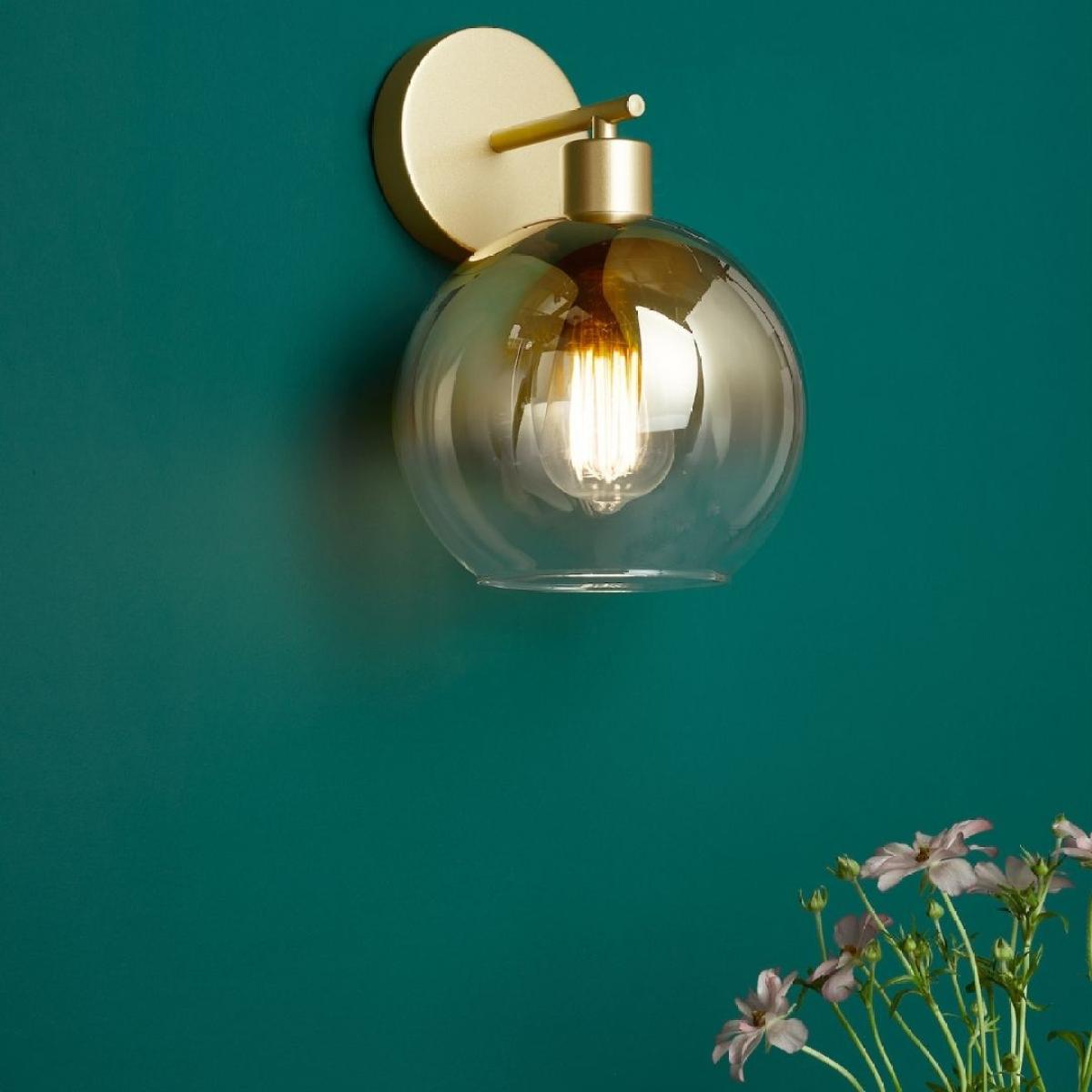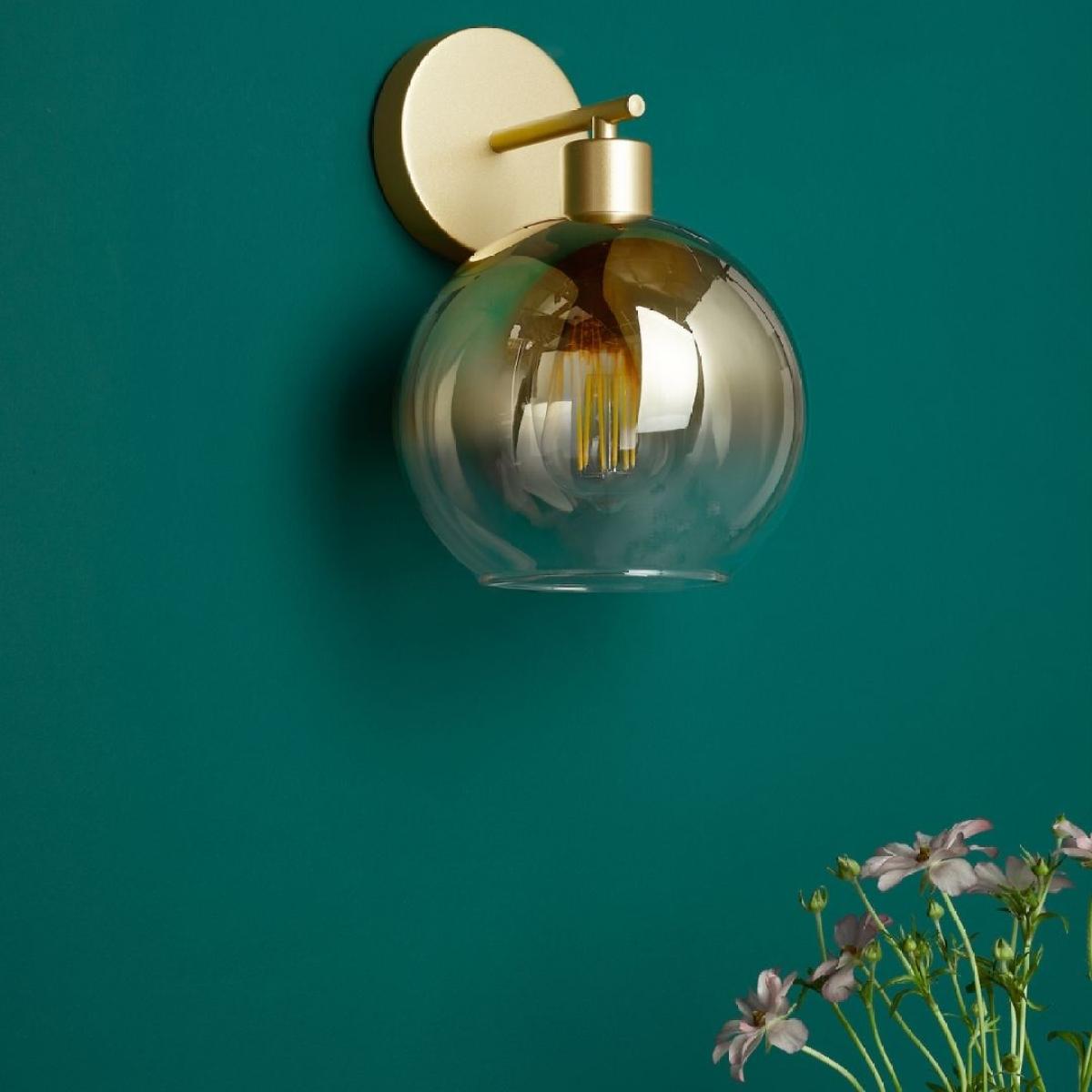 Lycia wall light with satin gold finish and ombre glass globe shade. Lycia wall light with satin gold finish and ombre glass globe shade.