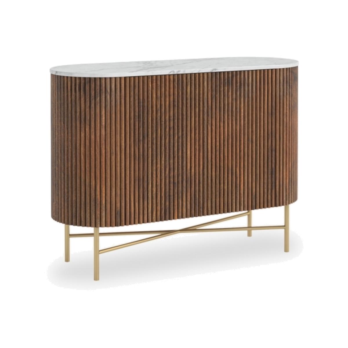 Luxe design, modern accents, and bang-on-trend, that's the Lydford collection. This sideboard is made from a walnut stained mango wood base with a soft detailed ribbed design and brass metal legs, complete with a white marble top. Storing away clutter has never felt so stylish. The Lydford Range is made from highly sustainable mango wood and natural material, marble. Both materials are highly durable and part of our Cult Eco Edit. View The Lydford Range Top Base Material: Marble, Mango Wood Leg Material: Metal Additional Features: 1 Shelf Assembly: No Assembly Required Care:Wipe clean with a dry cloth Note: Each piece of marble furniture will vary in texture, pattern, colour and veining. All these differences are part of what makes this material unique and beautiful. Dimensions Total Size: H 80 x W 105 x D 40cm Weight: 35kg Packing Dimensions: 48 x 111 x 86cm Storage Dimensions Shelf Size: H 50 x W 96 x D 36cm. Buy your Lydford Sideboard, White Marble & Walnut from a wide range of Furniture