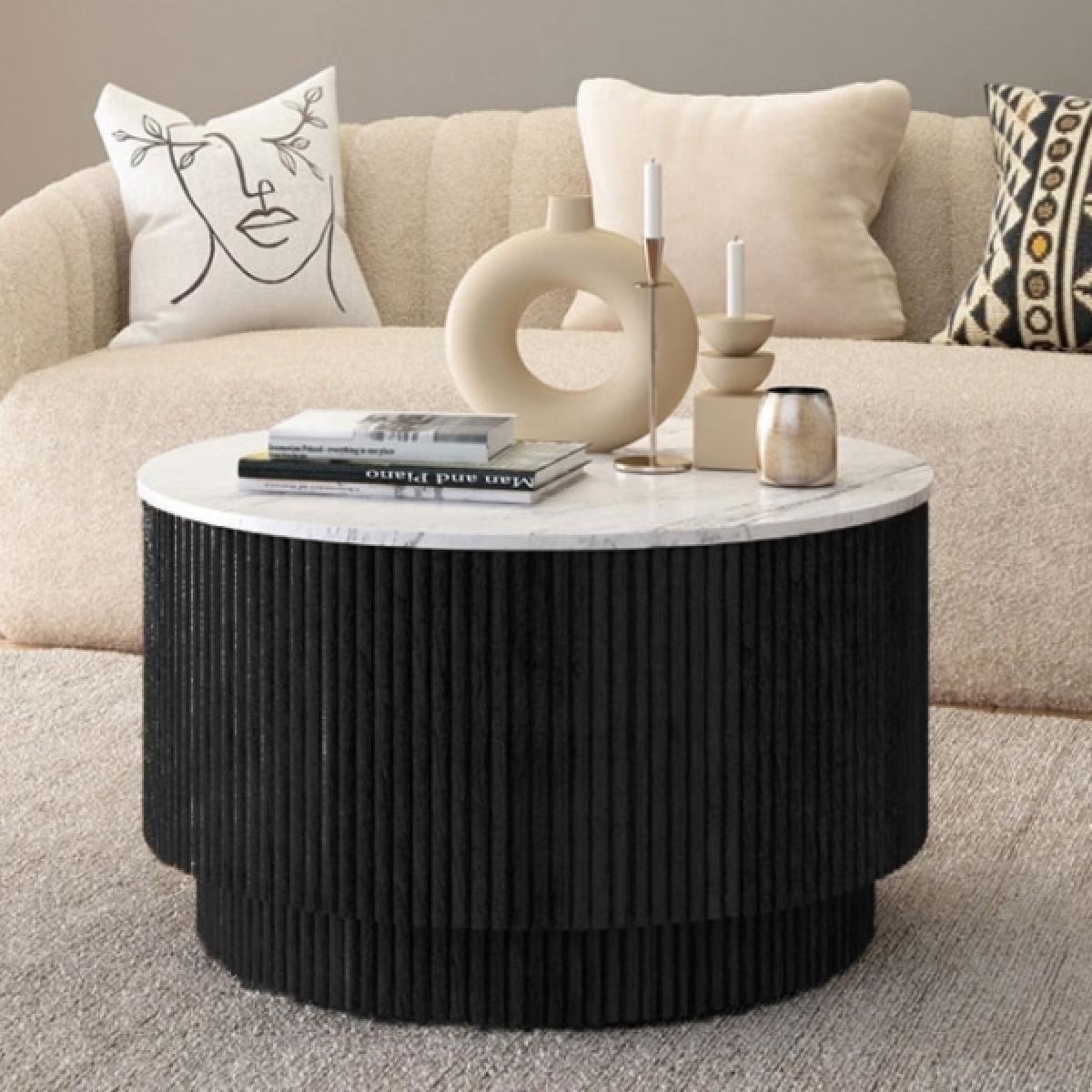 Luxe design, modern accents, and refined style, that's the Lydford collection. This minimaluxe coffee table has a seamless contemporary design that will elevate any interior. We love the soft ribbed detailing and indented base with the black-stained mango wood to give the Lydford coffee table a contemporary feel against the solid white marble top with grey veining. With sleek hidden cupboard to hide away any living room clutter. The Lydford Range is made from highly sustainable mango wood and natural material, marble. Both materials are highly durable and part of our Cult Eco Edit. Each piece of marble furniture will vary in texture, pattern, colour and veining. All these differences are part of what makes this material unique and beautiful. View The Lydford Range Table Top Material:Marble Leg Material: Mango Wood Assembly: No Assembly Required Care:Wipe clean with a dry cloth Note: Each piece of marble furniture will vary in texture, pattern, colour and veining. All these differences are part of what makes this material unique and beautiful. Dimensions Total Size: H 45 x W 80 x D 80cm Weight: 46kg Packing Dimensions: 86 x 86 x 53cm. Buy your Lydford Storage Round Coffee Table, White Marble & Black from a wide range of Furniture, Tables, Kitchen & Dining Room Tables