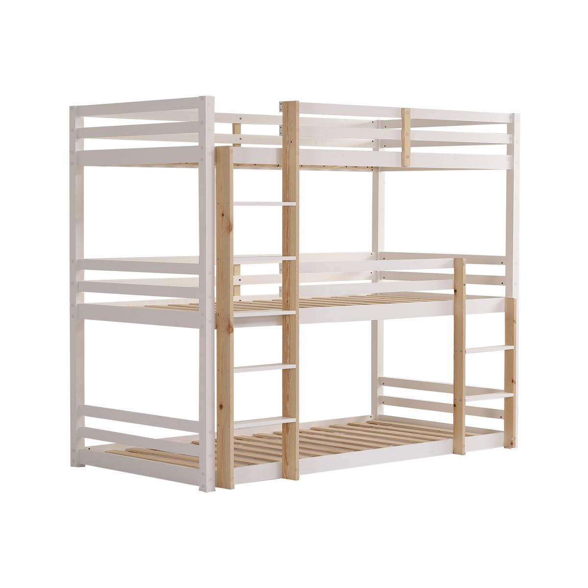 I’m a fan of this three-tier bunk for its clever use of vertical space - it’s ideal for playrooms or shared kids’ bedrooms where floor area is tight. The clean white finish and natural timber accents slot straight into Scandi-inspired or modern minimalist schemes, and it’s easy to layer in soft greys and pastels on bedding to keep the look fresh. For practical styling, use slim under-bed baskets on the bottom tier for toys or laundry, and add a ladder-mounted hanging rail for bedside books or a cool reading lamp. A row of wall hooks beside the bed makes storing bags or jackets simple, while floating shelves above the top bunk give each child a little display spot without cluttering the floor.