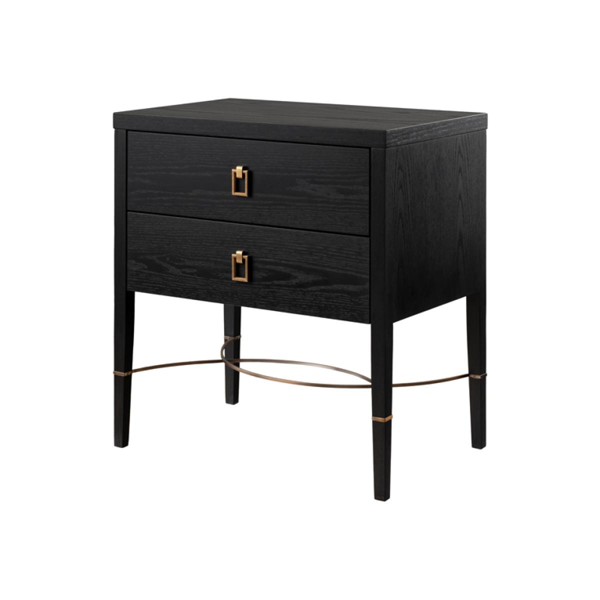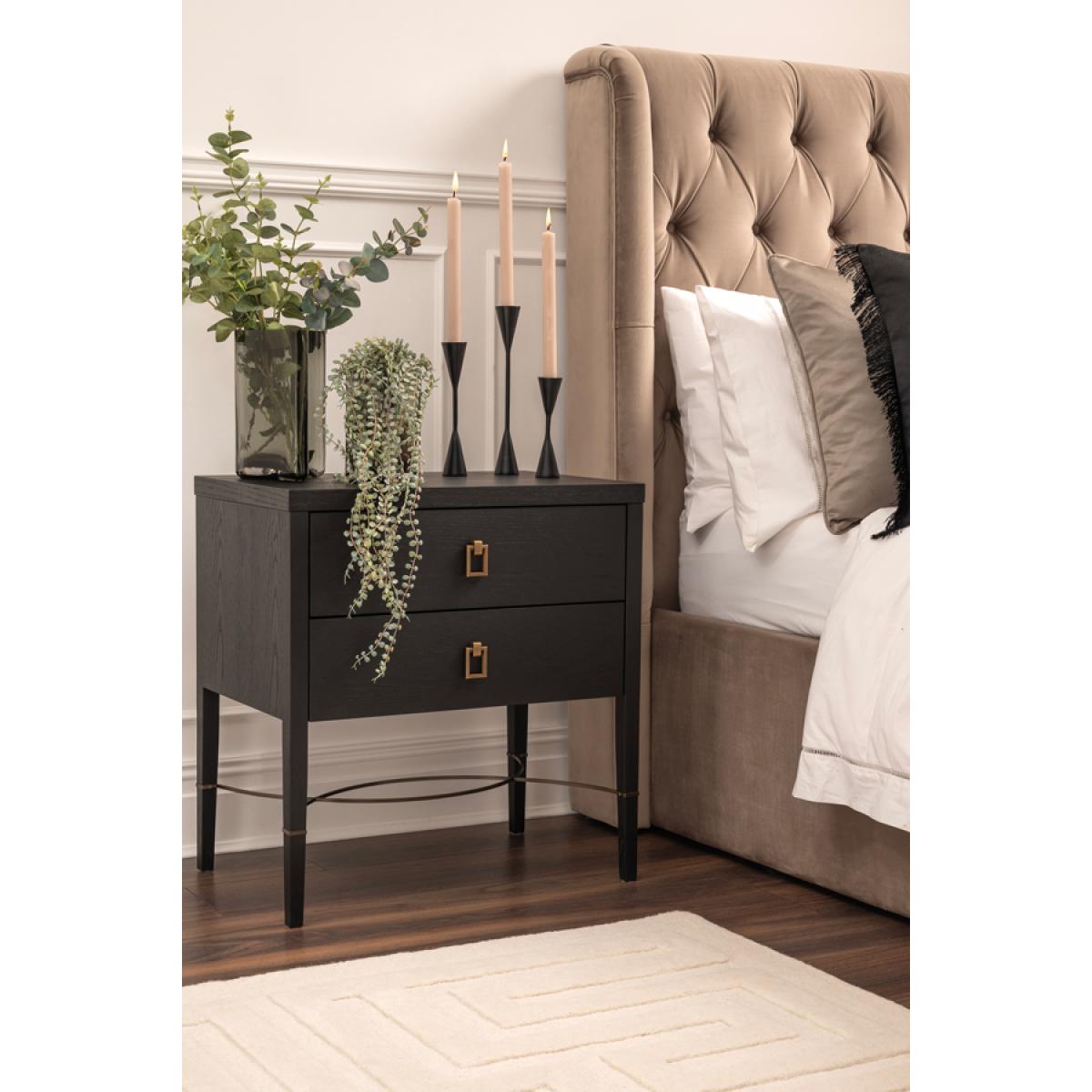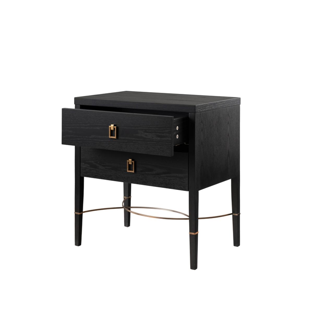An elegant, classic bedside table. Featuring delicate stainless steel detailing with a brushed bronze finish. Solid wood body with a charcoal black veneer. Timeless stainless steel handles with a brushed bronze finish. Two drawers with soft-close drawer runners. Supplied fully assembled.