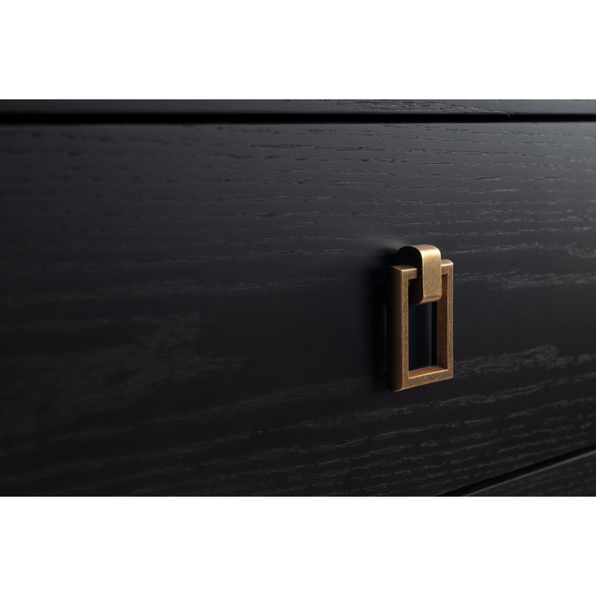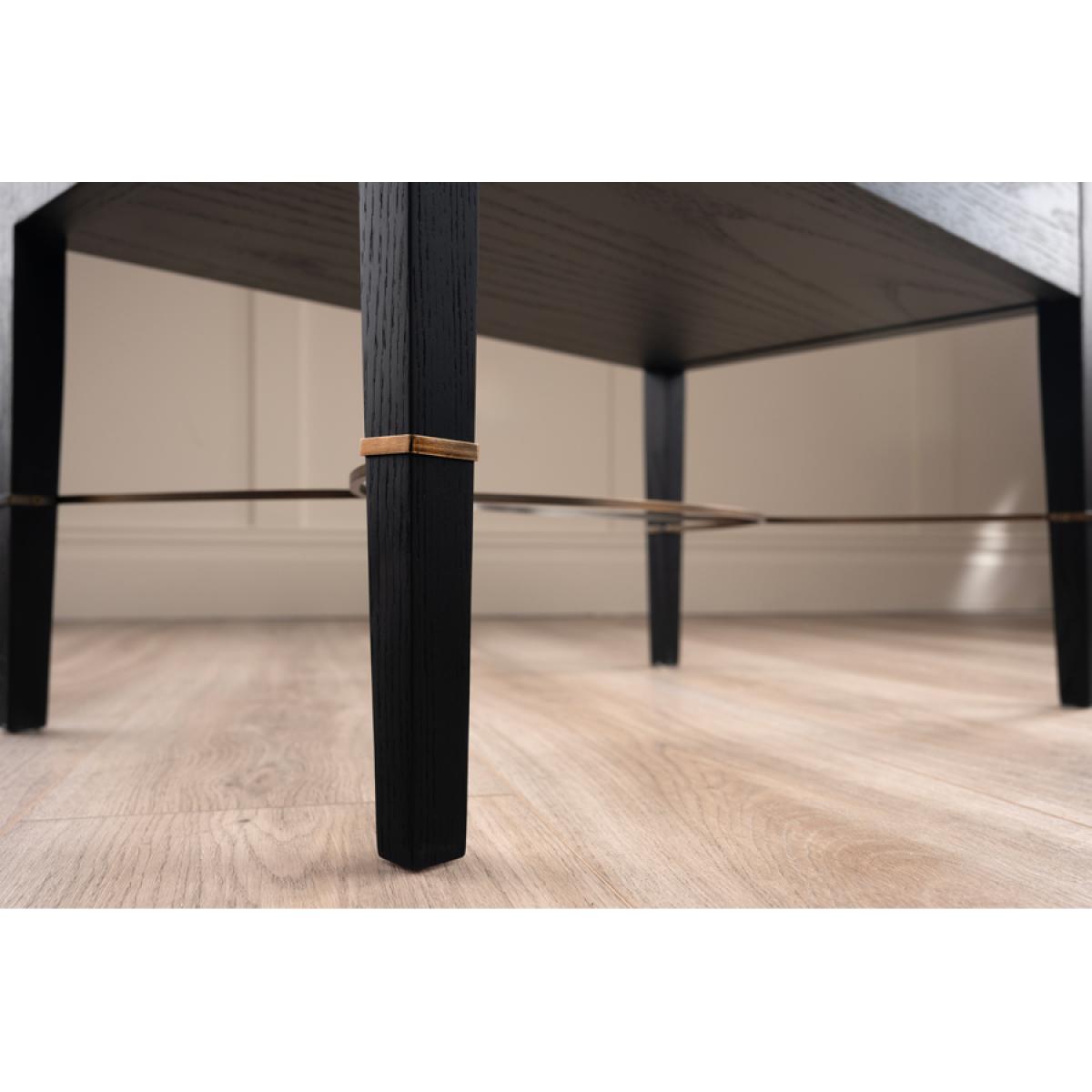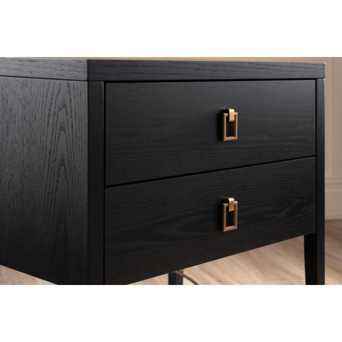 An elegant, classic bedside table. Featuring delicate stainless steel detailing with a brushed bronze finish. Solid wood body with a charcoal black veneer. Timeless stainless steel handles with a brushed bronze finish. Two drawers with soft-close drawer runners. Supplied fully assembled.