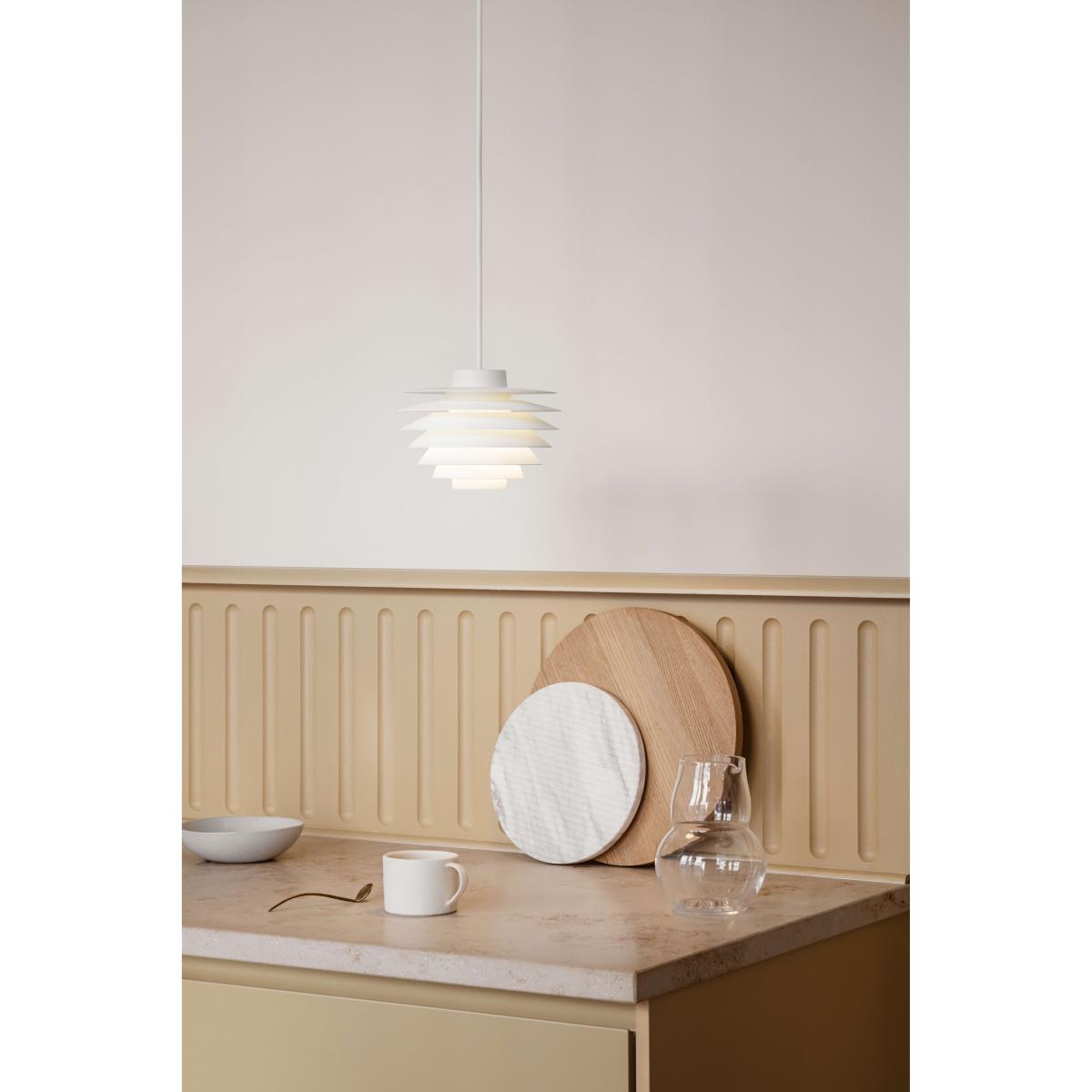 I love this pendant for its sleek, modern silhouette and versatile white finish, making it a great addition to contemporary or Scandinavian-inspired interiors. It works particularly well over dining tables, kitchen islands, or in open-plan living spaces where you want to add a statement piece without overwhelming the room. Practical styling tips include pairing it with similarly minimalist furniture for a cohesive look, or layering with other lighting elements like wall lamps or table lights for a balanced, functional lighting scheme. Its clean design also means it can effortlessly slot into different colour palettes and interior styles, making it a flexible choice for a range of projects.