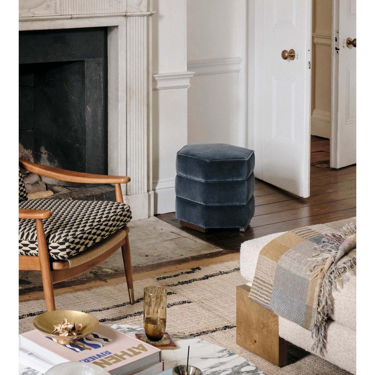 I love this footstool for its sleek, contemporary look and versatile colour. The grey blue velvet adds a touch of softness and sophistication, making it a great accent piece in both modern and transitional interiors. It’s perfect for complementing neutral palettes or adding a subtle pop of colour to more eclectic schemes. Its compact size makes it ideal for use as a footrest, extra seating, or even a side table when topped with a tray. To style it effectively, consider pairing it with other plush textiles or layered with natural textures like wood or wicker to bring warmth and balance to a room. It’s also practical in smaller spaces or as part of a cosy corner, blending functionality with style effortlessly.